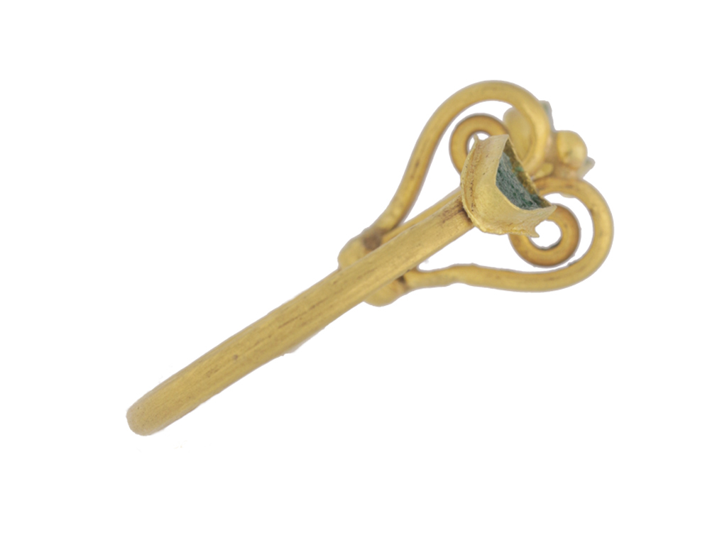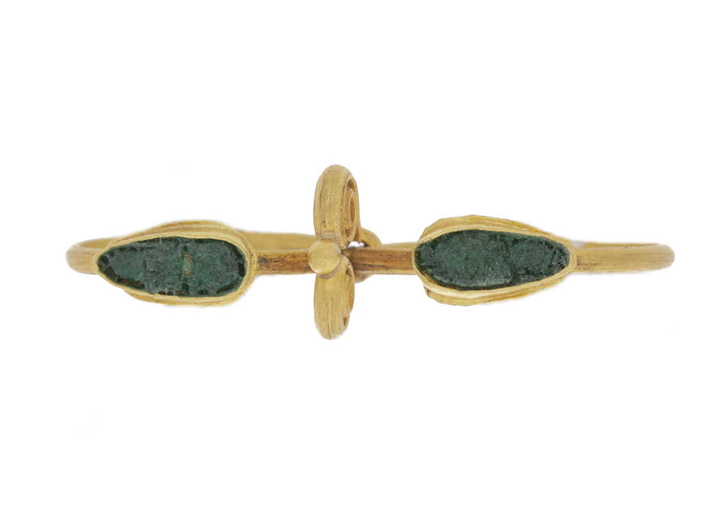 Ancient Roman twin ring set with glass. An unusual and rare ring composed of a pair of D-shape finger hoops, each set to top with a horizontal drop shape collet with green glass inlay, joined together by a decorative double wire scroll and gold granule to top. Tested yellow gold, approximately 6.19 grams in weight, circa 1st-2nd century AD. For a further example of a double-hoop ring, see item 223 in Ruseva-Slokoska, L. 'Roman Jewellery', Sofia, 1991. Approximate ring size M and U.