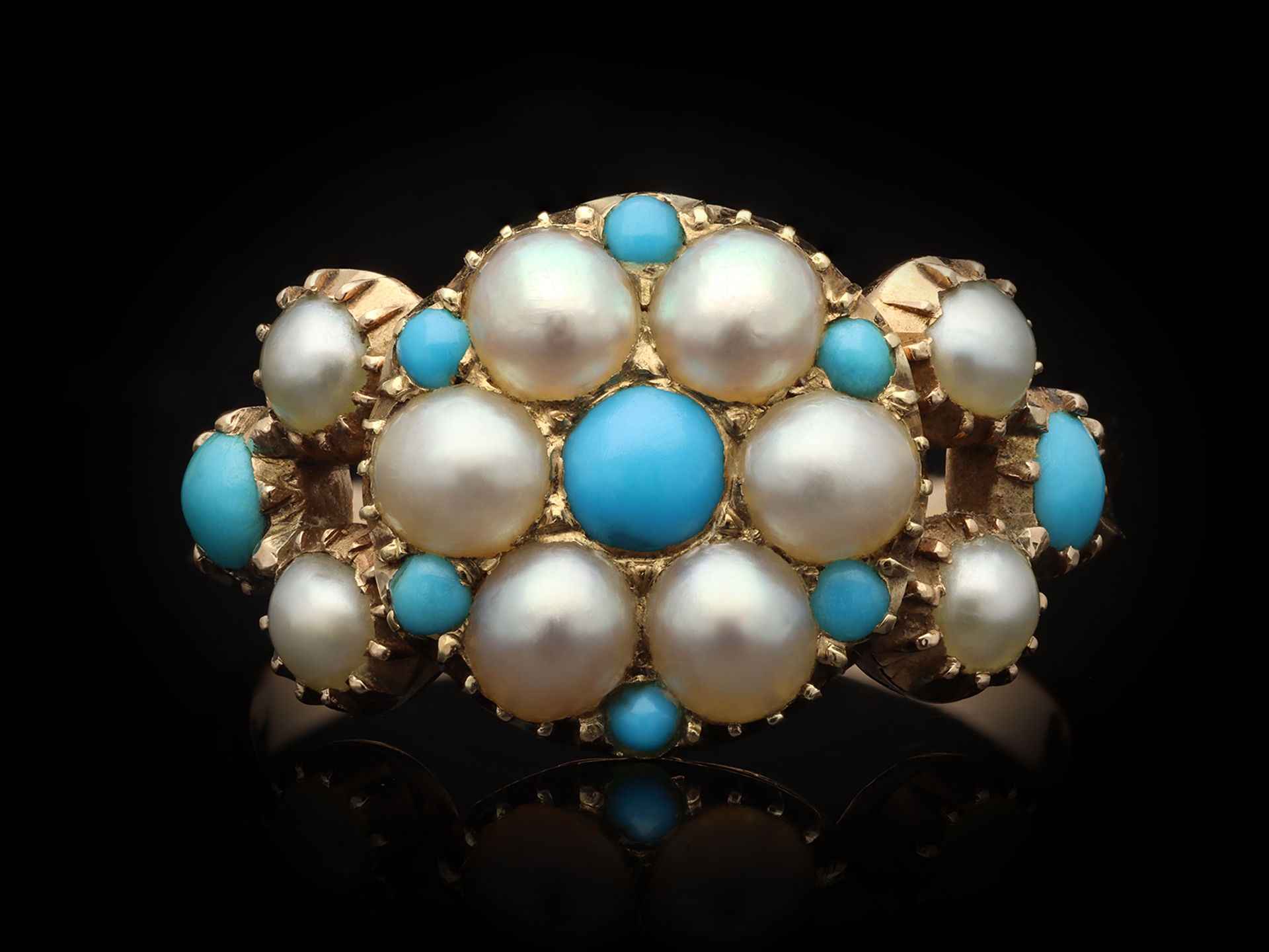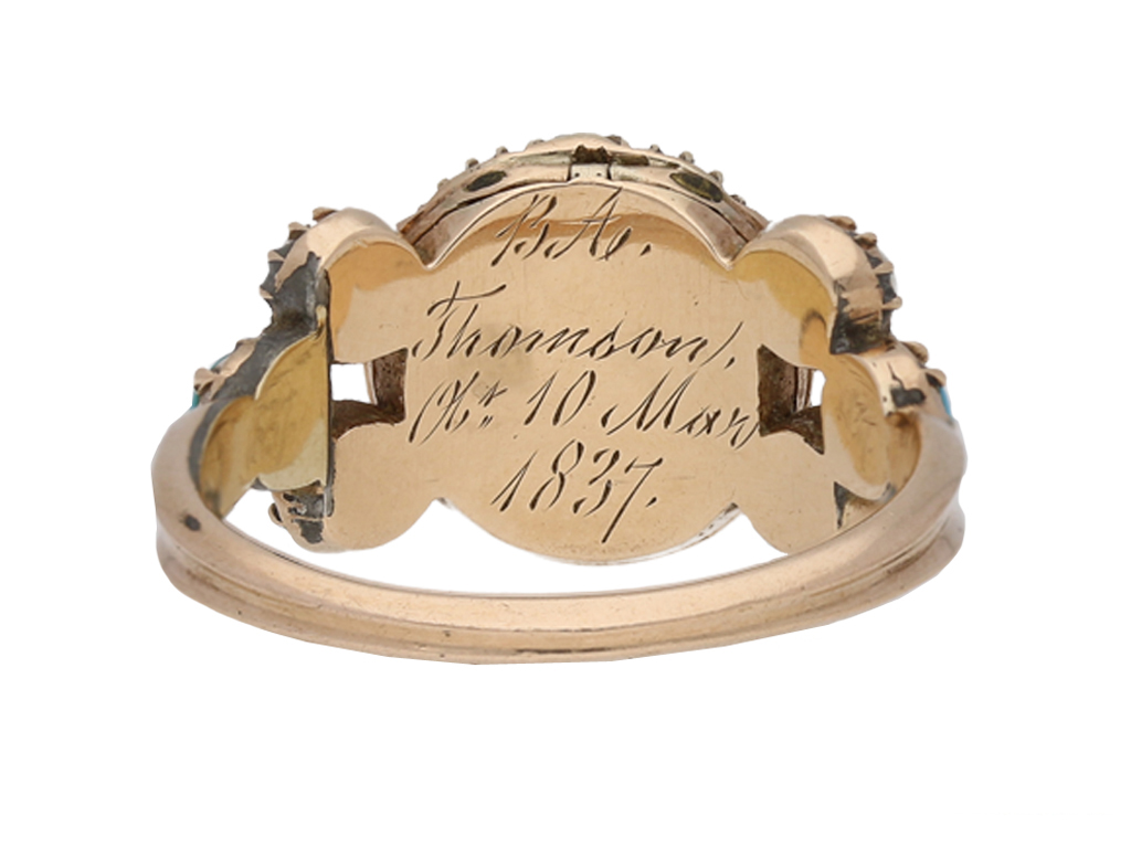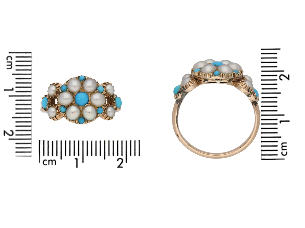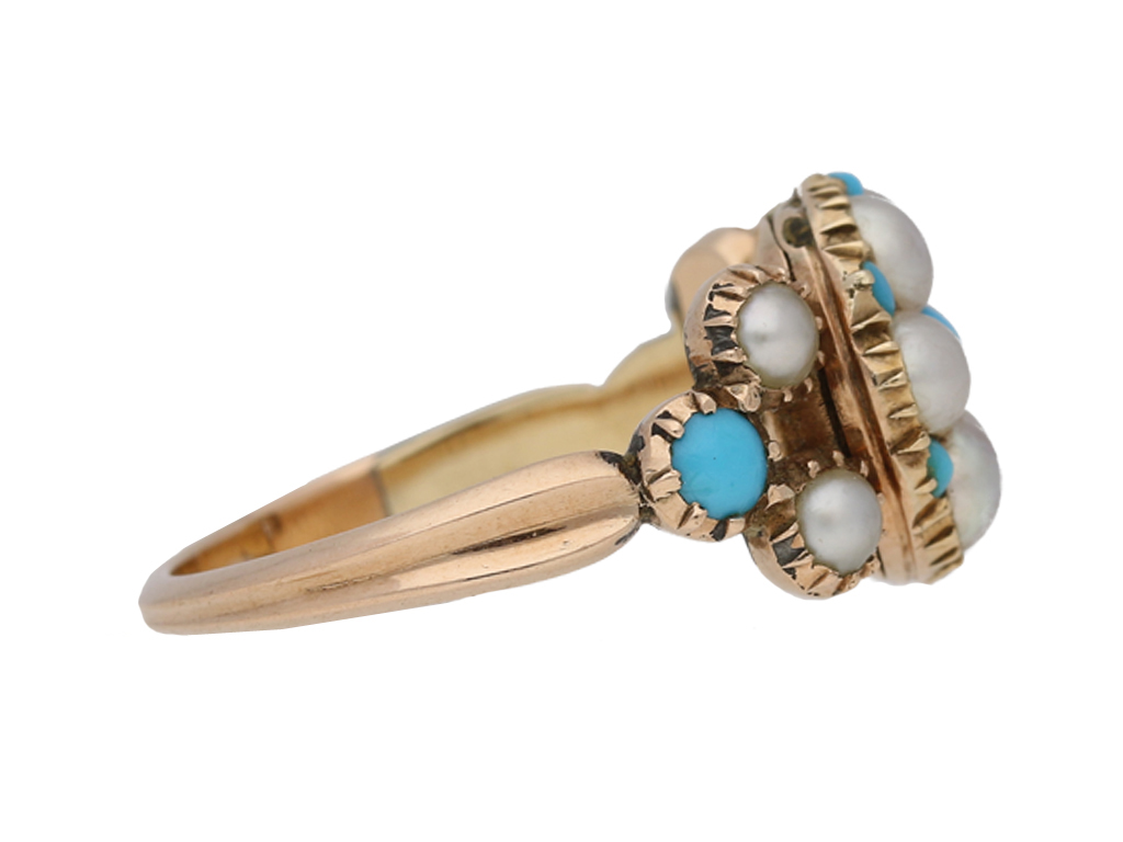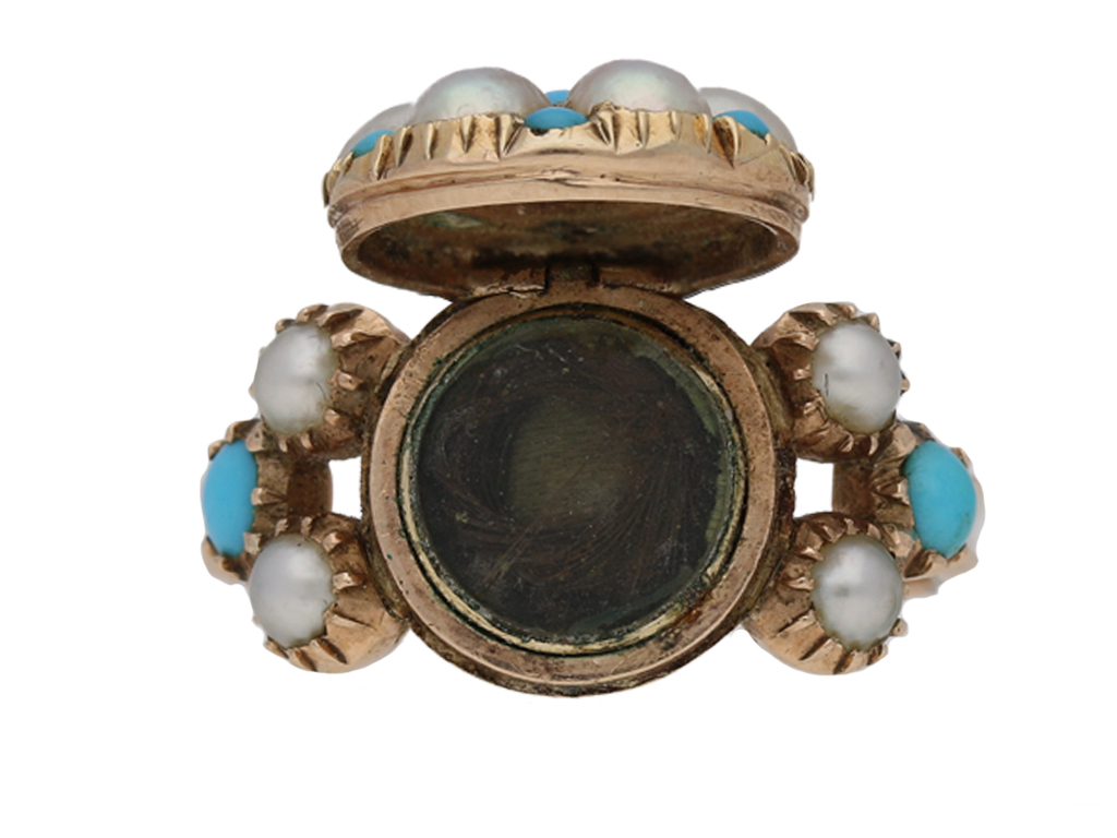 Antique turquoise and pearl locket memorial ring. The circular bezel is set with one central cabochon turquoise in a closed back grain setting, encircled by six pearls and six smaller cabochon turquoises all in closed back cutdown settings, the locket opening to reveal a glass covered compartment containing a lock of brown hair, flanked by split shoulders set with four pearls and two cabochon turquoises all in closed back cutdown settings, and on a ridged tapered shank, the reverse of the bezel engraved, ‘BA Thomson/ Obt 10 Mar/ 1837’. Tested yellow gold, circa 1837.