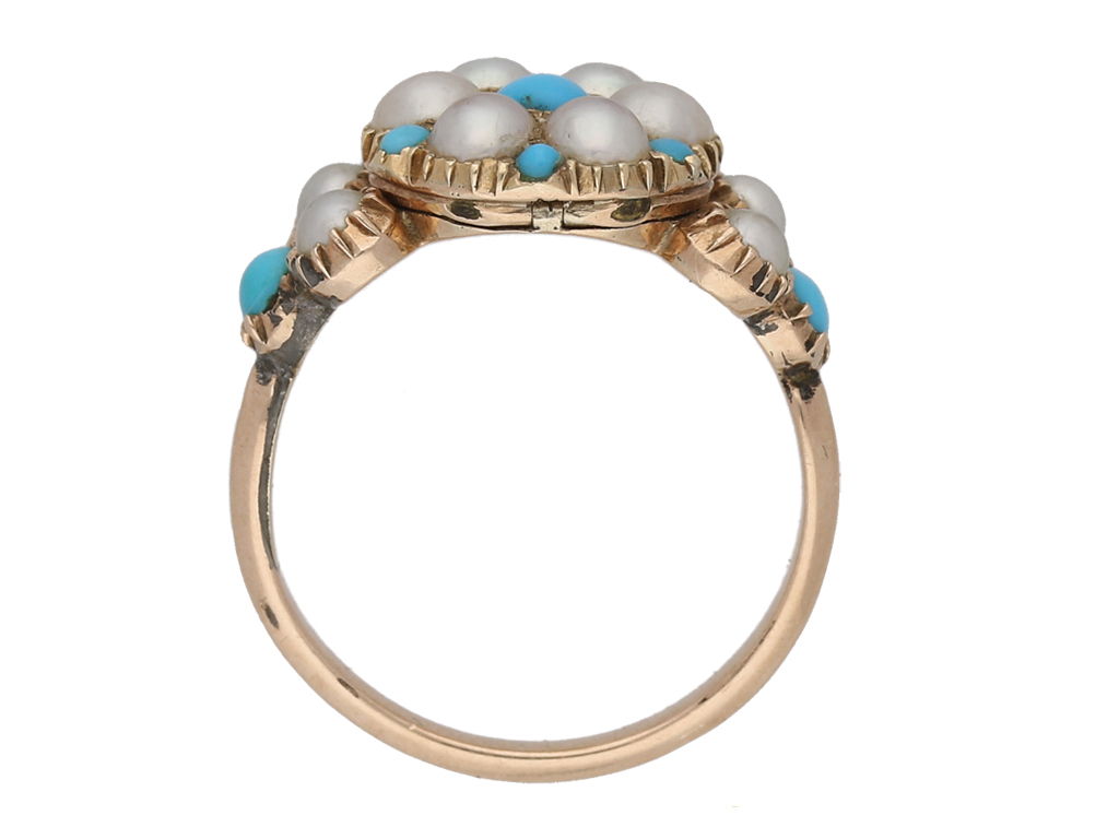 Antique turquoise and pearl locket memorial ring, circa 1837.