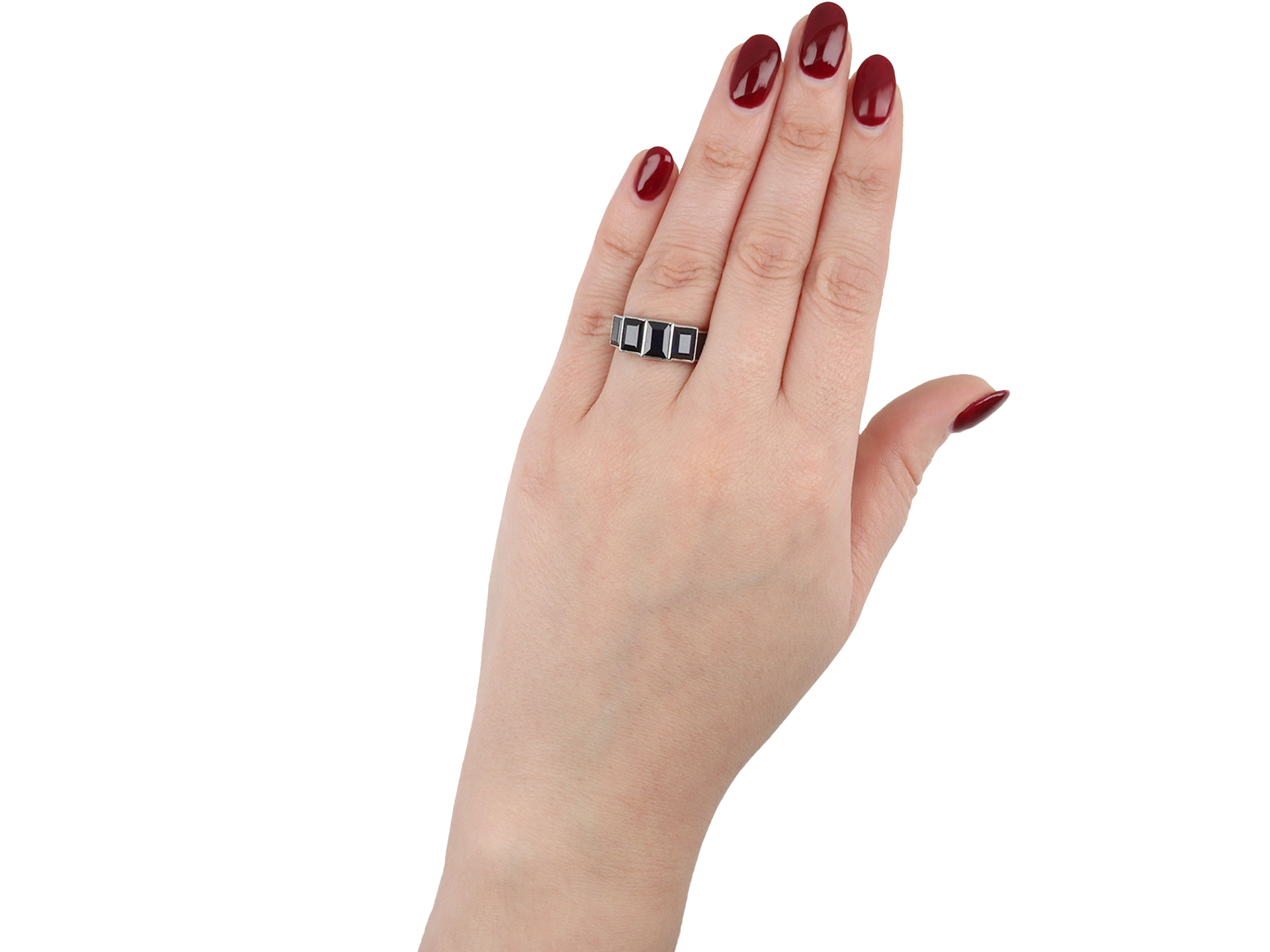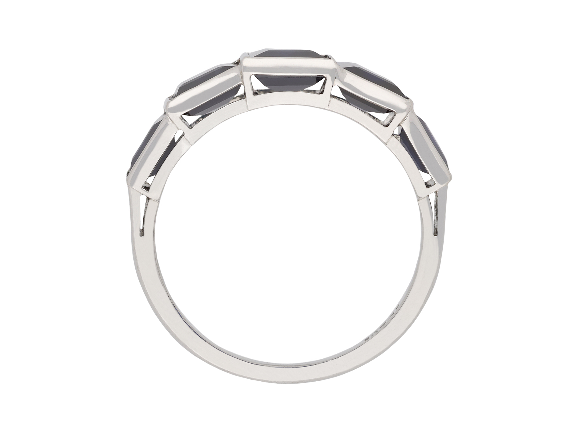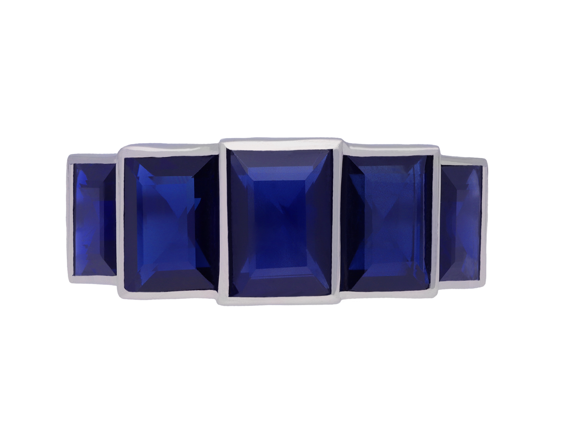 Art Deco Burmese sapphire five stone ring. Set with five rectangular step-cut natural unenhanced Burmese sapphires in open back rubover settings with a combined approximate weight of 4.15 carats, to a graduating five stone design featuring polished edges, a linear gallery, and geometric open backholing, leading to slightly raised shoulders and flowing through to a solid D-shape shank. Marked platinum, circa 1925, accompanied by Gemmological Certification Services report #5784-0462.