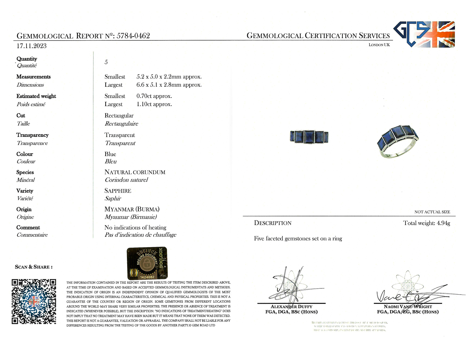 Gemstone 5 x Burmese Unheated Sapphires, Step Cut, approximately 4.15ct total