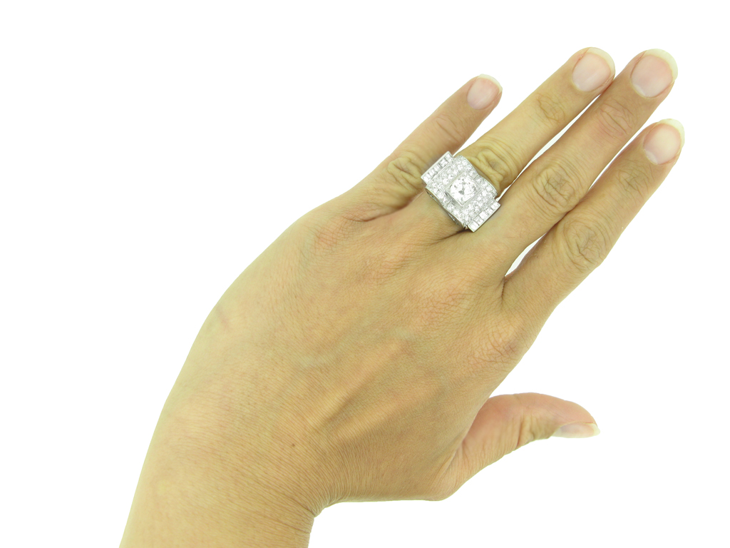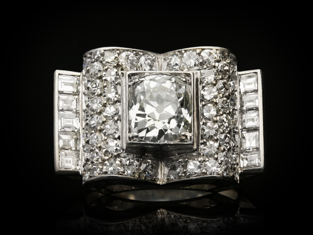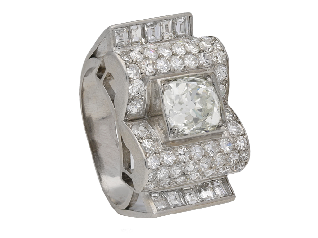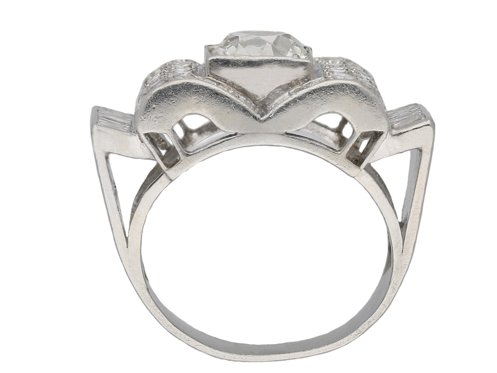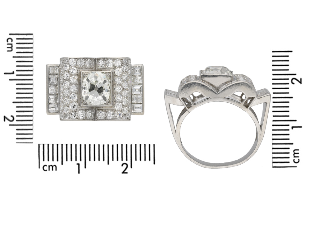 Art Deco diamond cluster ring. Set to centre with a cushion shape old mine diamond in a grain set box collet setting with a weight of 1.75 carats, flanked to the outside by ten square step cut diamonds in open back channel settings with a combined weight of 0.70 carats, further adorned by fifty round eight cut diamonds in open back grain settings with a combined weight of 1.20 carats. The total approximate diamond weight is 3.65 carats, to an impressive cocktail ring of symmetrical design with an intricately pierced gallery and fancy open backholing, the broad tapering shoulders flowing to a flat solid shank. Tested platinum, circa 1925.