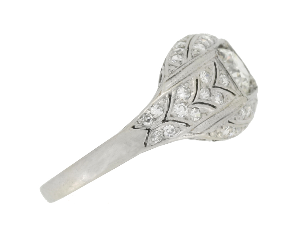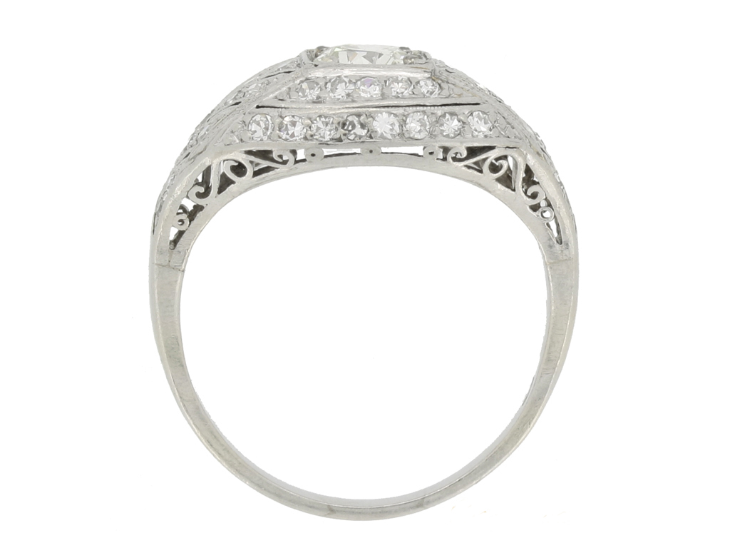 Art Deco diamond cluster ring. Set centrally with a round old cut diamond in an open back grain setting with an approximate weight of 0.60 carats, encircled by a cluster of forty eight round eight cut diamonds in open back grain settings with a combined weight of 0.70 carats. The total approximate diamond weight is 1.30 carats, to an elegant tapered bombé cluster featuring linear openwork throughout, a scrolling open gallery and intricately pierced open backholing, flanked by trumpeting shoulders which taper down to a solid D-shape shank. Tested platinum, circa 1930.