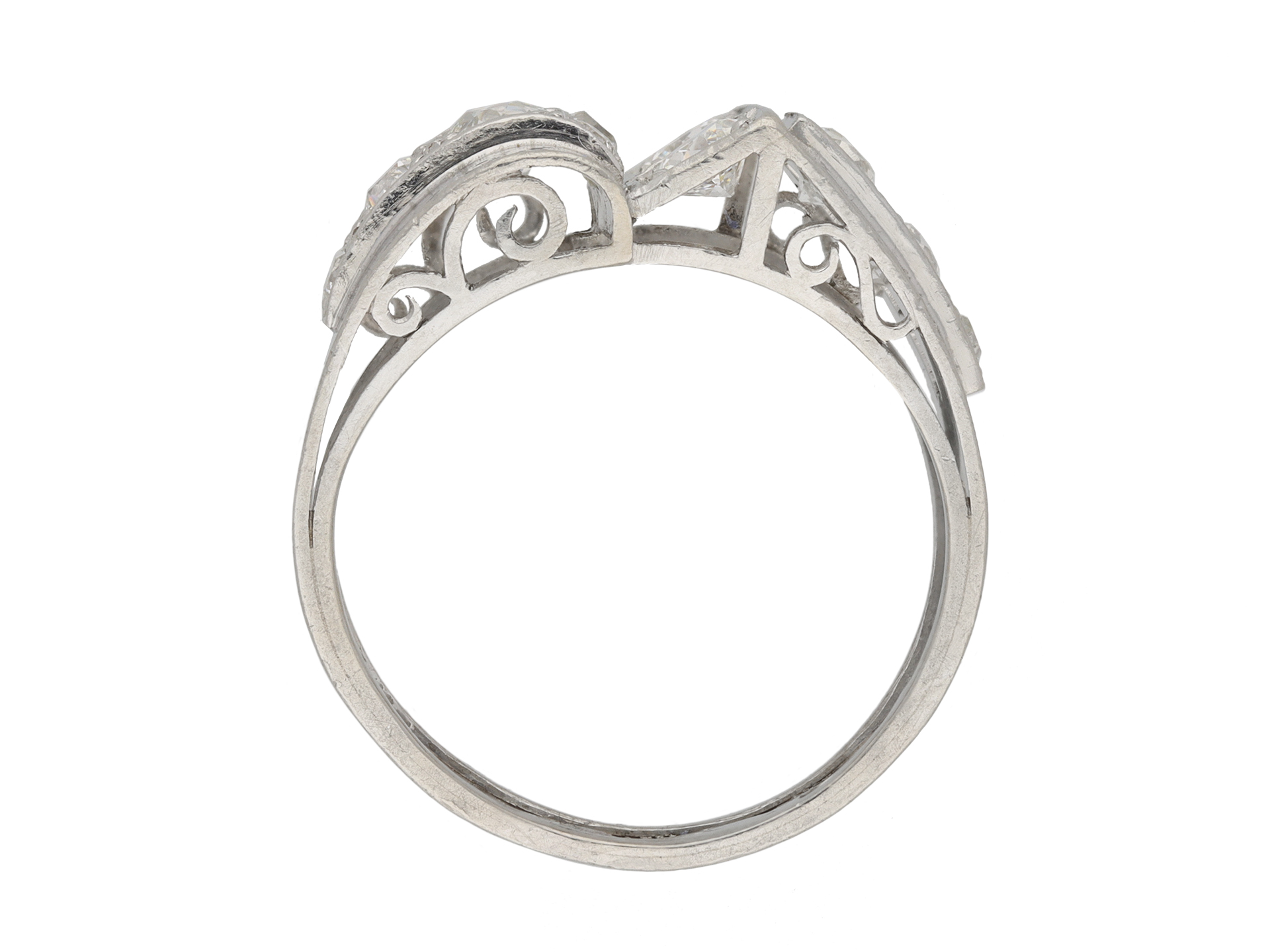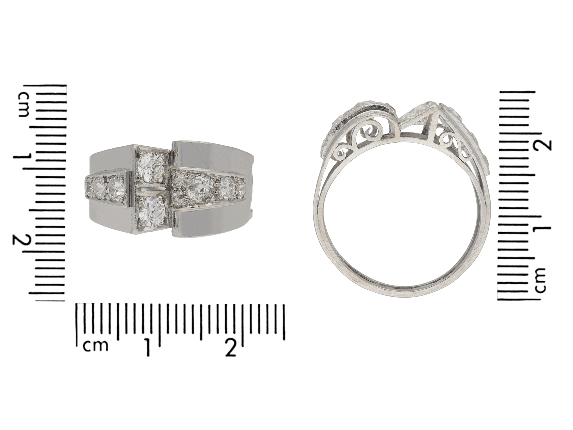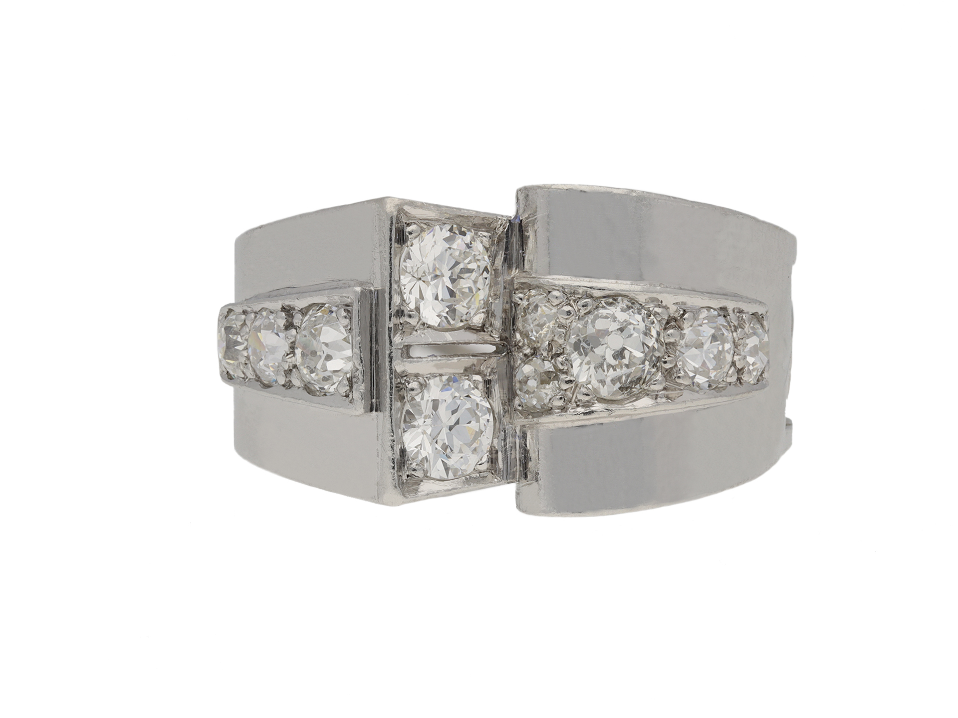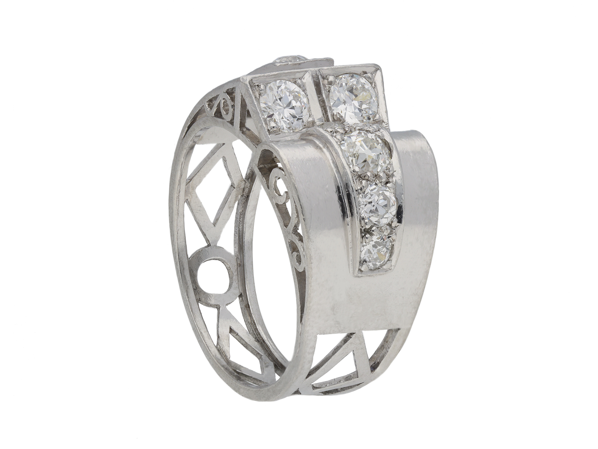 Art Deco diamond cocktail ring. Set with ten round old cut diamonds in open back grain settings with an approximate total weight of 1.00 carats, to an asymmetrical cocktail design featuring polished borders, a decoratively pierced gallery with scrolling motifs and open backholing, leading to trumpeting shoulders and flowing through to a geometric openwork shank. Tested platinum, circa 1935.
