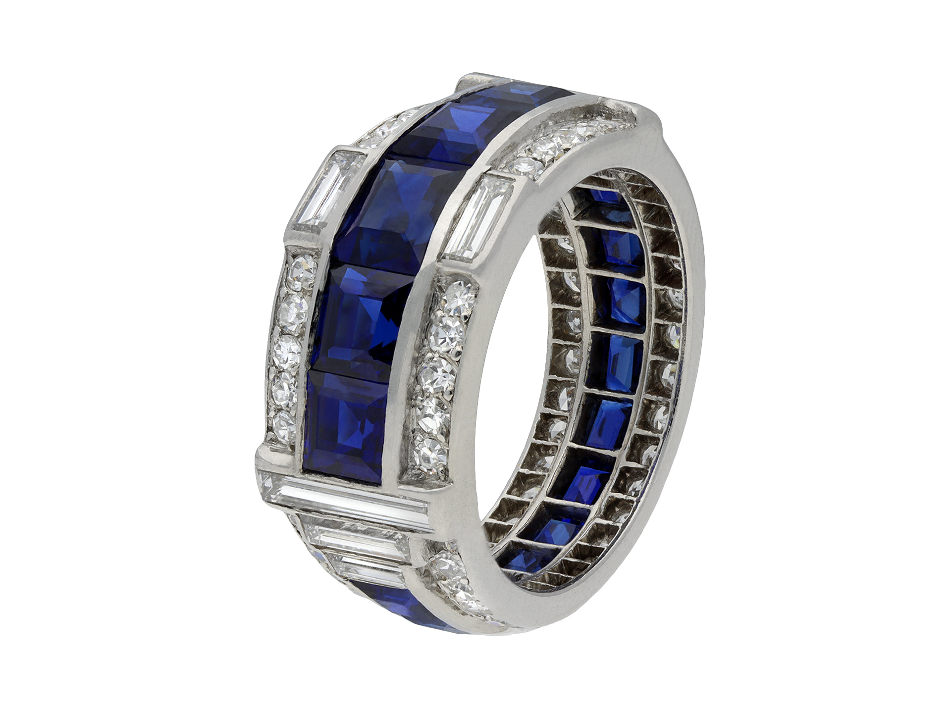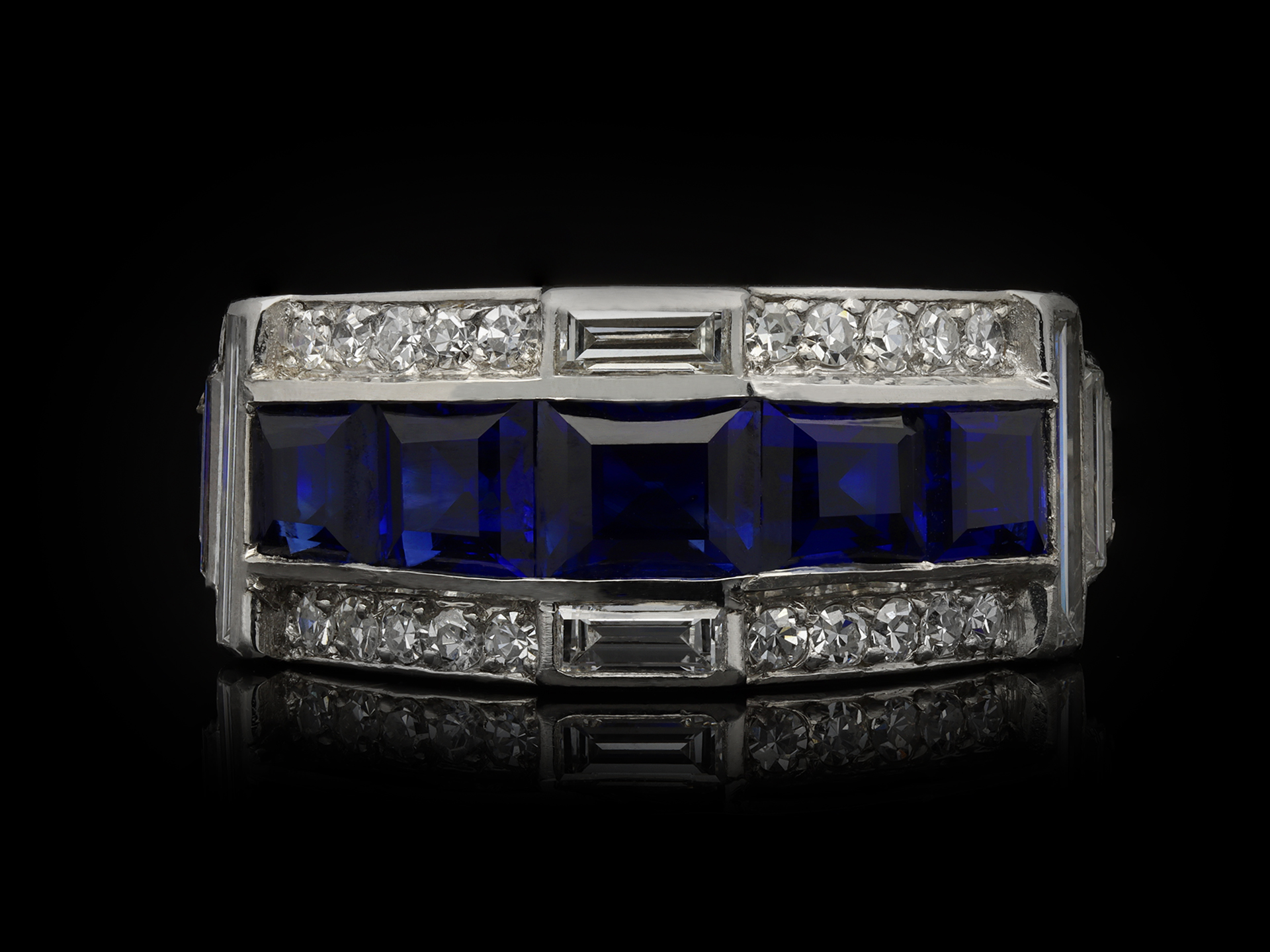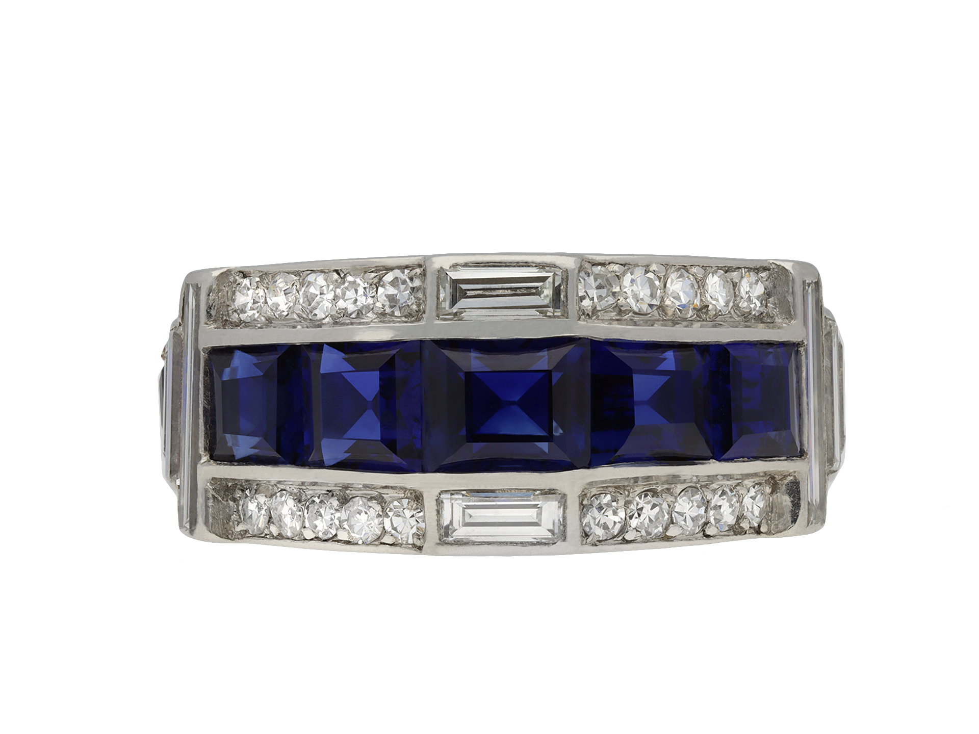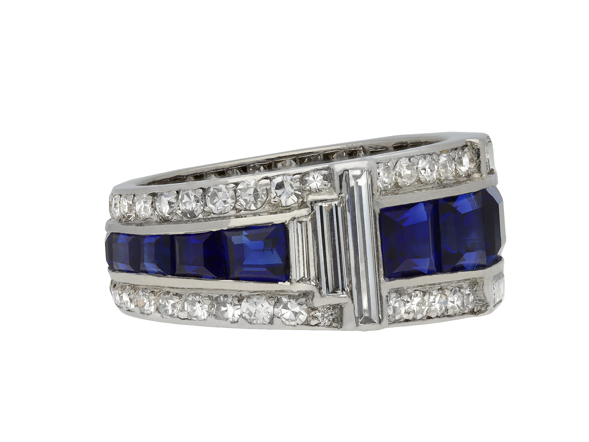 Art Deco sapphire and diamond ring. Set with sixteen calibre step cut natural unenhanced sapphires, graduating in size, in open back channel settings with an approximate combined weight of 4.50 carats, further set with sixty-six round eight cut diamonds in open back grain settings with a combined approximate weight of 0.65 carats, adorned further with eight rectangular baguette cut diamonds in open back rubover settings with a combined weight of 0.65 carats. The total approximate diamond weight is 1.30 carats, to an impressive geometric cluster design with polished edges and intricately pierced fancy open backholing. Tested platinum, circa 1935, accompanied by Gemmological Certification Services report #81316-24.