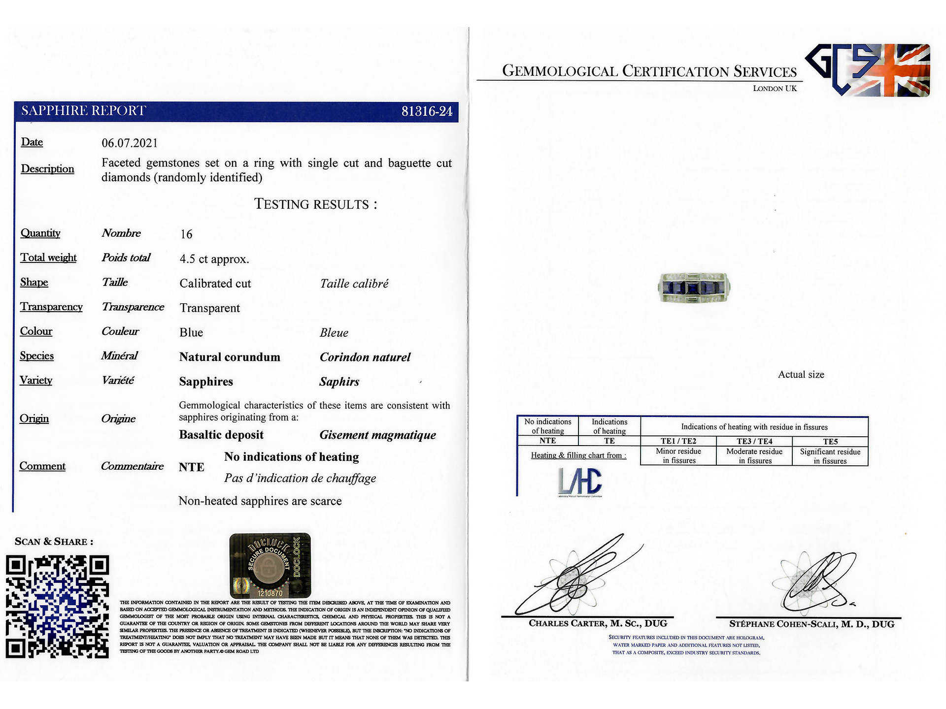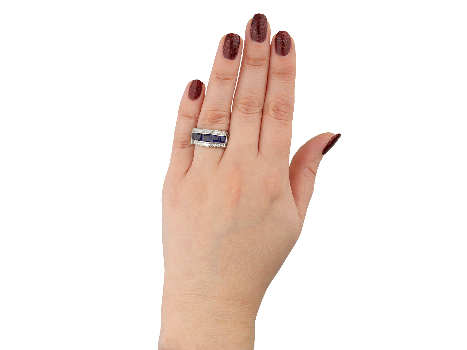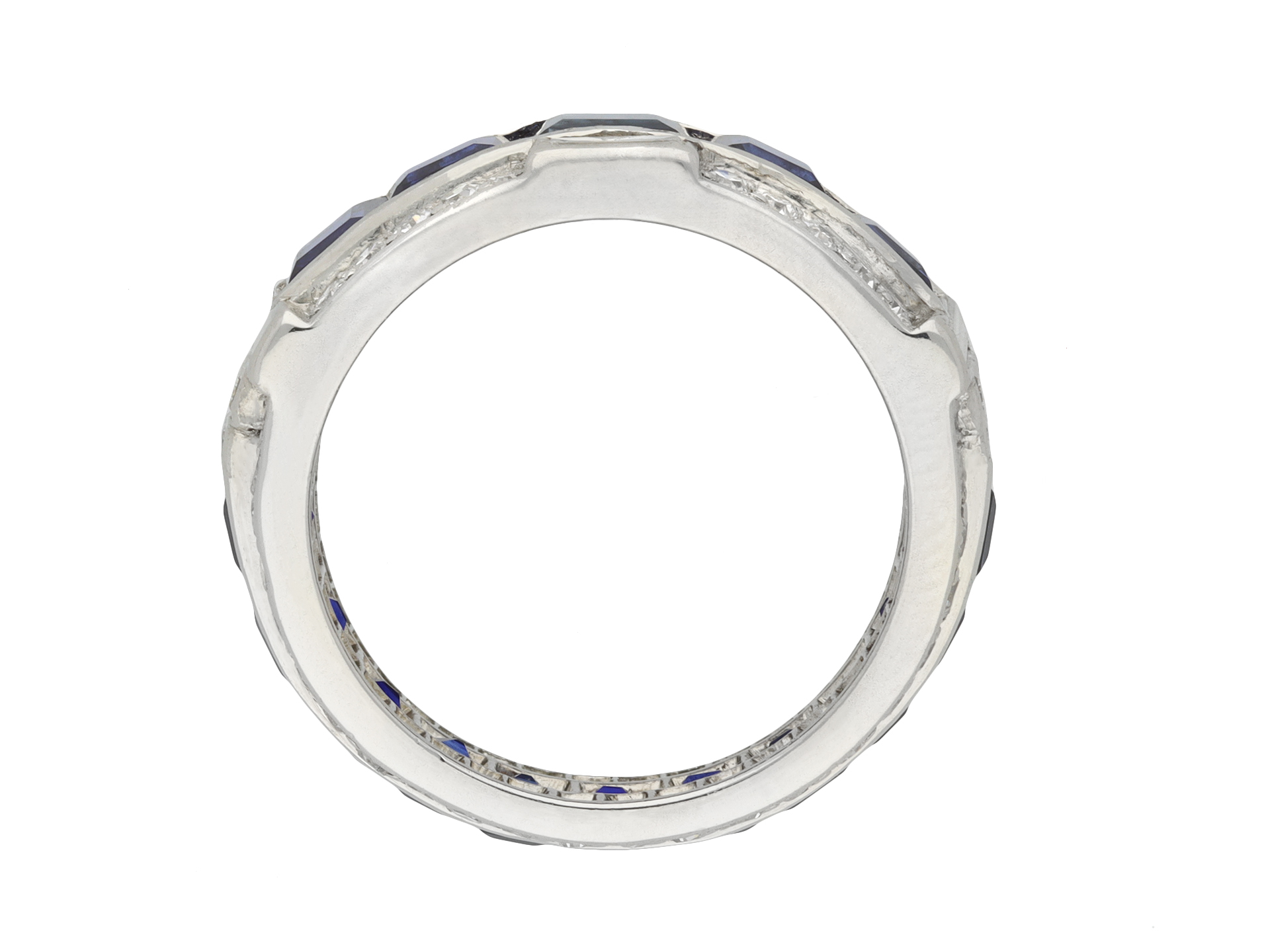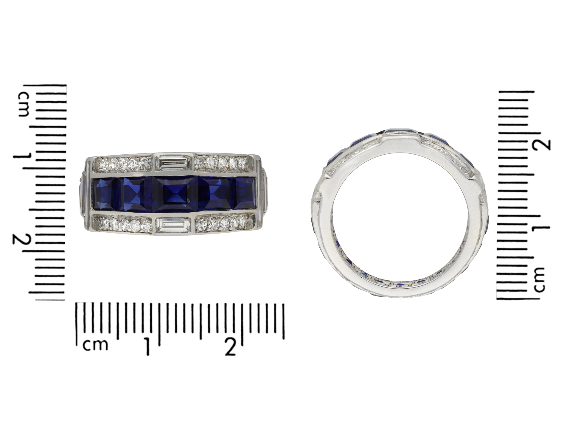 Art Deco sapphire and diamond ring. Set with sixteen calibre step cut natural unenhanced sapphires, graduating in size, in open back channel settings with an approximate combined weight of 4.50 carats, further set with sixty-six round eight cut diamonds in open back grain settings with a combined approximate weight of 0.65 carats, adorned further with eight rectangular baguette cut diamonds in open back rubover settings with a combined weight of 0.65 carats. The total approximate diamond weight is 1.30 carats, to an impressive geometric cluster design with polished edges and intricately pierced fancy open backholing. Tested platinum, circa 1935, accompanied by Gemmological Certification Services report #81316-24.