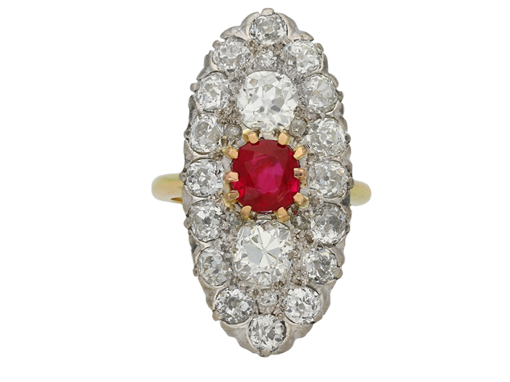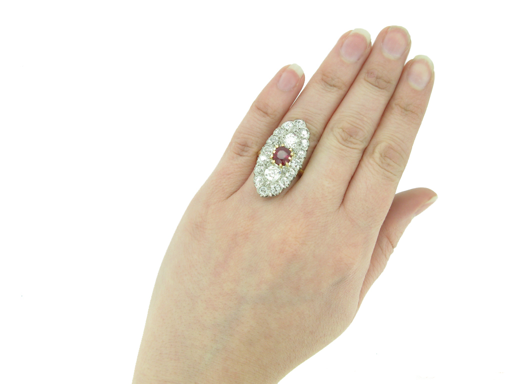 Belle Époque marquise shape ruby and diamond cluster ring, French, circa 1910.