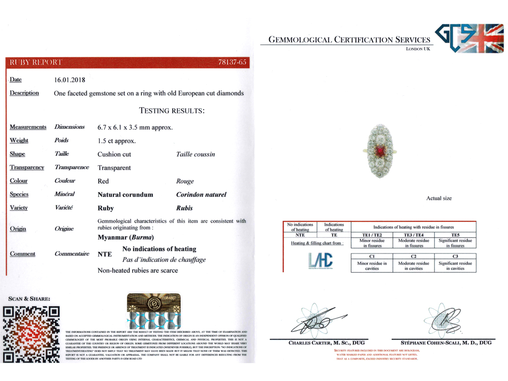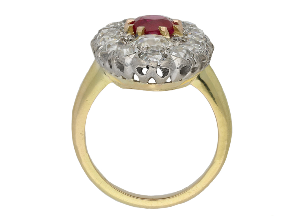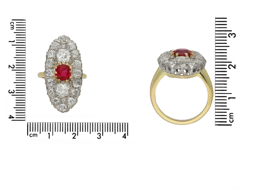 Belle Époque marquise shape ruby and diamond cluster ring. Set centrally with a cushion shape old cut natural no heat Burmese ruby in an open back claw setting with an approximate weight of 1.50 carats, set to top and bottom with two cushion shape old mine diamonds in open back grain settings with a combined weight of 1.95 carats, all bordered by sixteen cushion shape old mine diamonds in open back claw settings with a combined weight of 3.30 carats and enhanced with six cushion shape old mine diamonds in open back grain settings with a combined weight of 0.12 carats. The total approximate diamond weight is 5.37 carats, to an impressive marquise shape cluster with finely curving claws, an intricately pierced gallery and fancy open backholing, flanked by smoothly conforming shoulders which lead to a solid slim D-shape shank. Marked yellow gold with platinum settings, indistinct maker's mark, French, circa 1910, accompanied by Gemmological Certification Services report #78137-65.