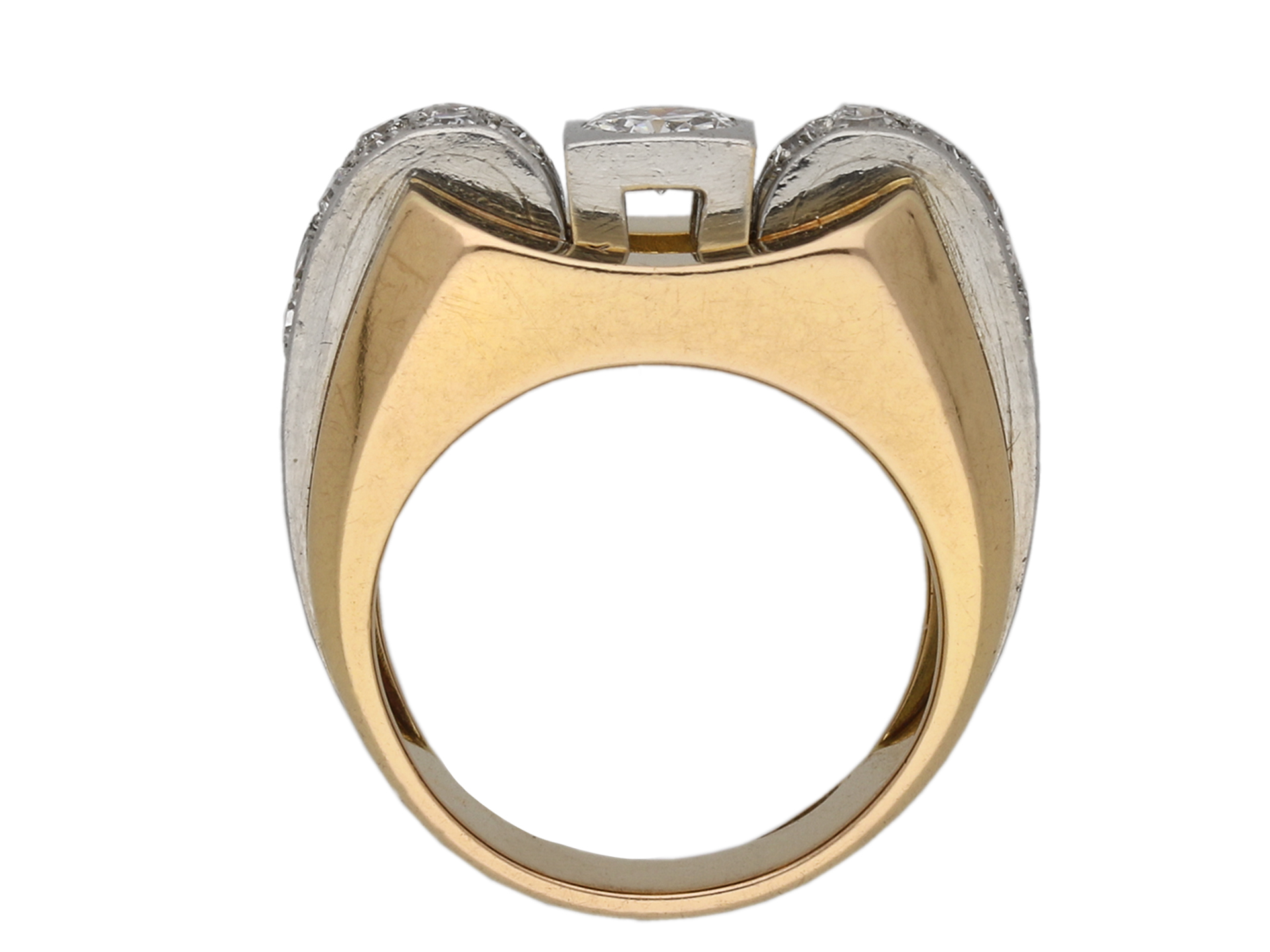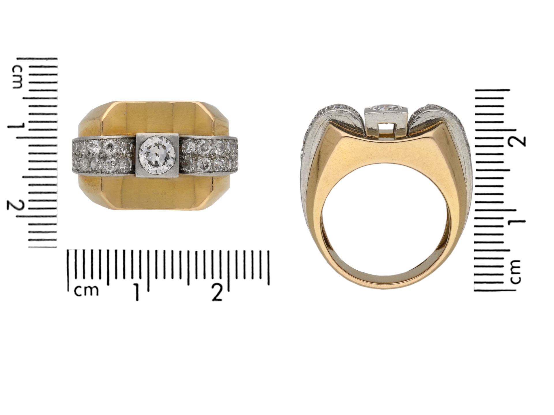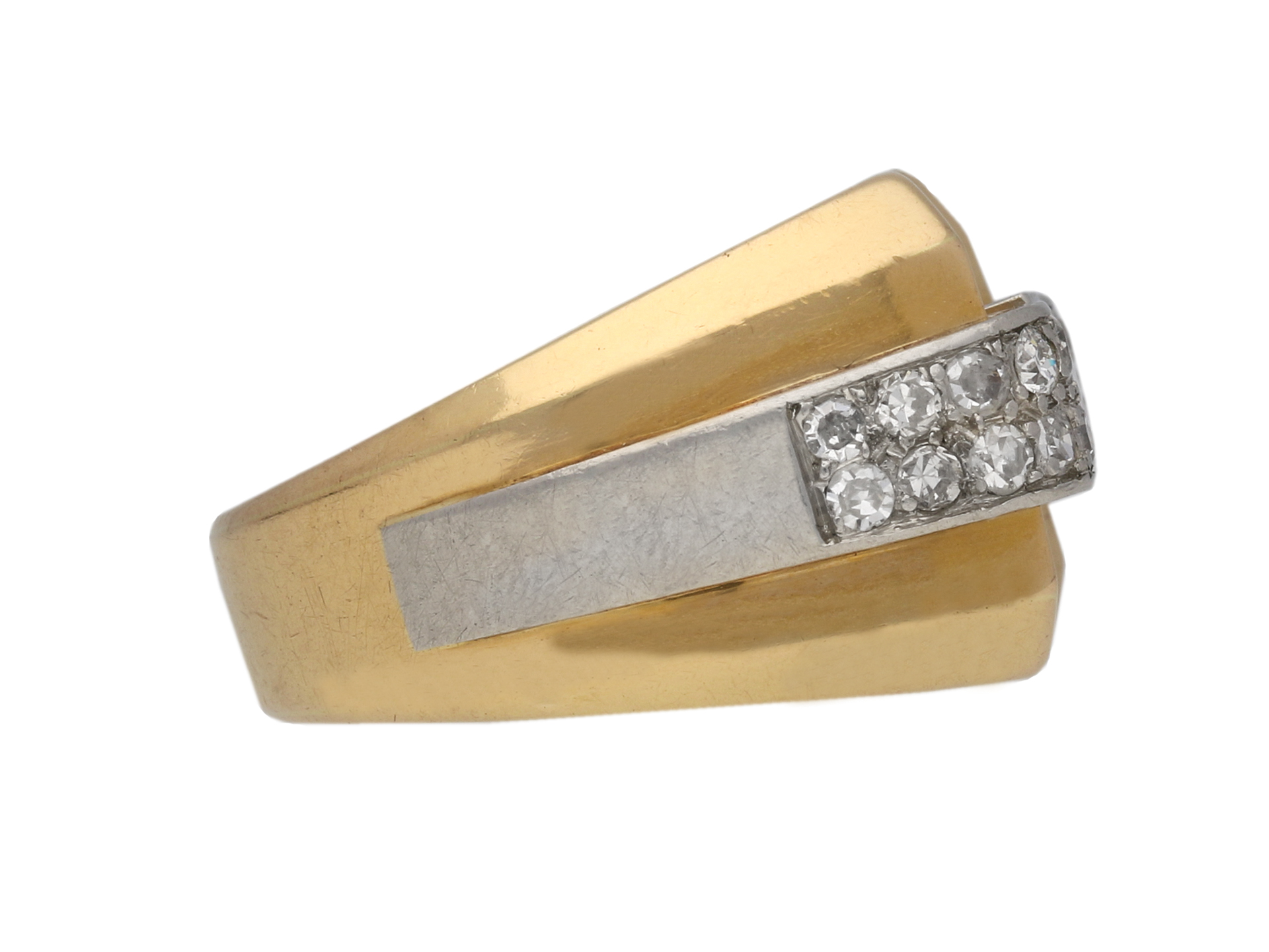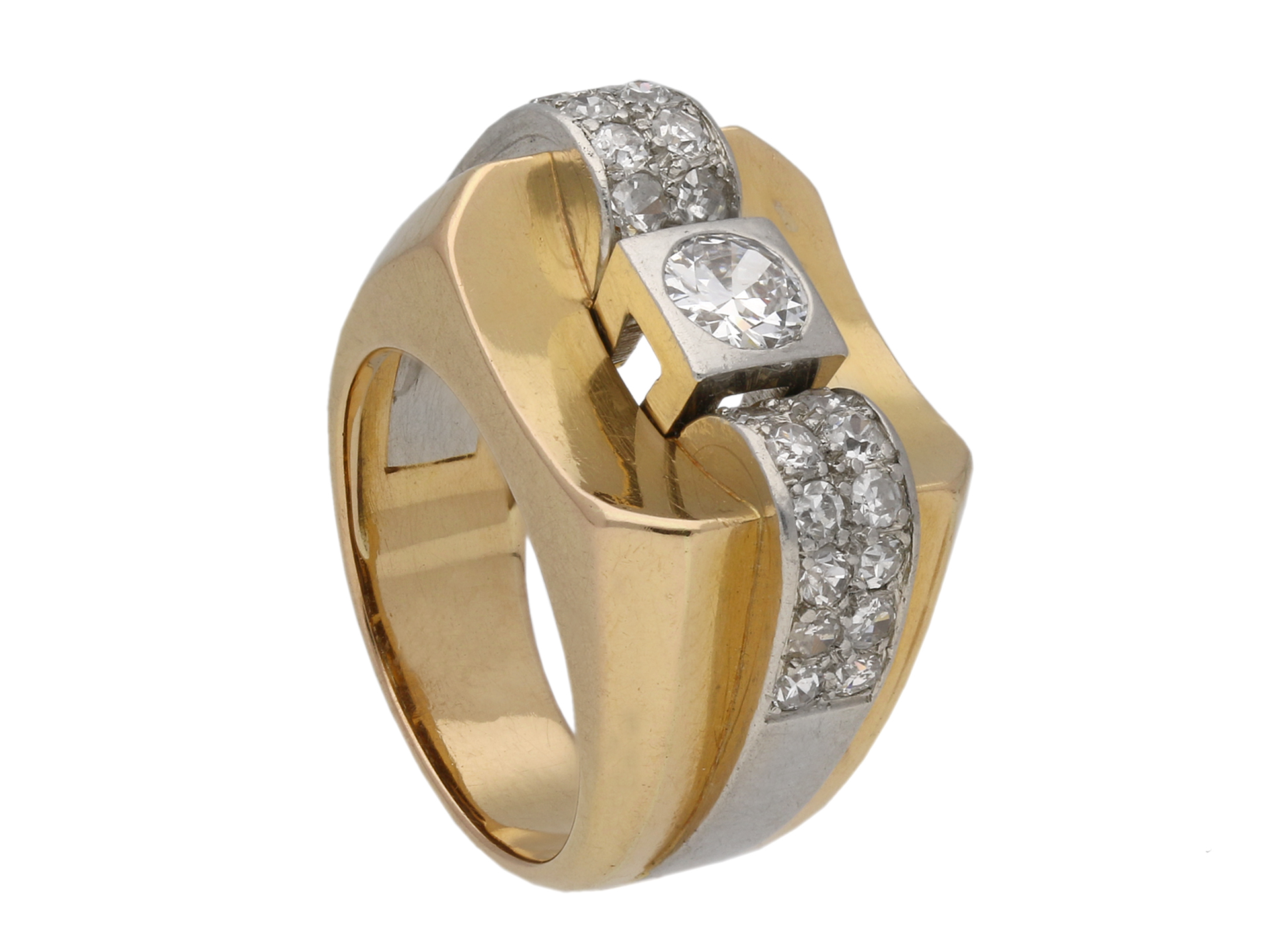 Boucheron Paris diamond cocktail ring. Set to centre with a round old cut diamond in an open back rubover setting with an approximate weight of 0.50 carats, flanked by two curved rows of twenty four round eight cut diamonds in open back grain and rubover settings with a combined weight of 0.50 carats. The total approximate diamond weight is 1.00 carats, to an impressive dress ring featuring a concave plaque, polished edges, a raised scroll design to the gallery and structured open backholing, the heavy integrated shoulders tapering to a solid D-shape shank. Marked yellow gold and platinum, signed 'BOUCHERON - PARIS.', French, circa 1945.