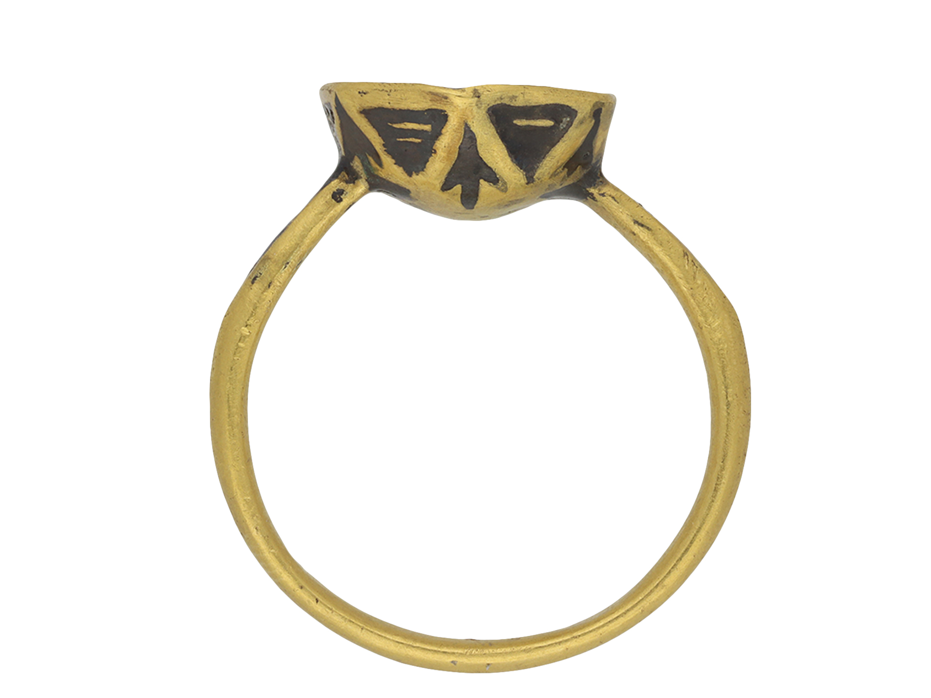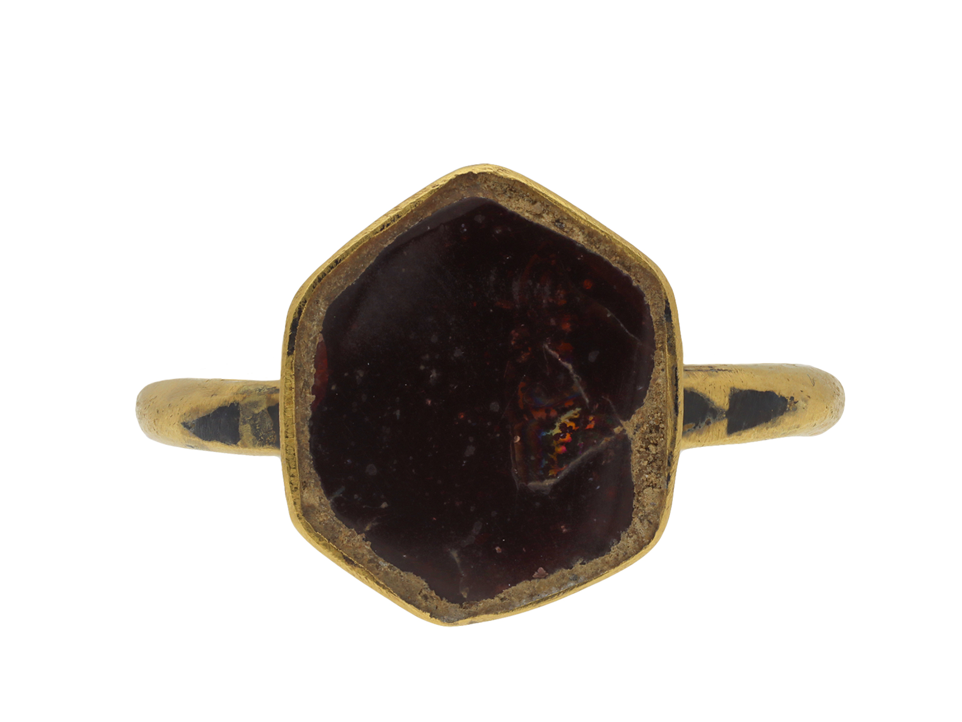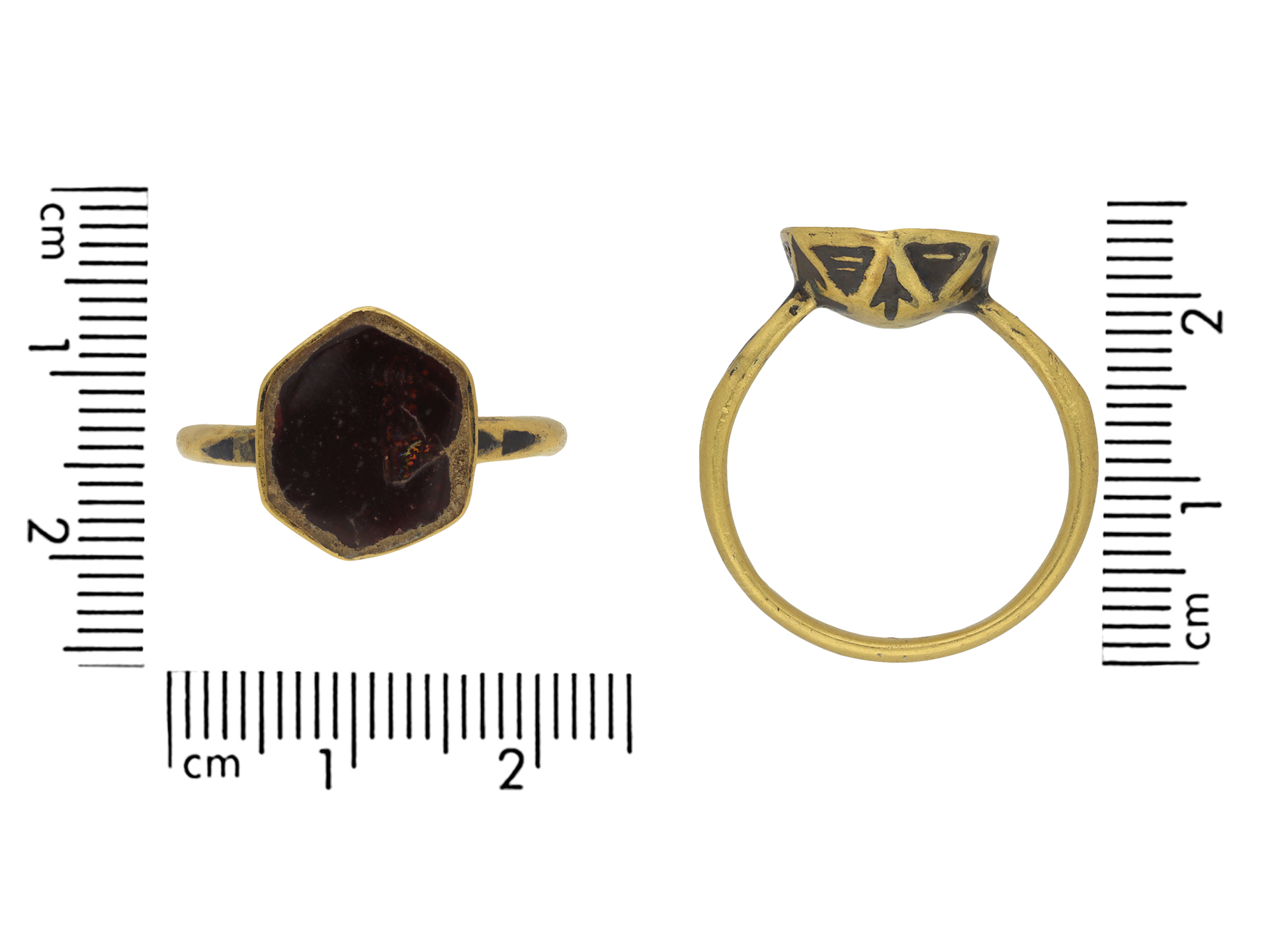Byzantine garnet and enamel ring. Set with a hexagonal shape garnet in a closed back rubover setting, to a pie-dish bezel with delicate black enamel decoration to the curved underside, flanked by further enamel highlights on the shoulders and leading through to a solid rounded shank. Tested yellow gold, approximately 4.5g in weight, circa 6th-9th century.
