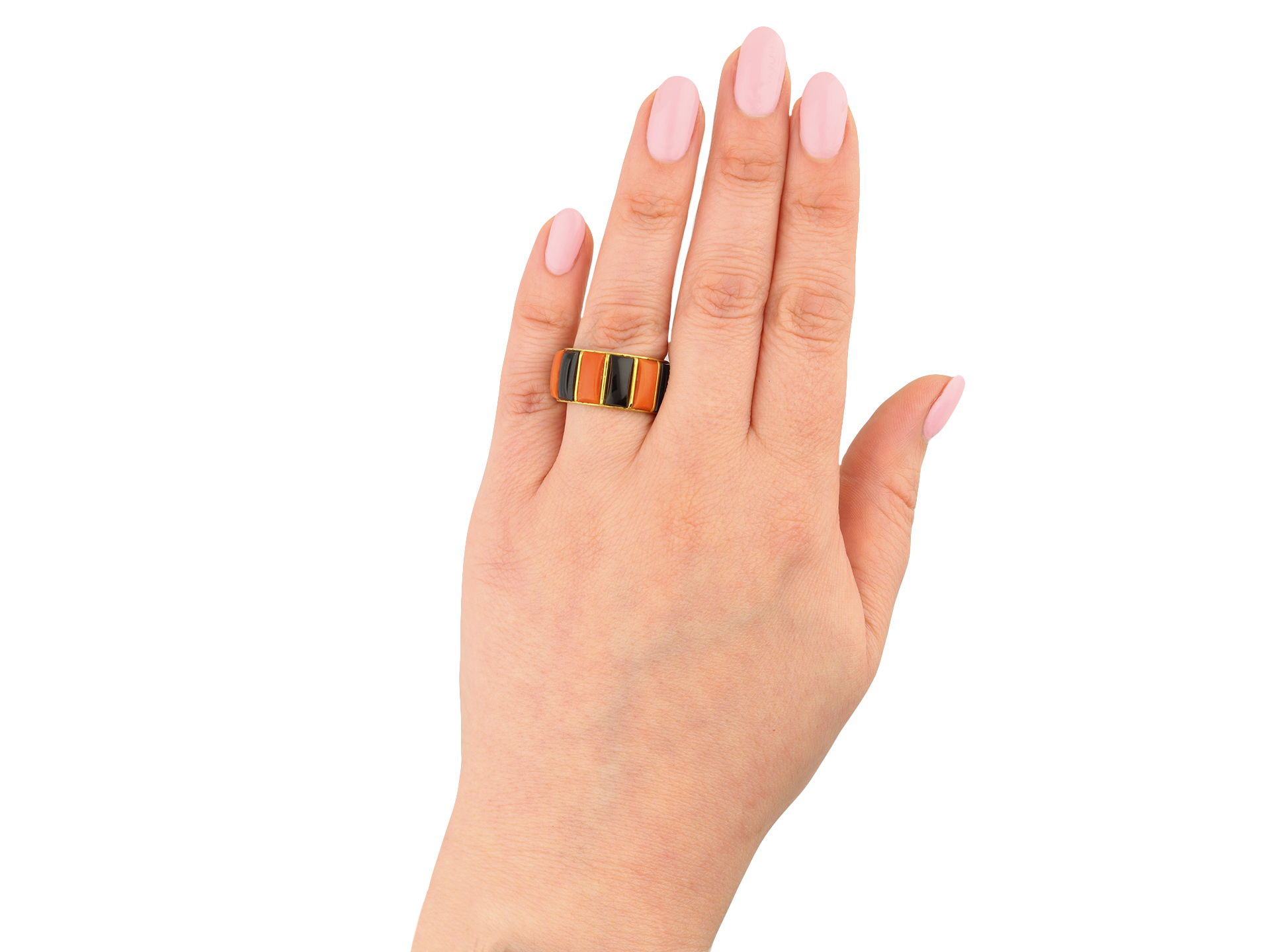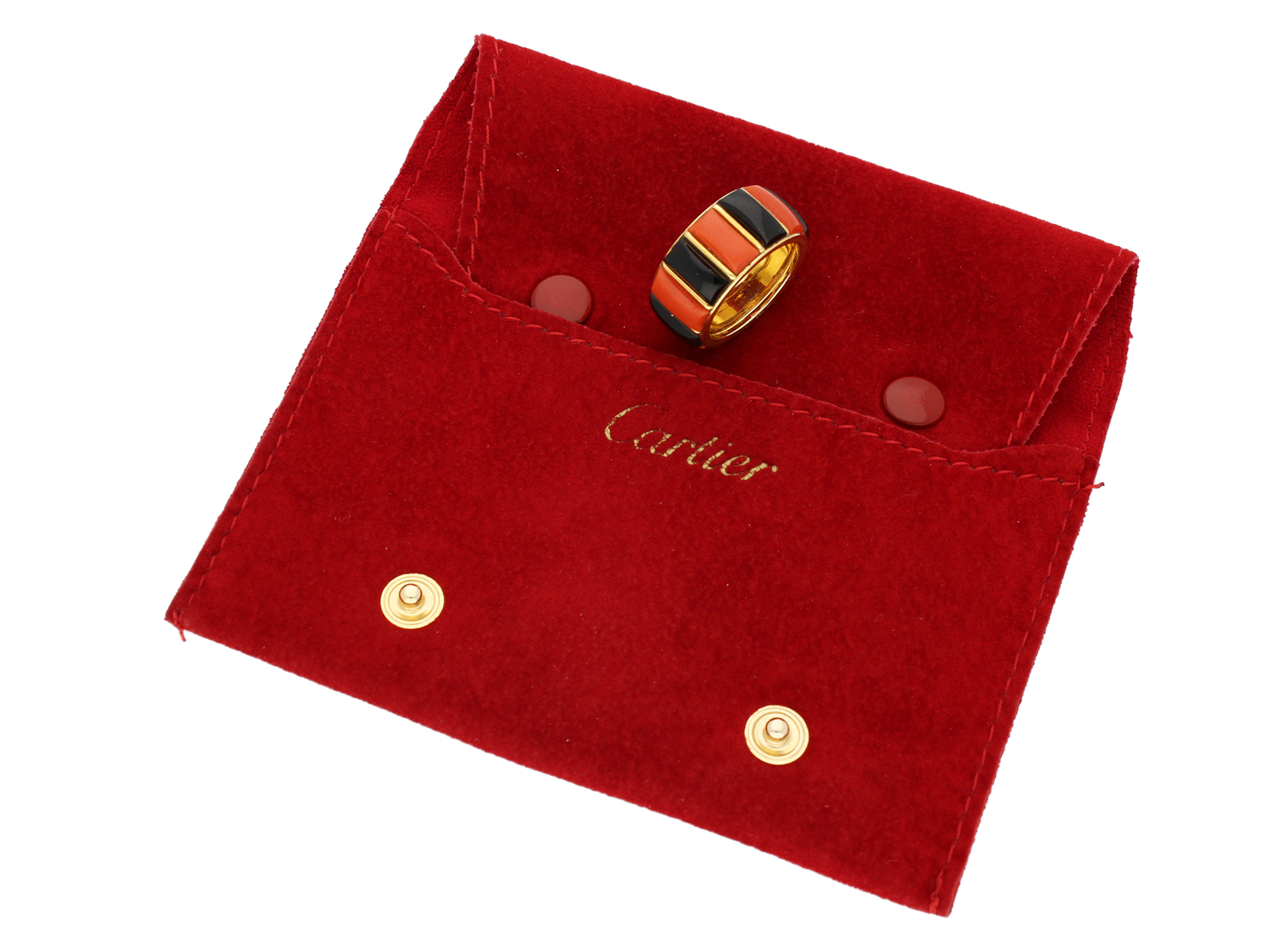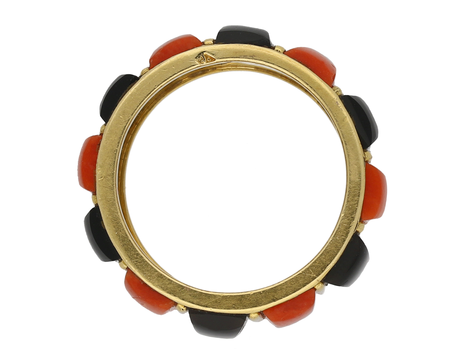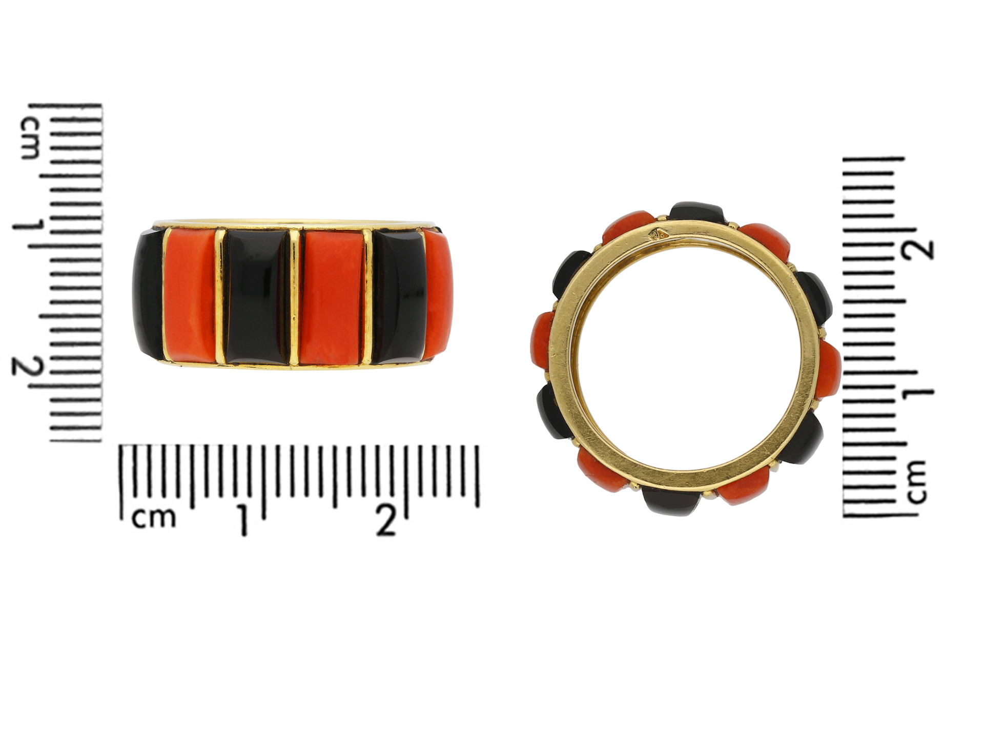 Cartier coral and onyx ring. Set with six rectangular cabochon onyx in closed back rubover settings, alternately set with six rectangular cabochon coral in closed back rubover setings, to a dress ring design featuring bar details, polished edges and closed backholing, to a smooth conforming band with ridged inside edging and an approximate width of 10mm. Marked 18 carat yellow gold, maker's mark for Cartier, French, circa 1975, authenticated by Cartier, accompanied by Cartier pouch.