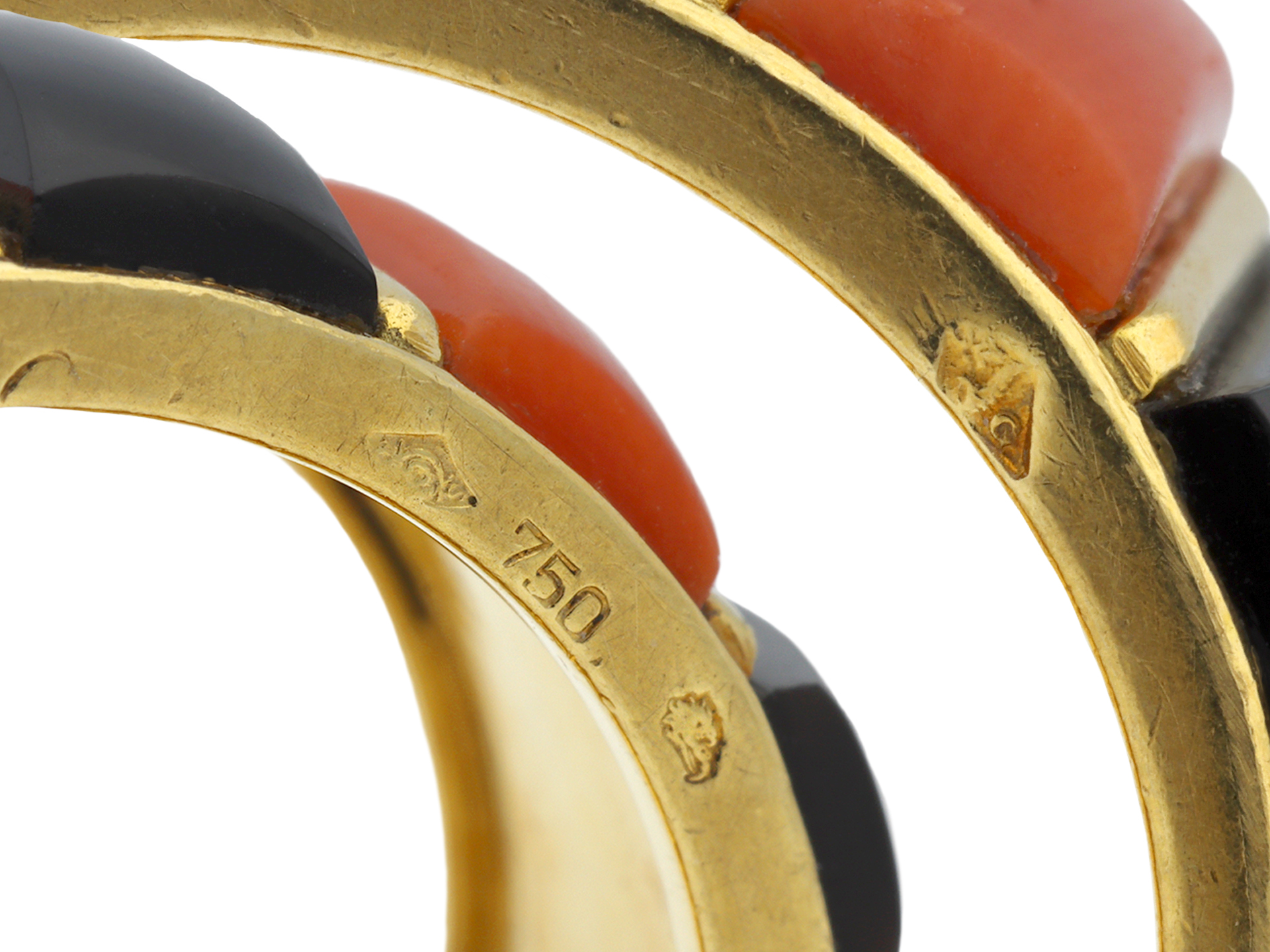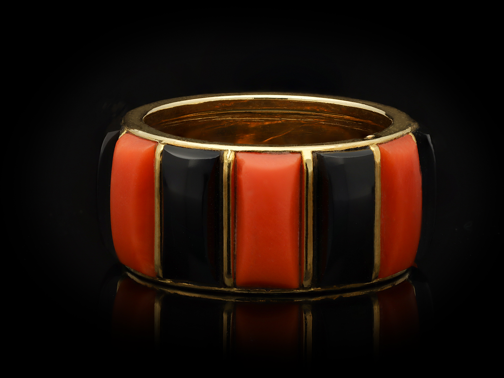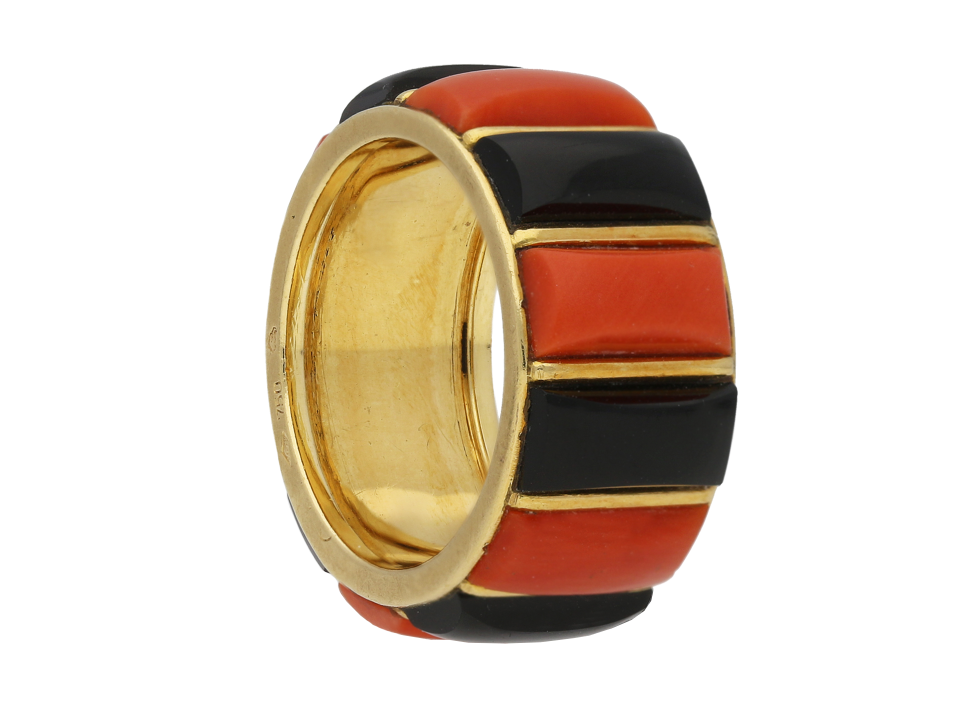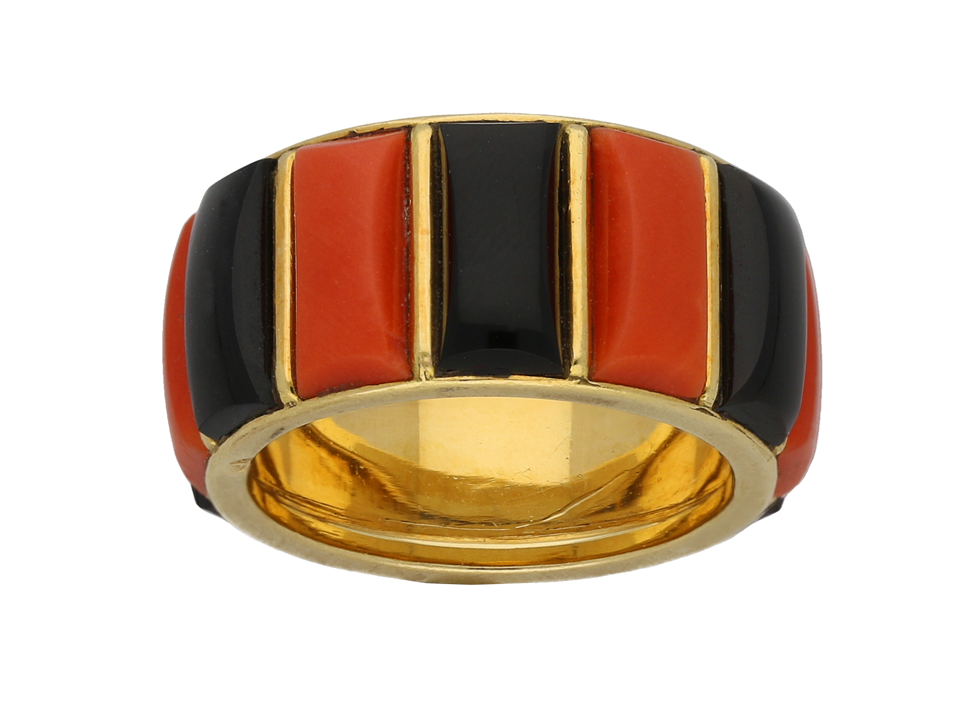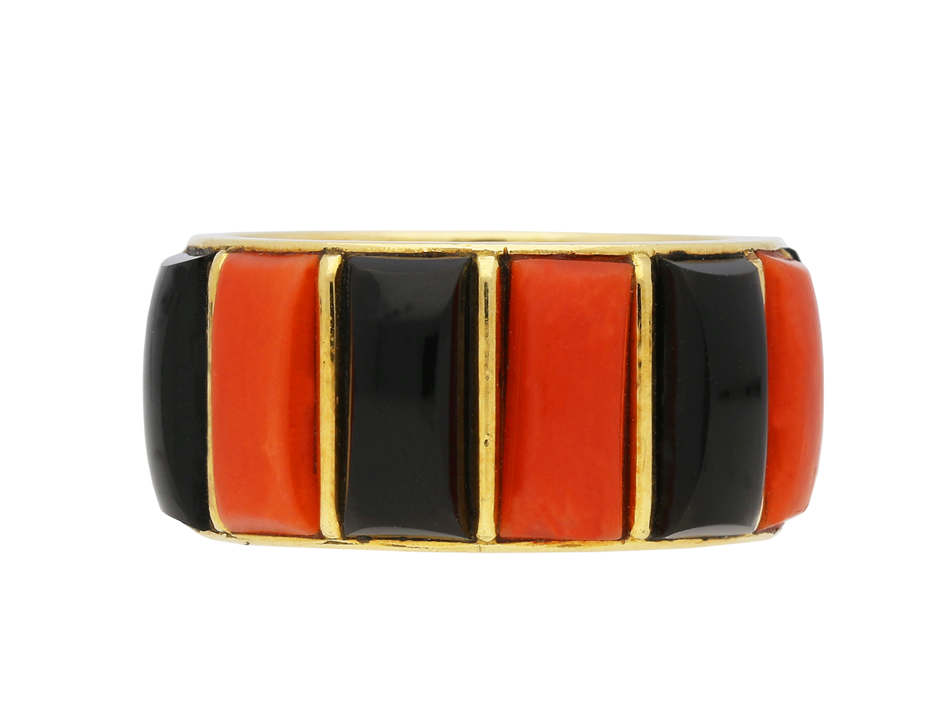 Cartier coral and onyx ring. Set with six rectangular cabochon onyx in closed back rubover settings, alternately set with six rectangular cabochon coral in closed back rubover setings, to a dress ring design featuring bar details, polished edges and closed backholing, to a smooth conforming band with ridged inside edging and an approximate width of 10mm. Marked 18 carat yellow gold, maker's mark for Cartier, French, circa 1975, authenticated by Cartier, accompanied by Cartier pouch.