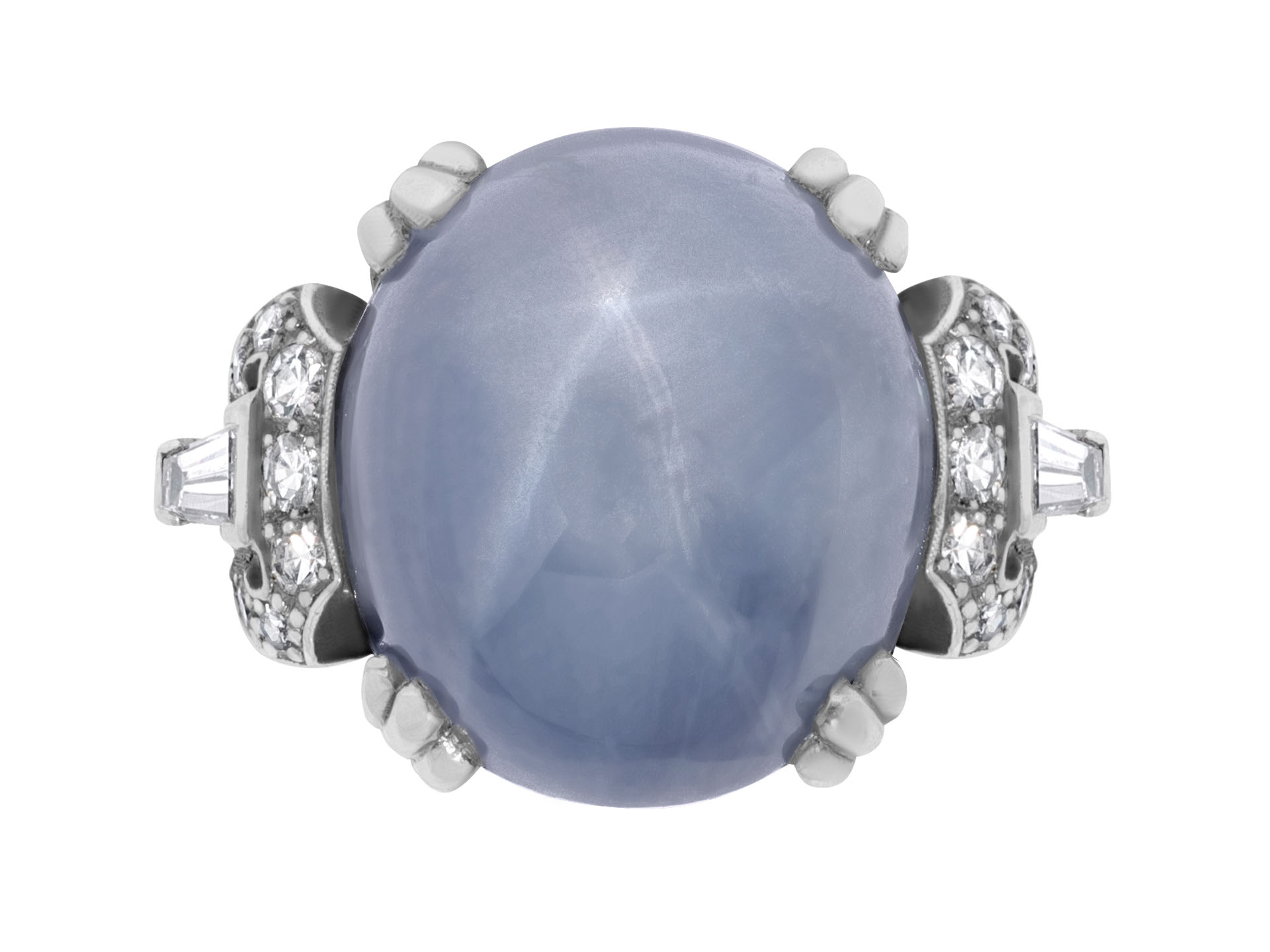 Ceylon star sapphire and diamond ring by J. Milhening. Centrally set with an oval cabochon natural no heat Ceylon star sapphire in an open back claw setting with an approximate weight of 30.00 carats, flanked by two tapered baguette cut diamonds in open back half rubover settings with an approximate combined weight of 0.40 carats, further adorned with fourteen round eight cut diamonds in open back grain settings with a combined weight of 0.50 carats. The total approximate diamond weight is 0.90 carats, to an impressive solitaire design featuring triple claw details, intricate scrollwork to the gallery and fancy open backholing, leading to raised trumpeting shoulders and flowing through to a solid D-shape shank. Marked platinum and iridium, maker's mark for J. Milhening. Inc, Chicago, American, circa 1950, accompanied by Gemmological Certification Services report #78153-47.