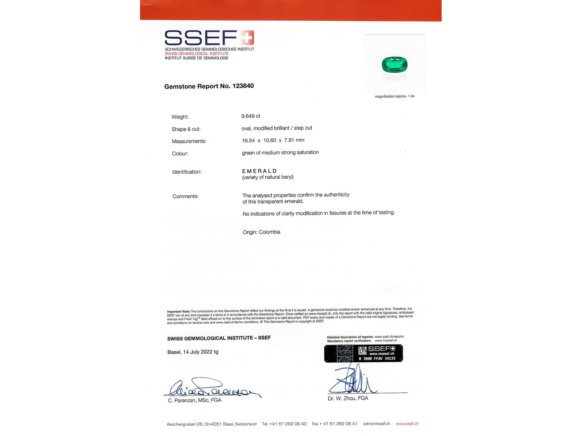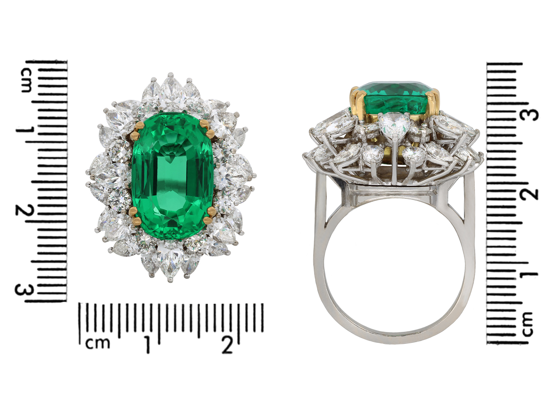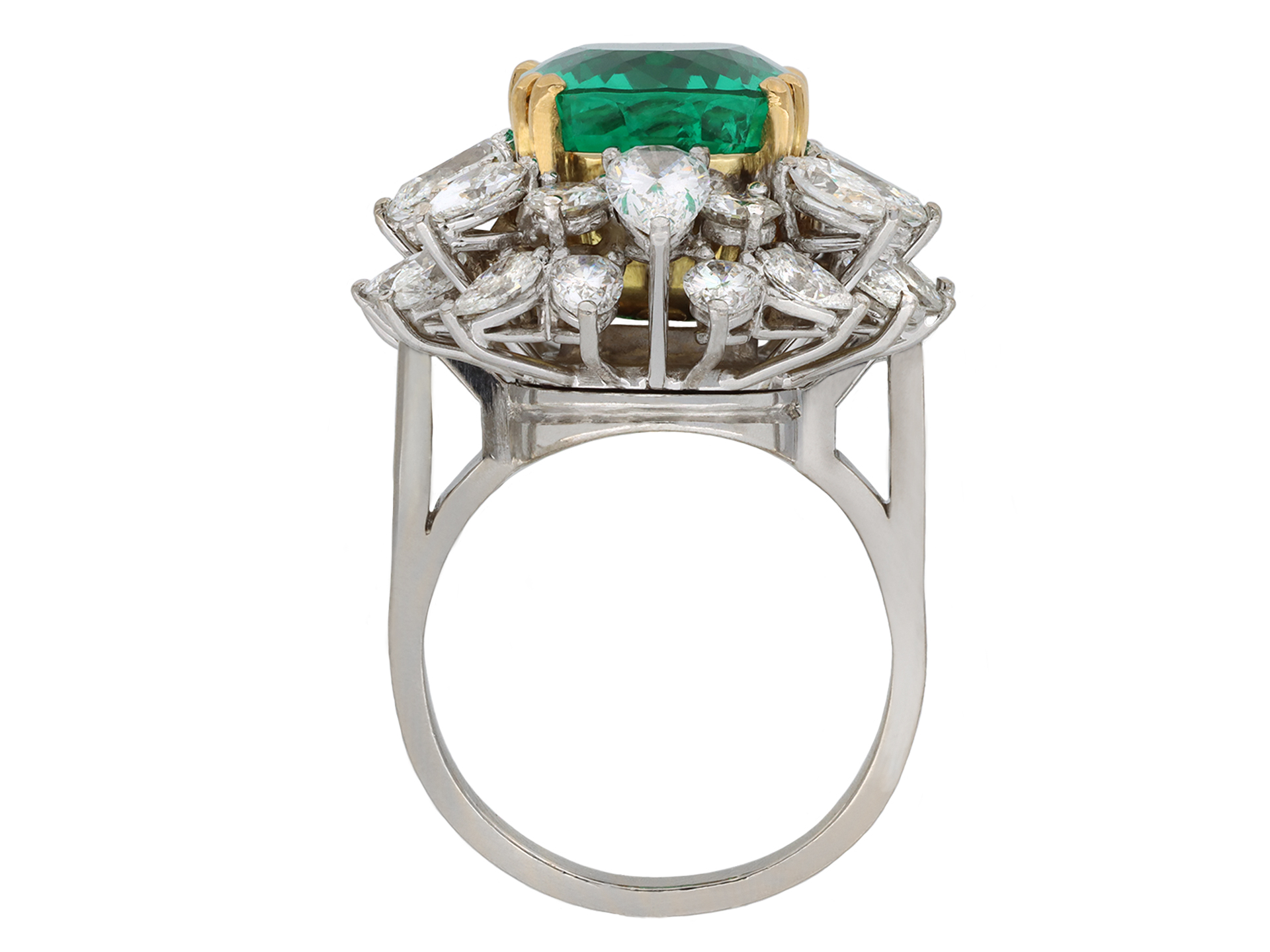 No oil Colombian emerald and diamond cluster ring. Set to centre with an oval mixed cut natural Colombian emerald, with no oil, in an open back claw setting with a weight of 9.65 carats, further set with twenty four drop shape brilliant cut diamonds in open back claw settings with a combined approximate weight of 4.20 carats, and decorated with eight round brilliant cut diamonds in open back claw settings with a combined weight of 0.80 carats. The total approximate diamond weight is 5.00 carats, to an impressive cluster design featuring split curving claws, a pierced structural gallery and open backholing, leading to raised shoulders and flowing through to a solid flat shank. Tested white gold and yellow gold, maker's mark 'B J', circa 1970, accompanied by Swiss Gemmological Institute (SSEF) report #123840, and Gemmological Certification Services report #5782-2276.