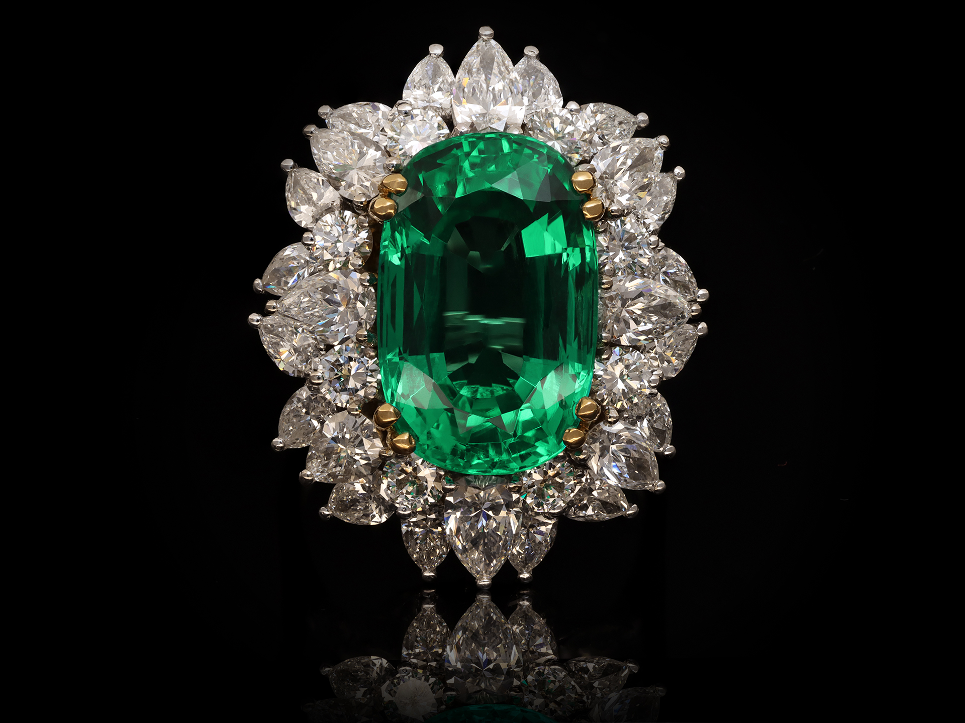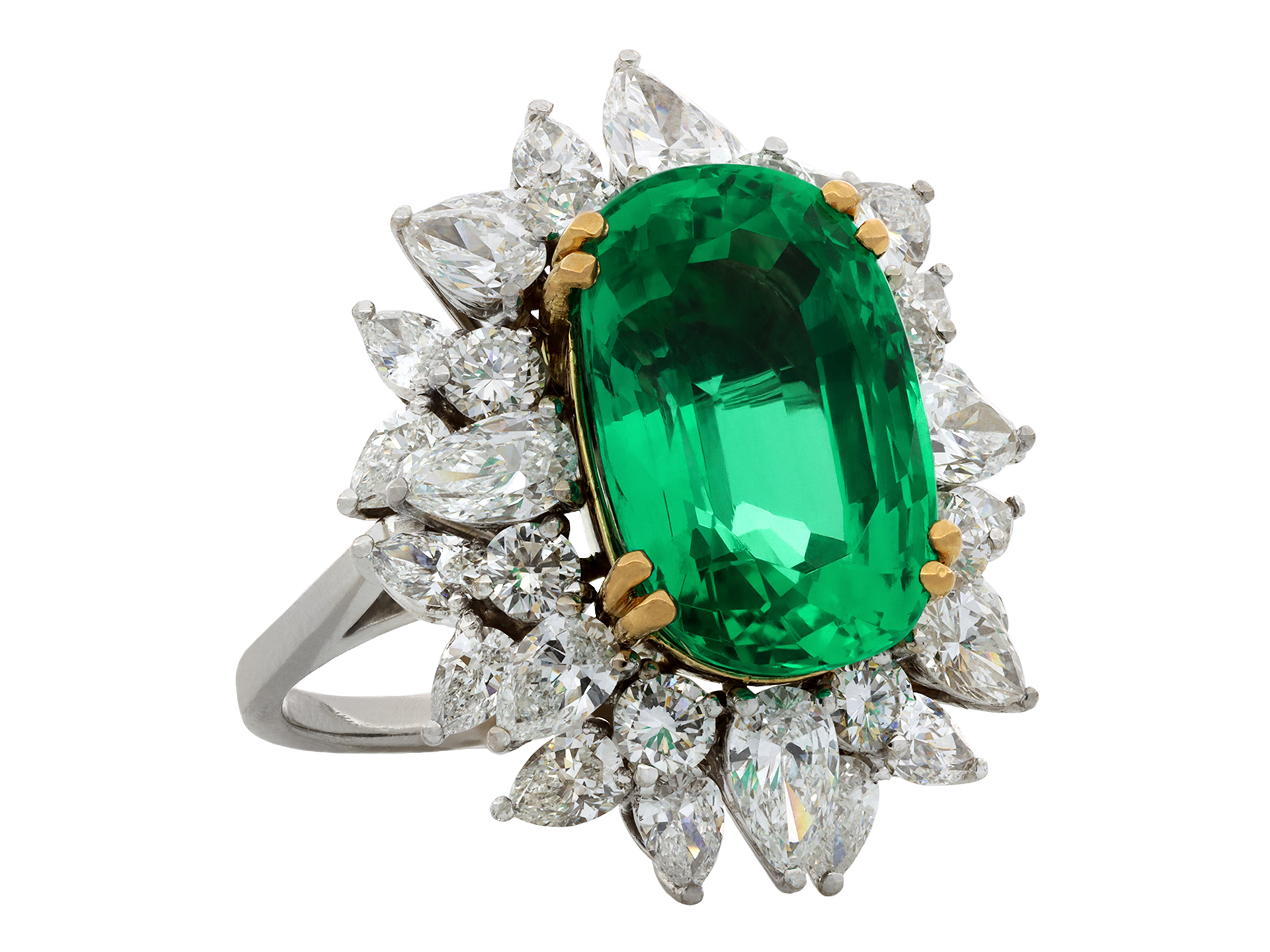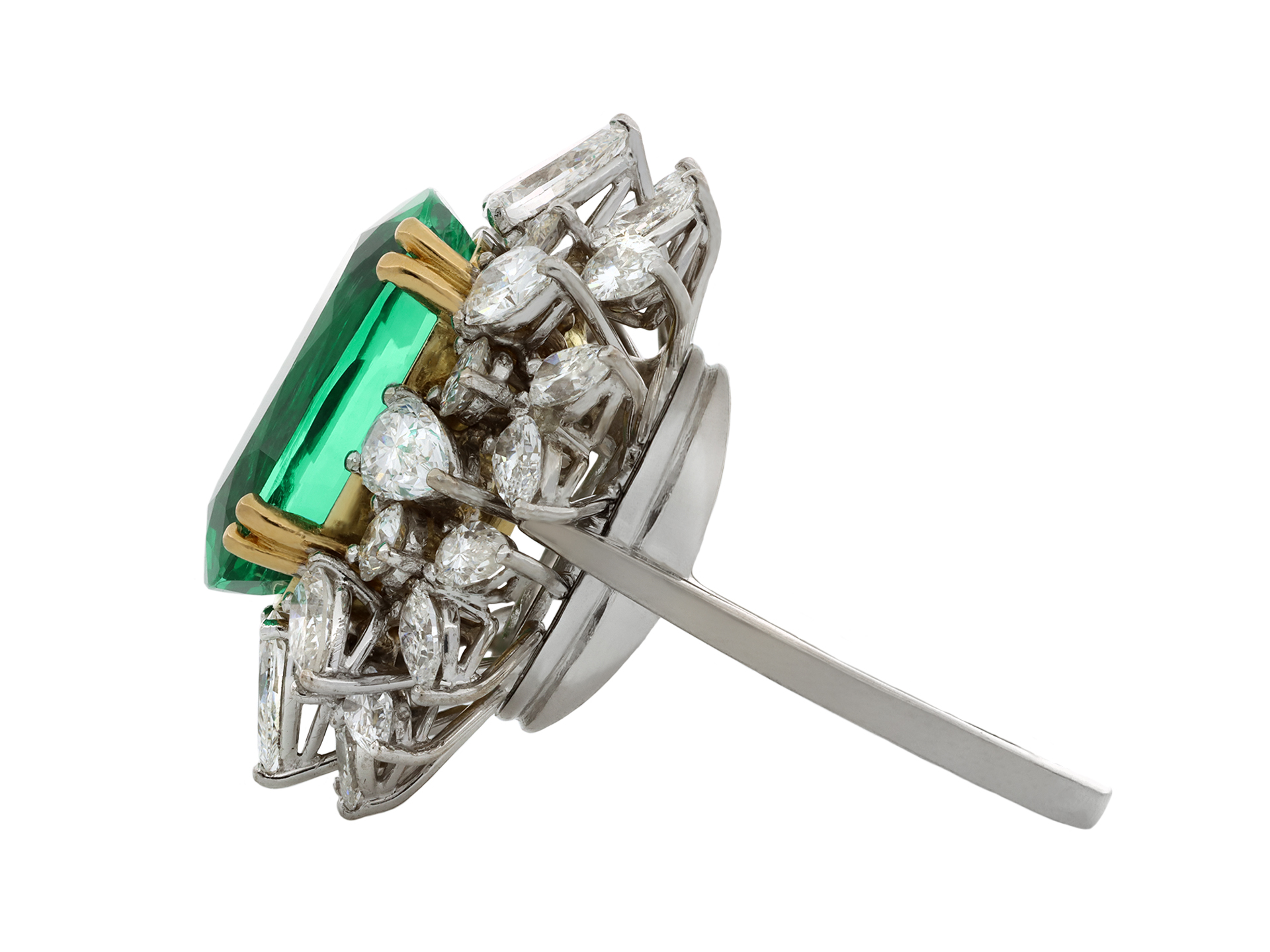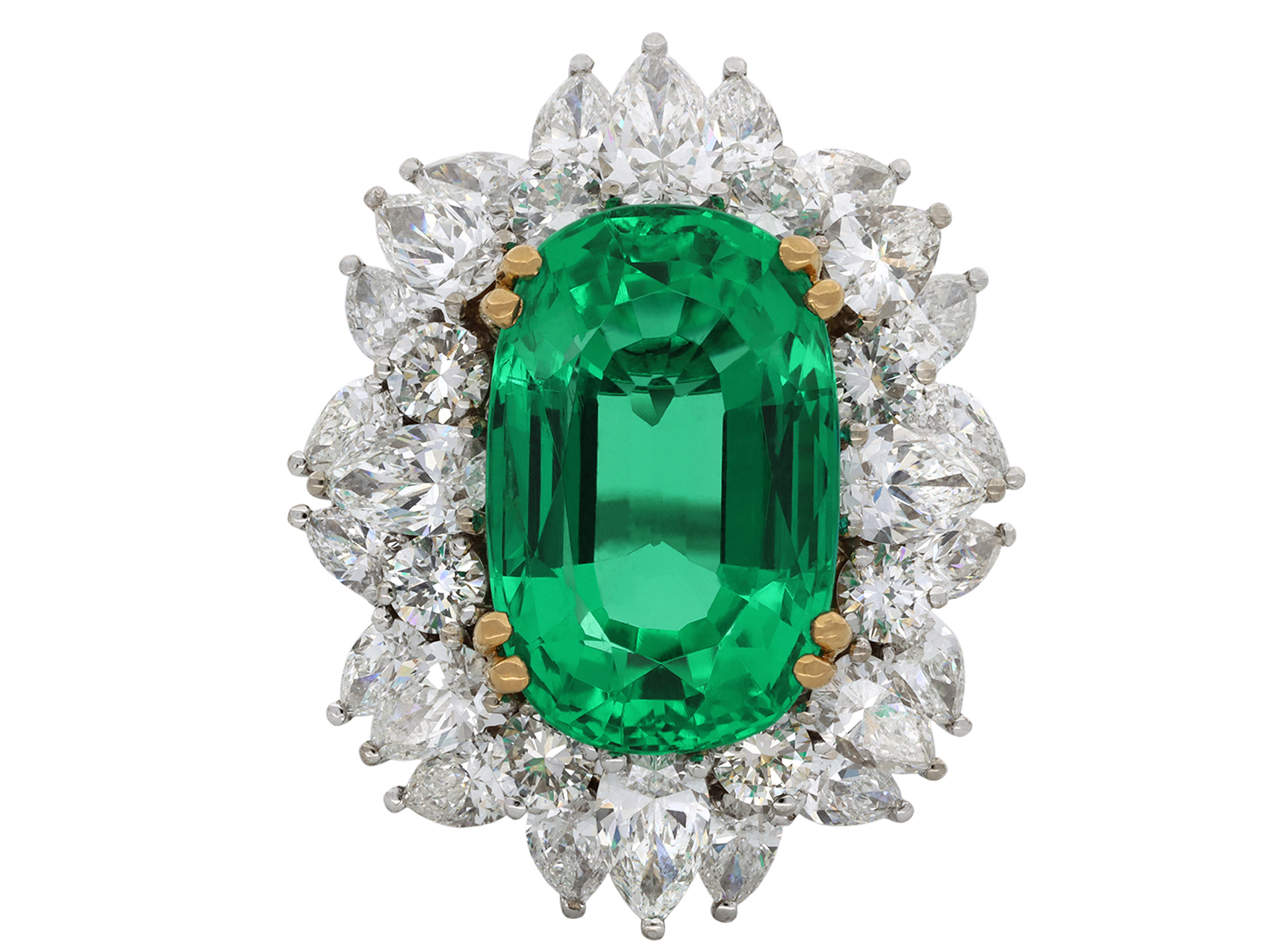 No oil Colombian emerald and diamond cluster ring. Set to centre with an oval mixed cut natural Colombian emerald, with no oil, in an open back claw setting with a weight of 9.65 carats, further set with twenty four drop shape brilliant cut diamonds in open back claw settings with a combined approximate weight of 4.20 carats, and decorated with eight round brilliant cut diamonds in open back claw settings with a combined weight of 0.80 carats. The total approximate diamond weight is 5.00 carats, to an impressive cluster design featuring split curving claws, a pierced structural gallery and open backholing, leading to raised shoulders and flowing through to a solid flat shank. Tested white gold and yellow gold, maker's mark 'B J', circa 1970, accompanied by Swiss Gemmological Institute (SSEF) report #123840, and Gemmological Certification Services report #5782-2276.