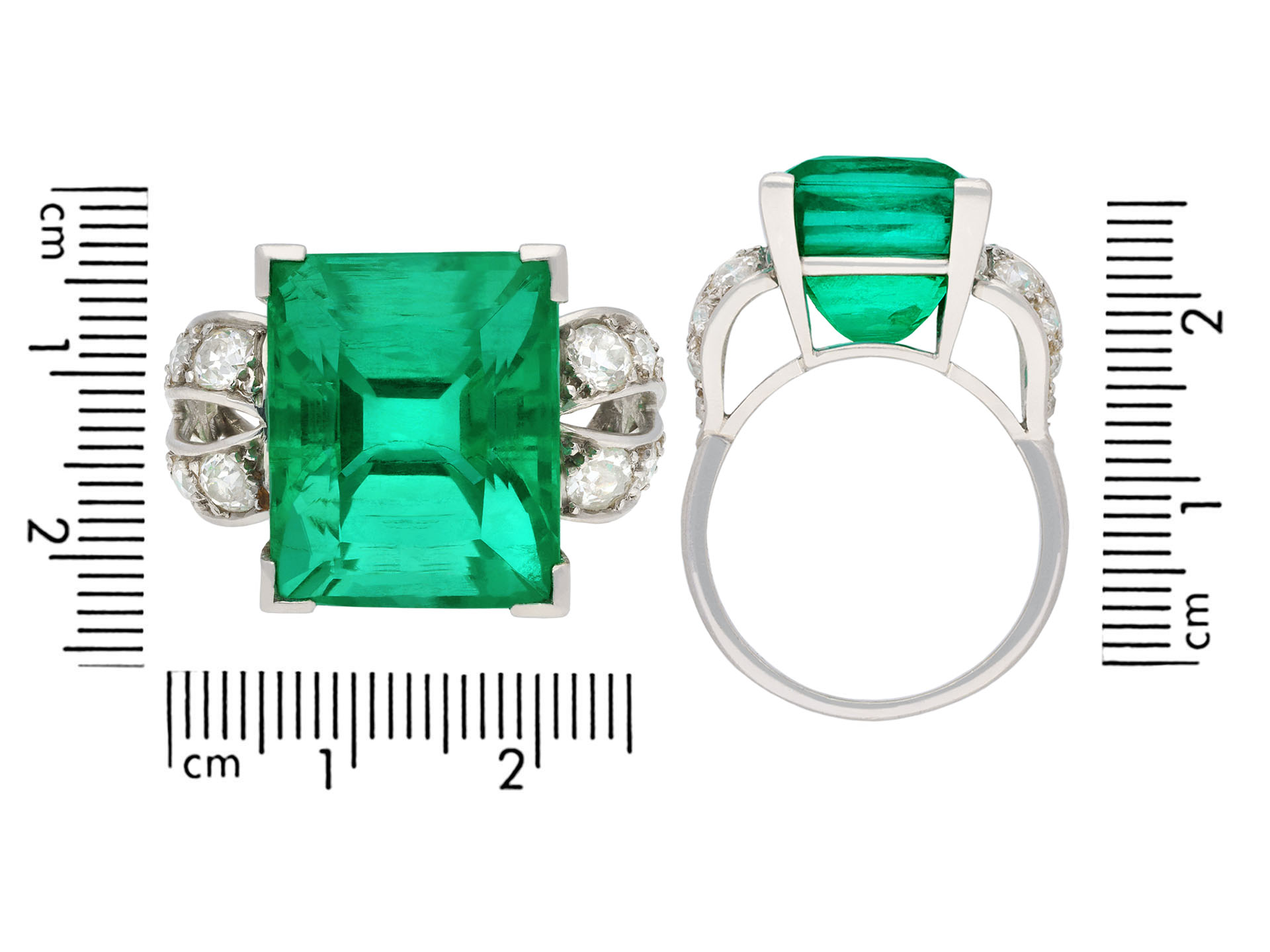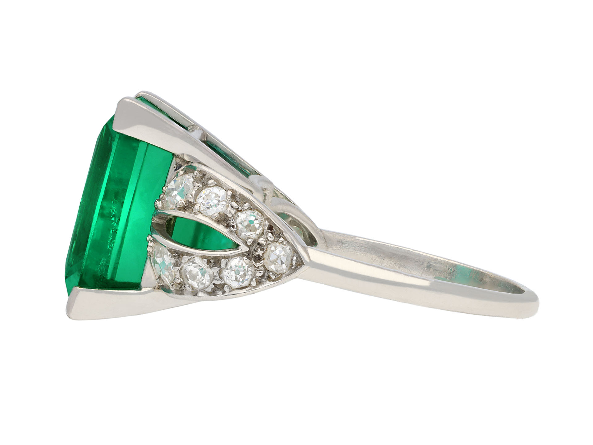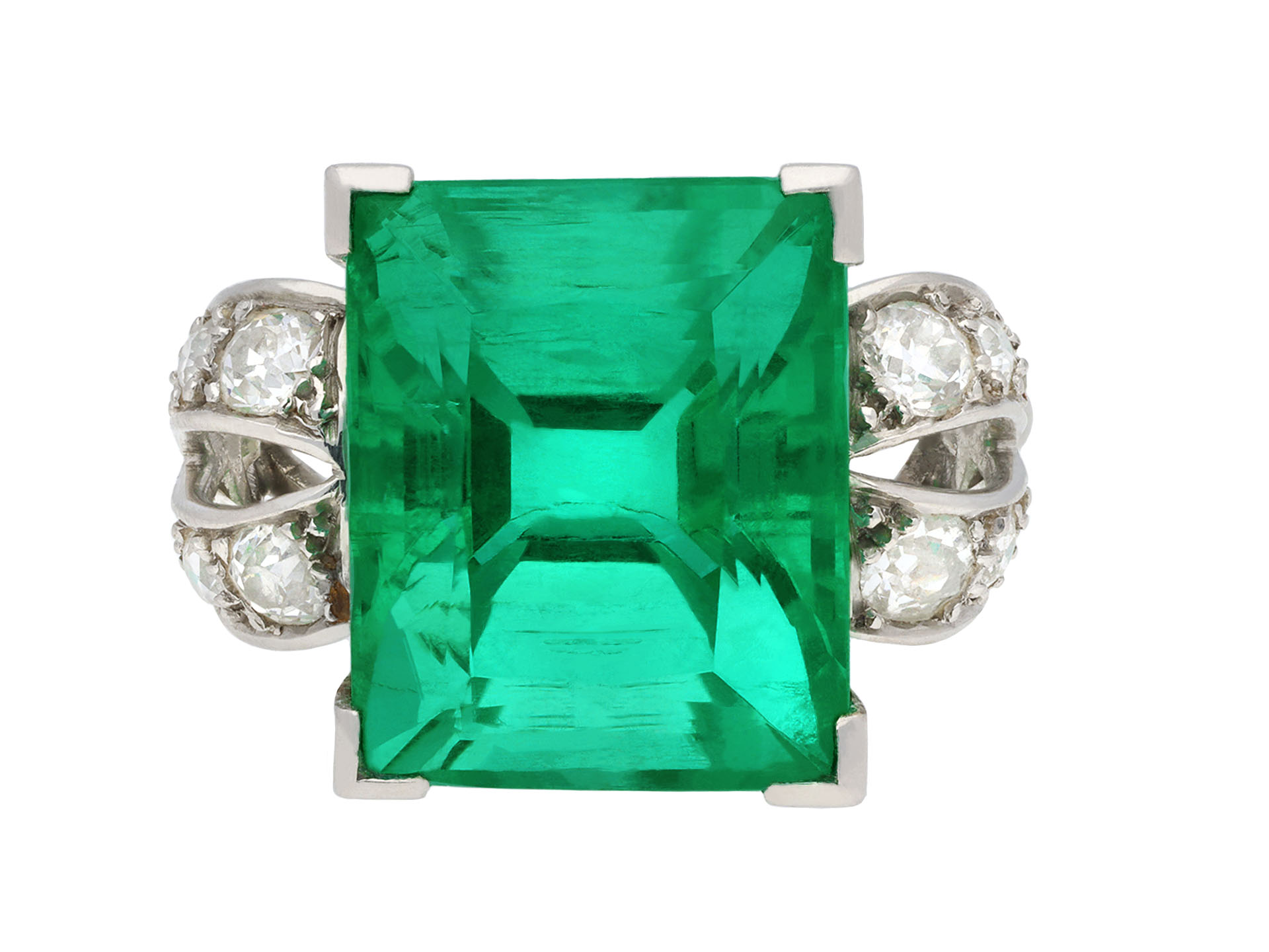 Colombian emerald and diamond ring. Set to centre with a rectangular emerald-cut natural Colombian emerald with minor oil in an open back claw setting with an approximate weight of 14.00 carats, flanked by fourteen cushion shape old mine diamonds in open back grain settings with a combined approximate weight of 1.15 carats, to an impressive flanked solitaire design featuring polished edges, a structural gallery and fancy shape open backholing, leading to raised shoulders and f4lowing through to a solid D-shape shank. Tested platinum, signed 's. Cartier' for stock for Cartier, circa 1925, accompanied by Gemmological Certification Services report # 5783-966 and SSEF report #146639.