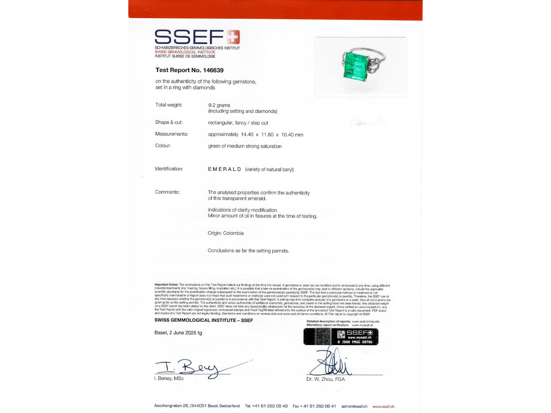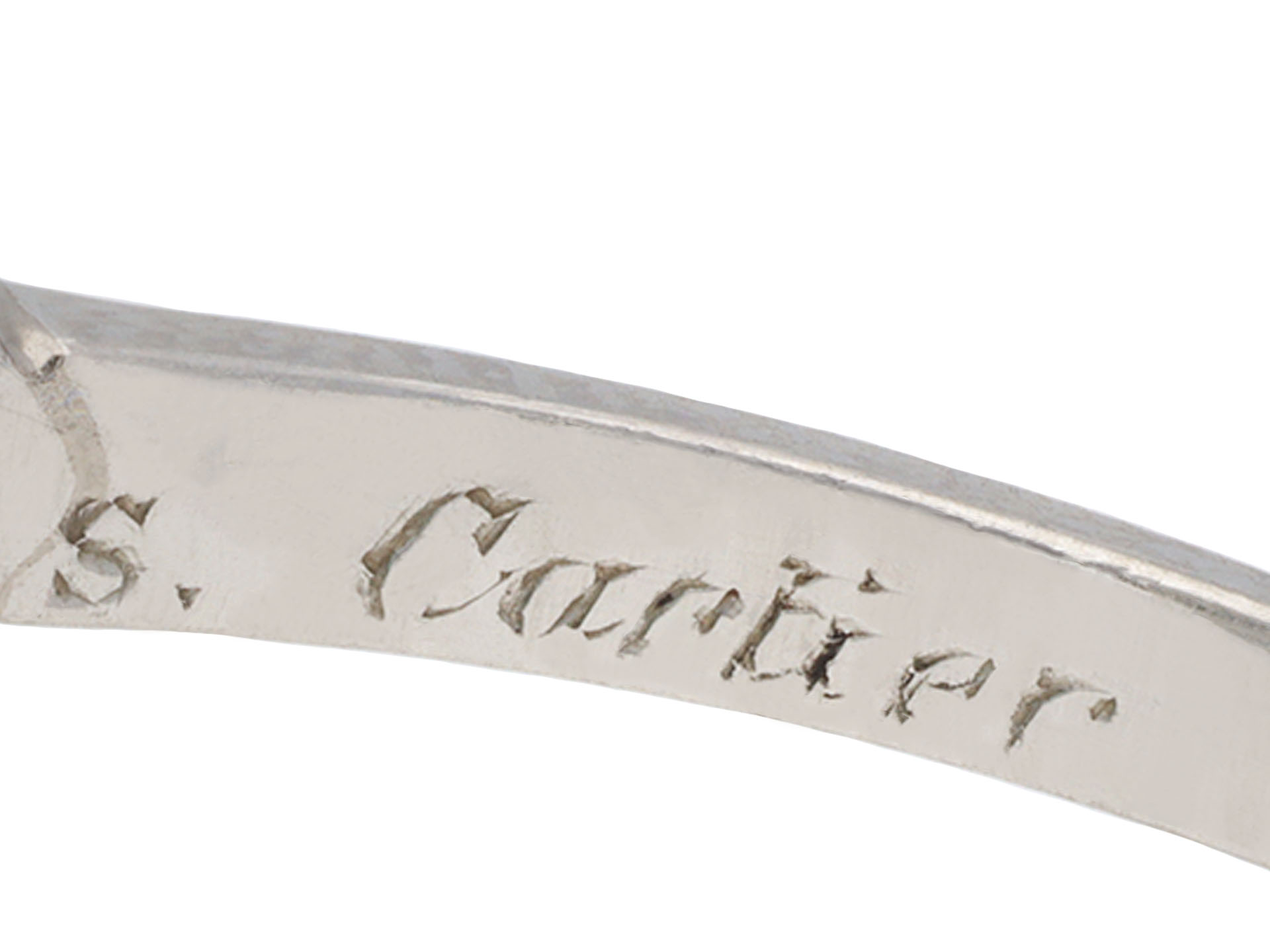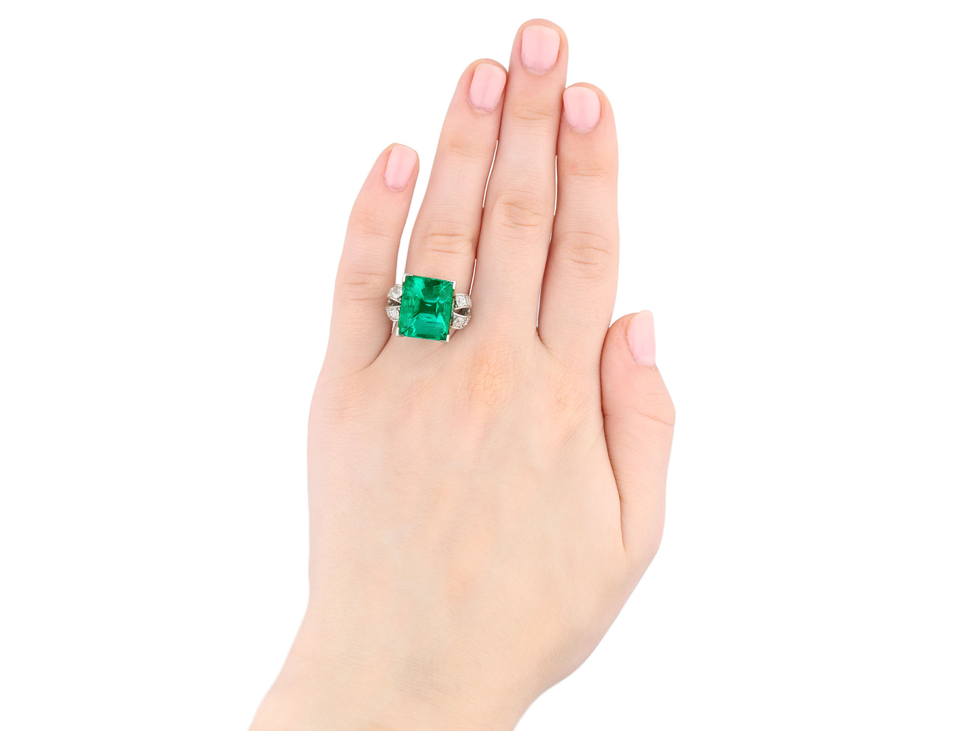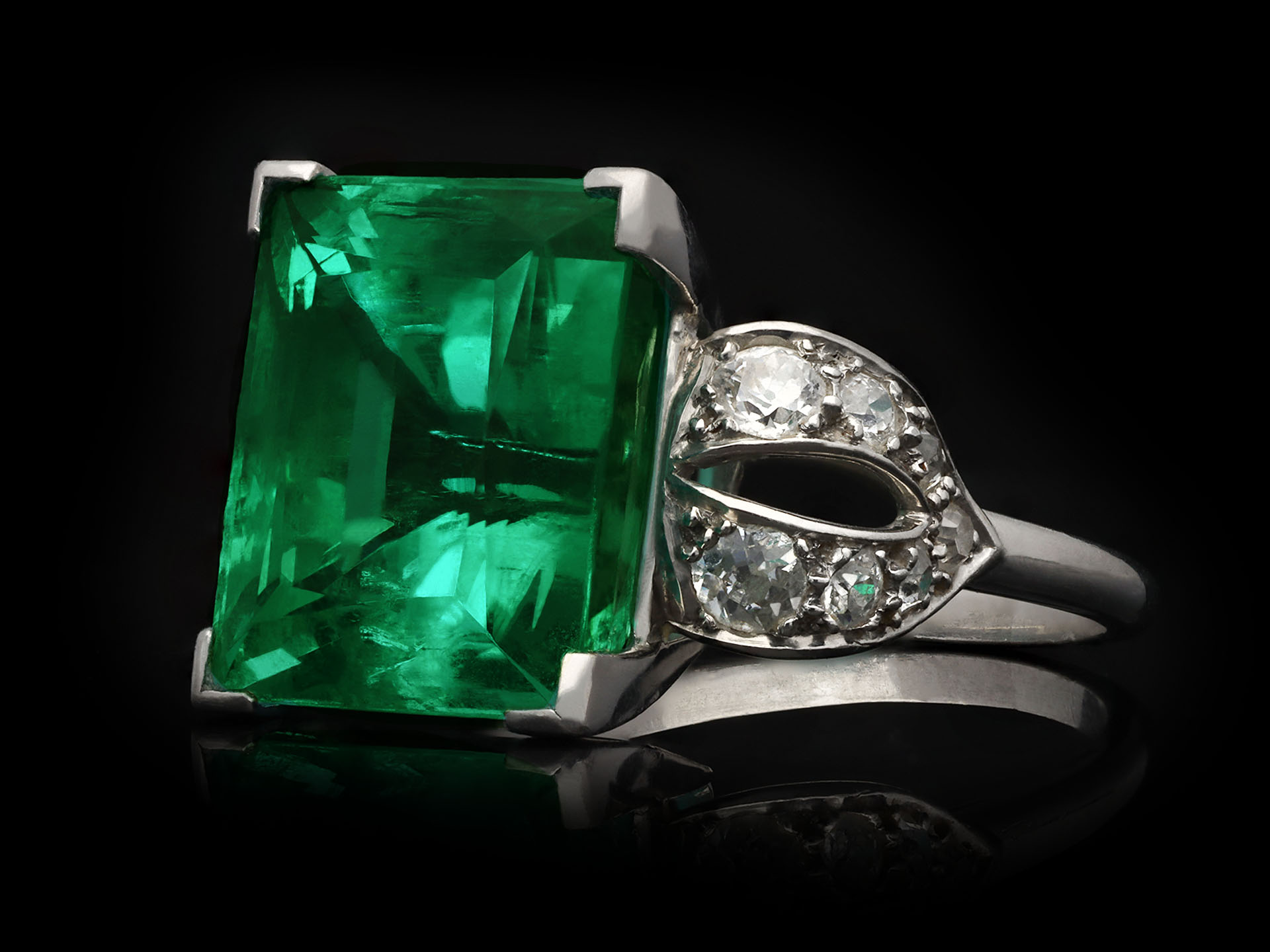 Colombian emerald and diamond ring. Set to centre with a rectangular emerald-cut natural Colombian emerald with minor oil in an open back claw setting with an approximate weight of 14.00 carats, flanked by fourteen cushion shape old mine diamonds in open back grain settings with a combined approximate weight of 1.15 carats, to an impressive flanked solitaire design featuring polished edges, a structural gallery and fancy shape open backholing, leading to raised shoulders and f4lowing through to a solid D-shape shank. Tested platinum, signed 's. Cartier' for stock for Cartier, circa 1925, accompanied by Gemmological Certification Services report # 5783-966 and SSEF report #146639.