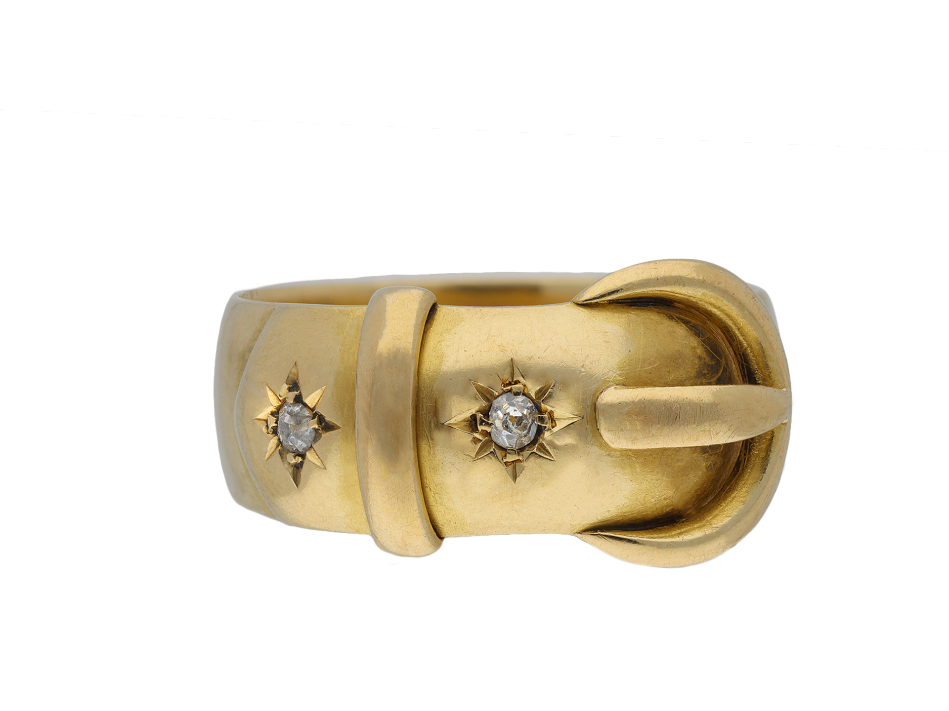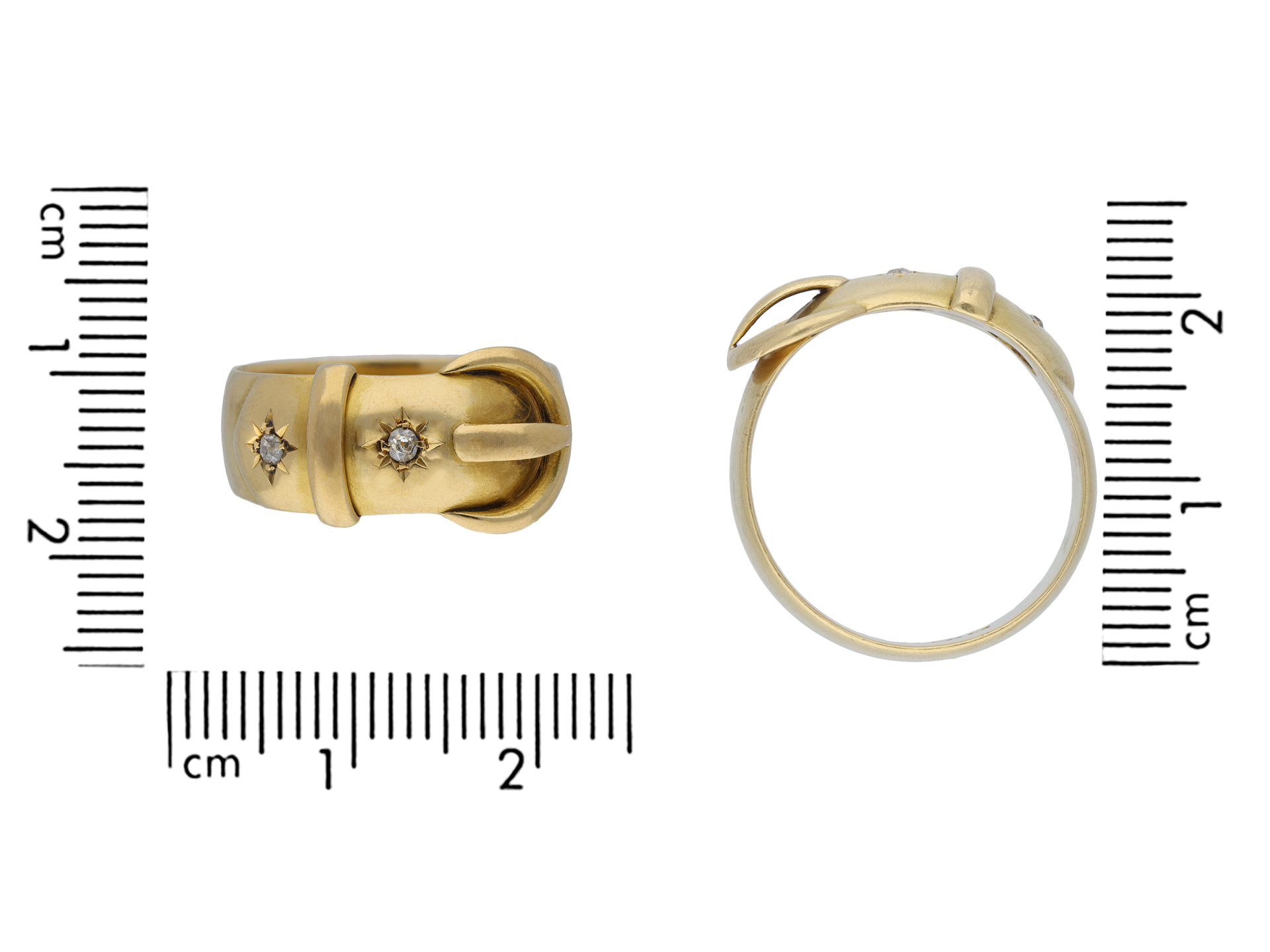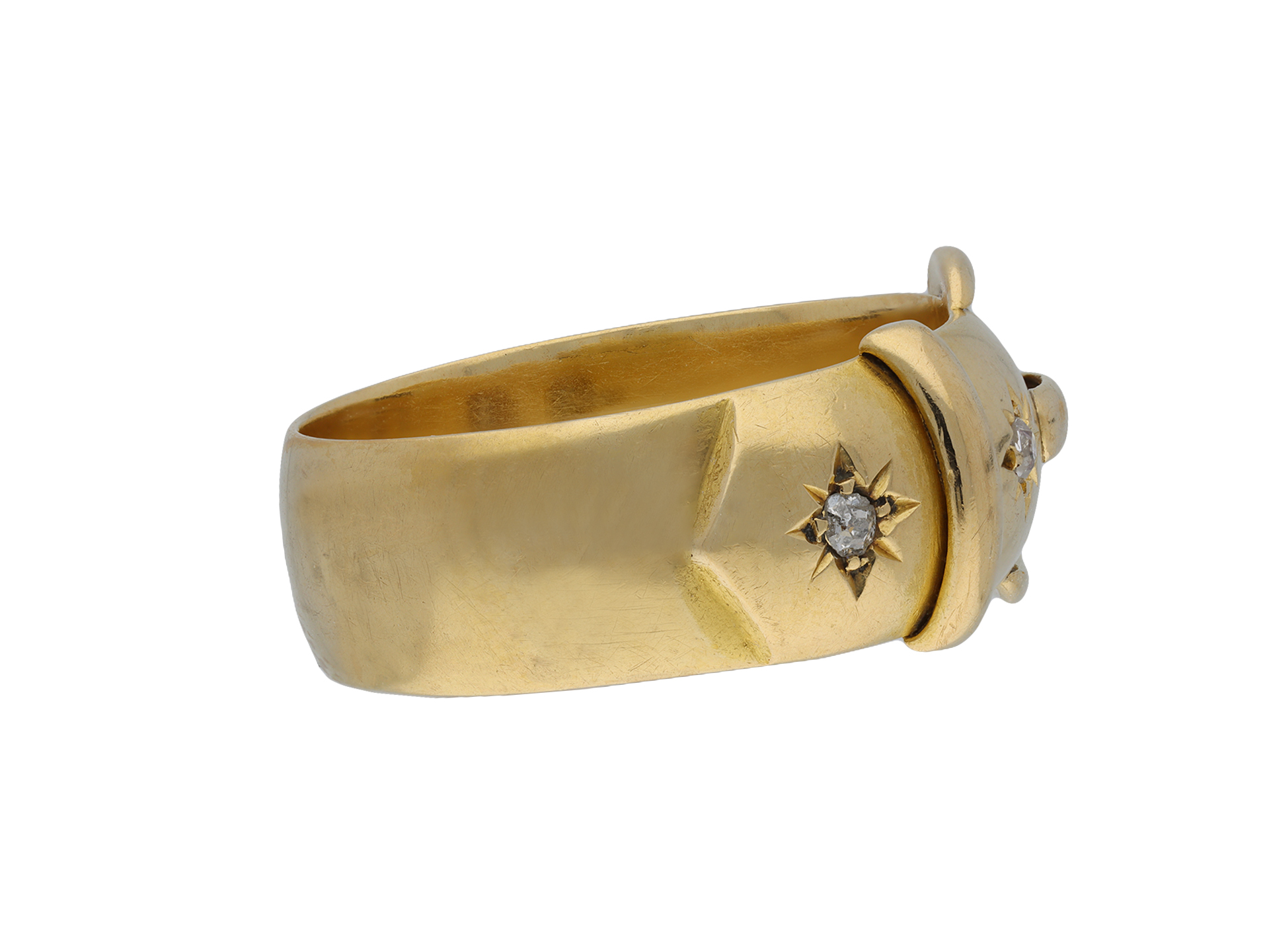 Diamond buckle ring. Set with two round eight-cut diamonds in an open back grain set star-shaped setting with an approximate weight of 0.06 carats. To a buckle ring design featuring polished edges and circular open backholing, flowing through to a solid D-shape shank. Marked 18 carat yellow gold, full hallmarks for Chester, English, circa 1900.