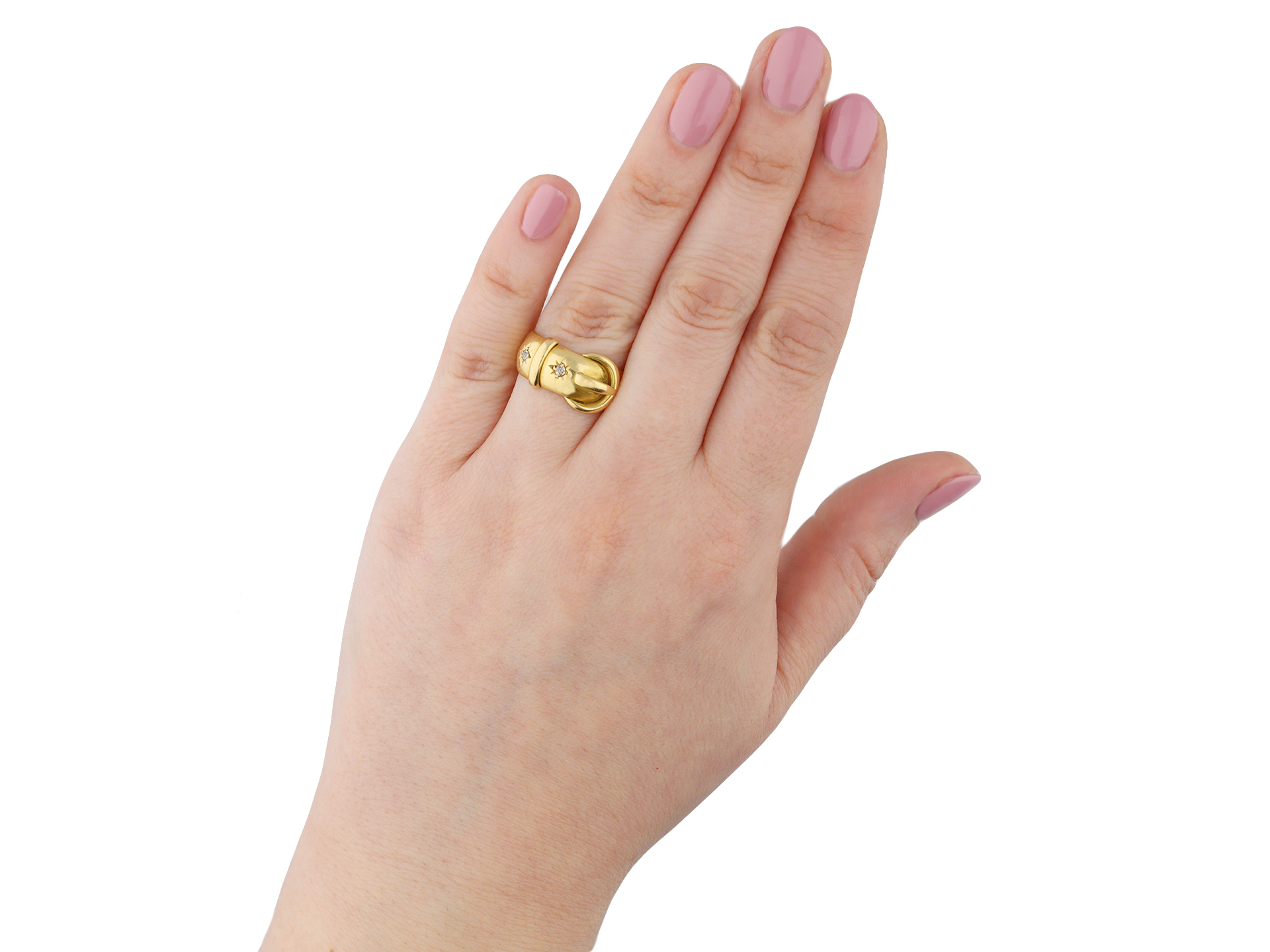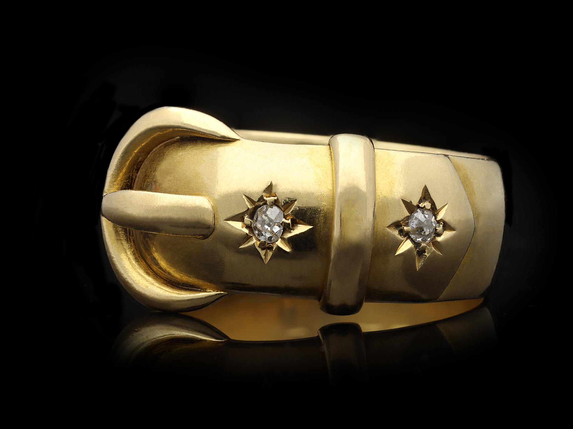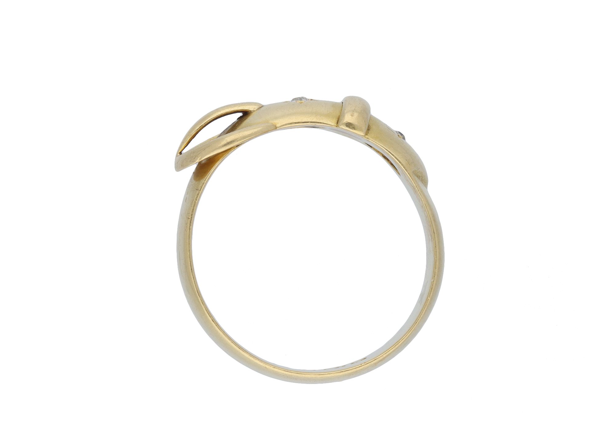 Diamond buckle ring. Set with two round eight-cut diamonds in an open back grain set star-shaped setting with an approximate weight of 0.06 carats. To a buckle ring design featuring polished edges and circular open backholing, flowing through to a solid D-shape shank. Marked 18 carat yellow gold, full hallmarks for Chester, English, circa 1900.