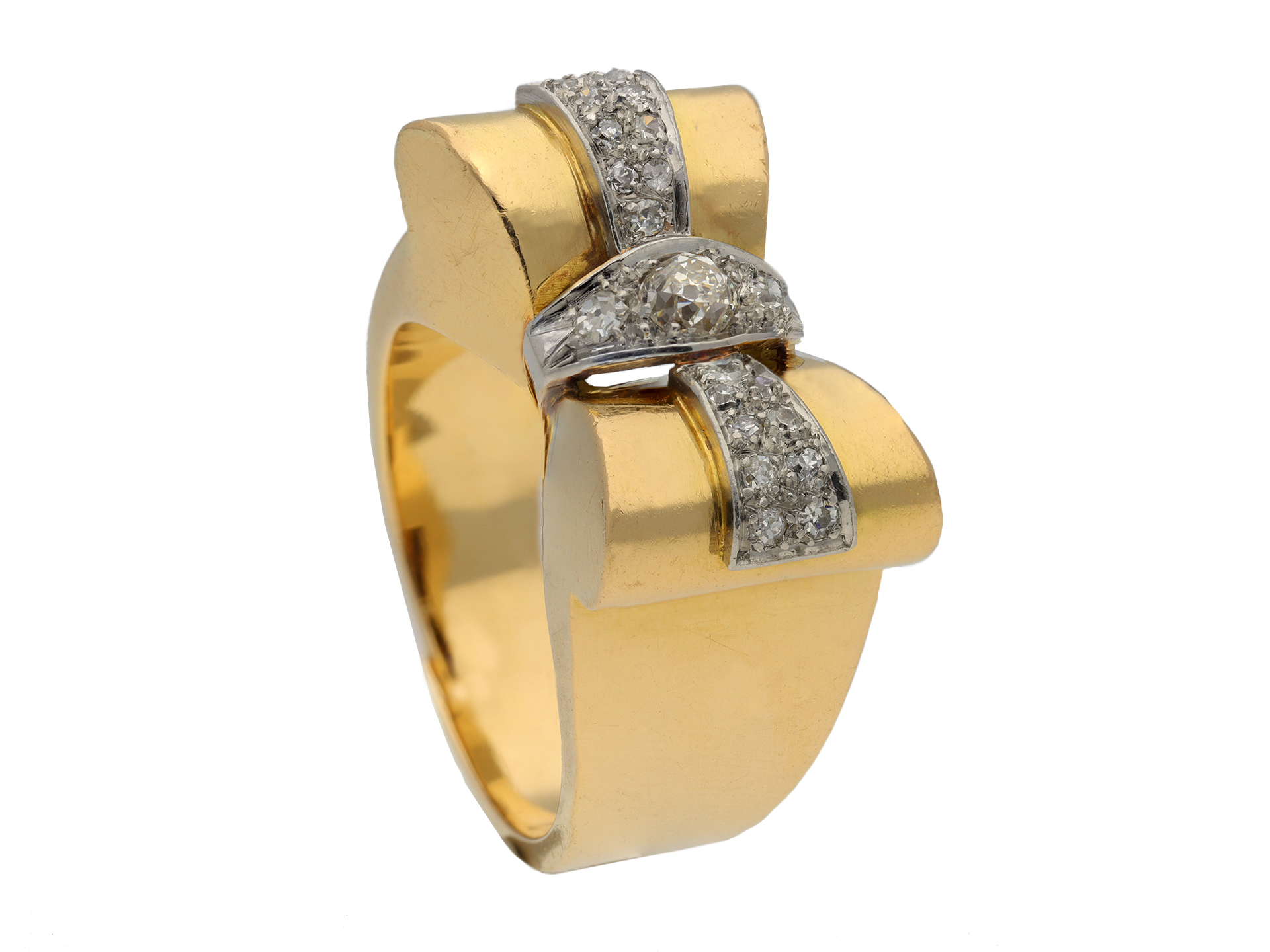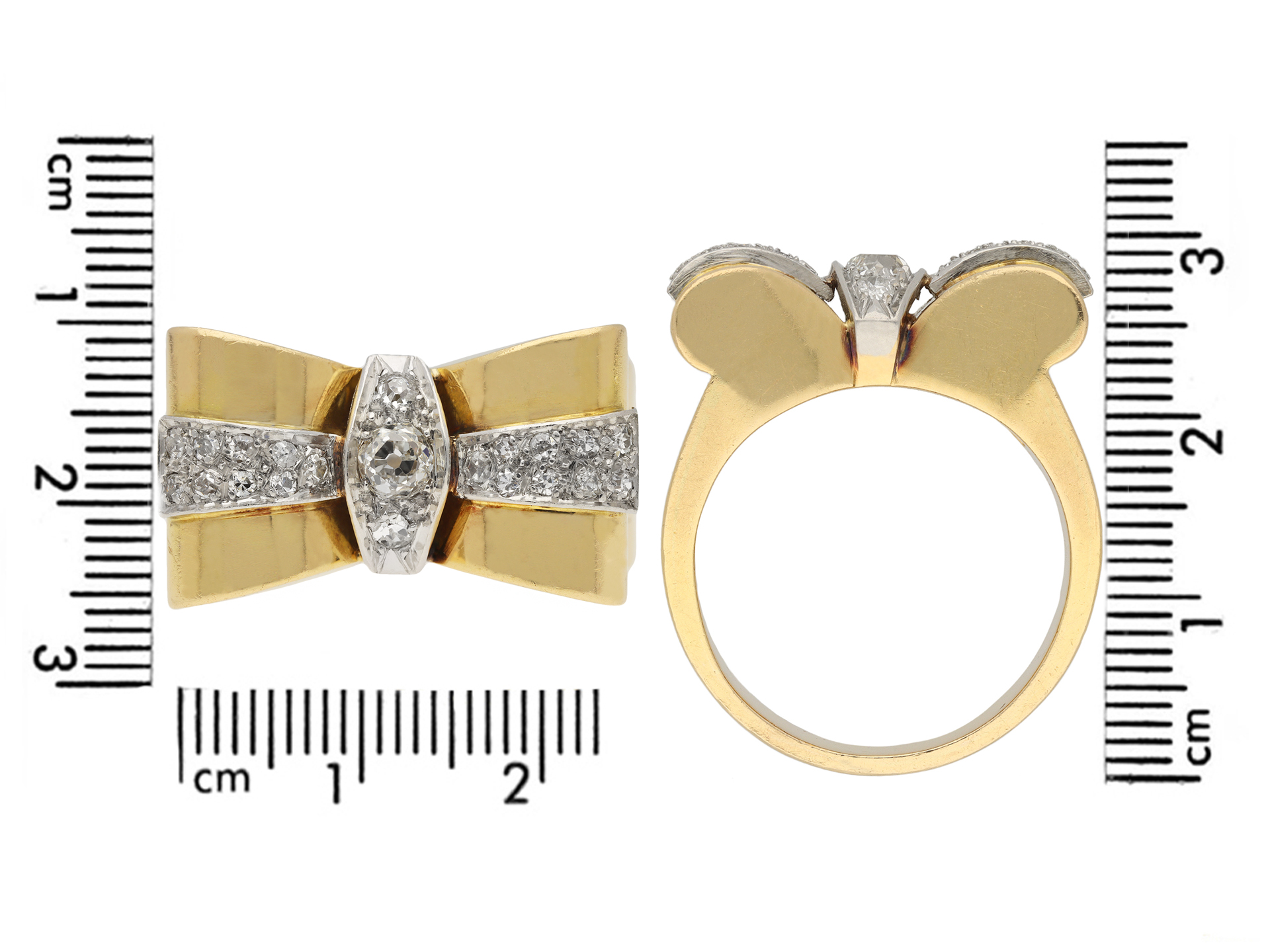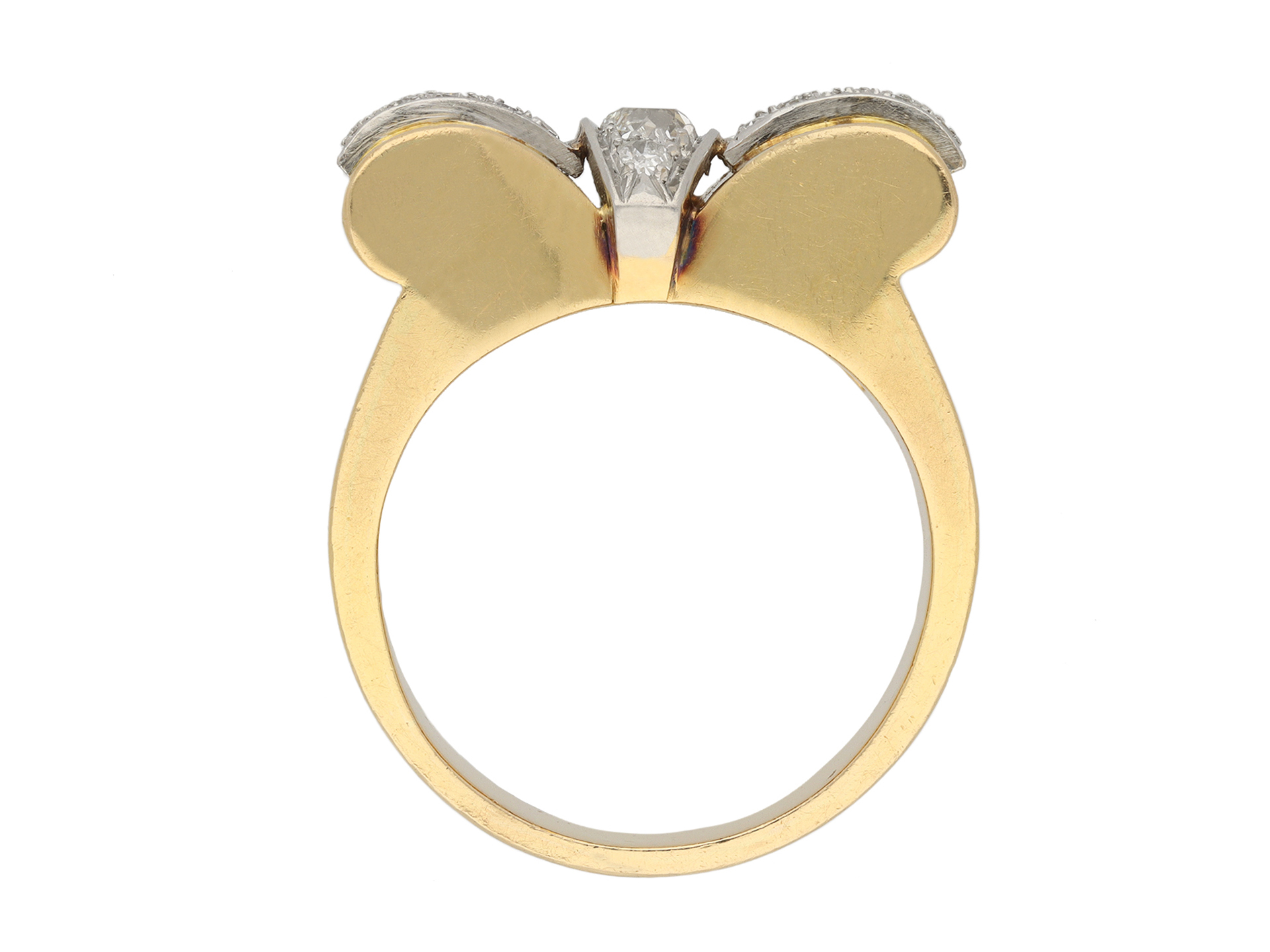Diamond cocktail ring. Set with twenty one round old cut diamonds in open back grain settings with a combined approximate weight of 0.80 carats, to an impressive cocktail ring in the form of a bow, featuring polished edges and open backholing, the heavy integrated shoulders tapering to a solid D-shape shank. Tested yellow gold and platinum, circa 1940.