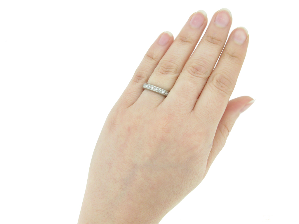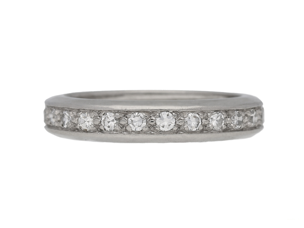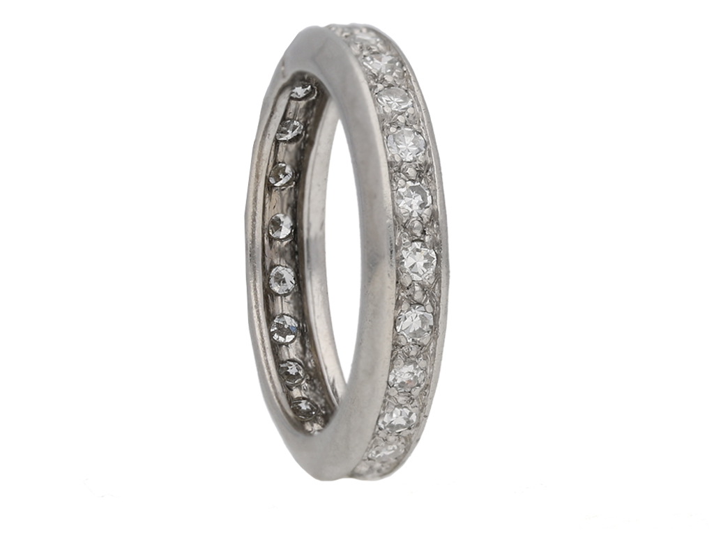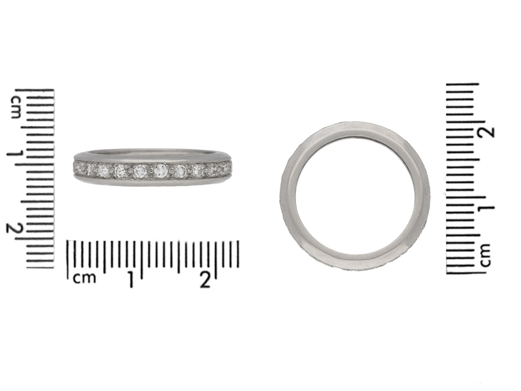 Diamond eternity ring. Set with twenty-four round eight cut diamonds in open back grain settings with a combined approximate weight of 0.75 carats, to a smoothly conforming eternity band with champfered edging and circular backholing, approximately 3.9mm in width. Marked platinum, indistinct maker's mark, French, circa 1950.