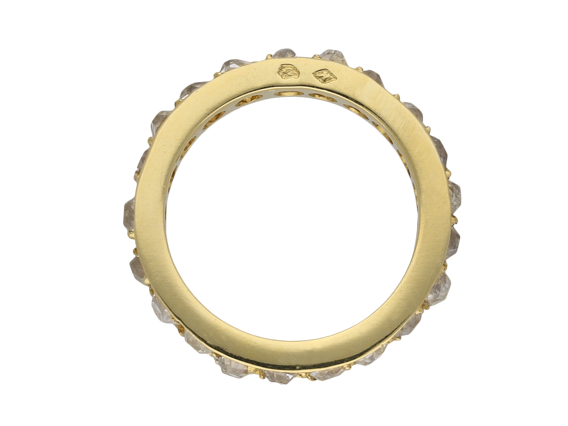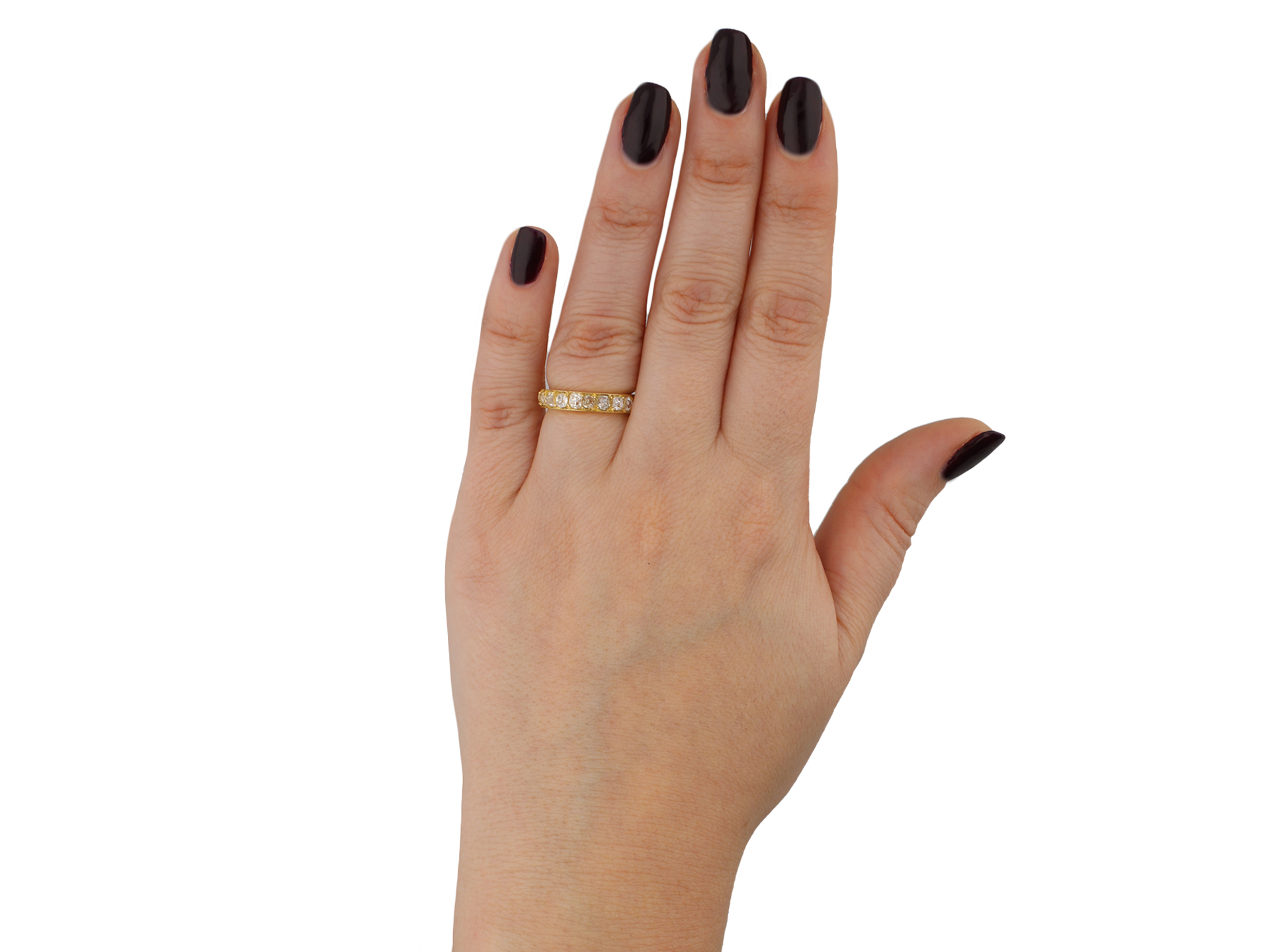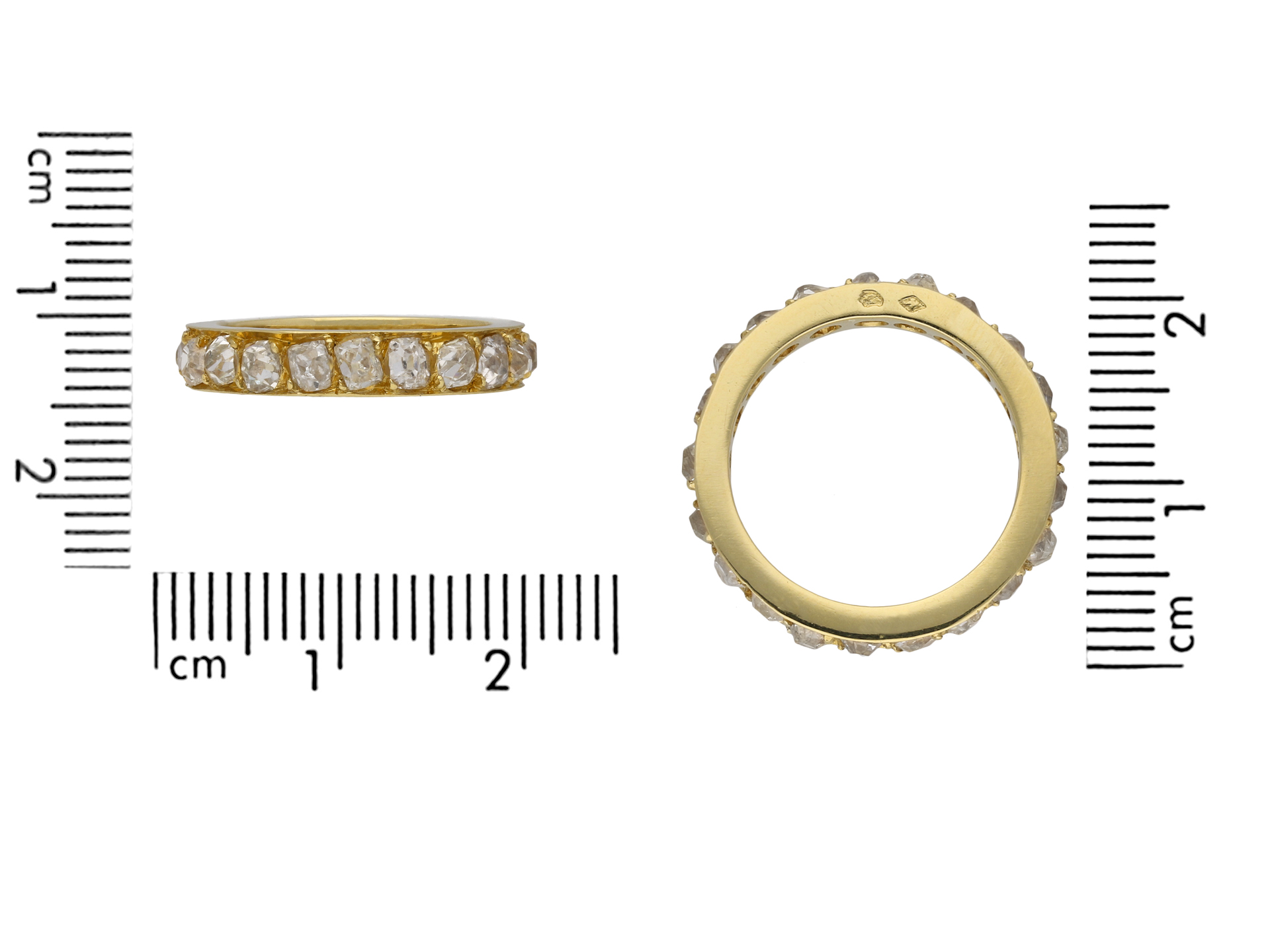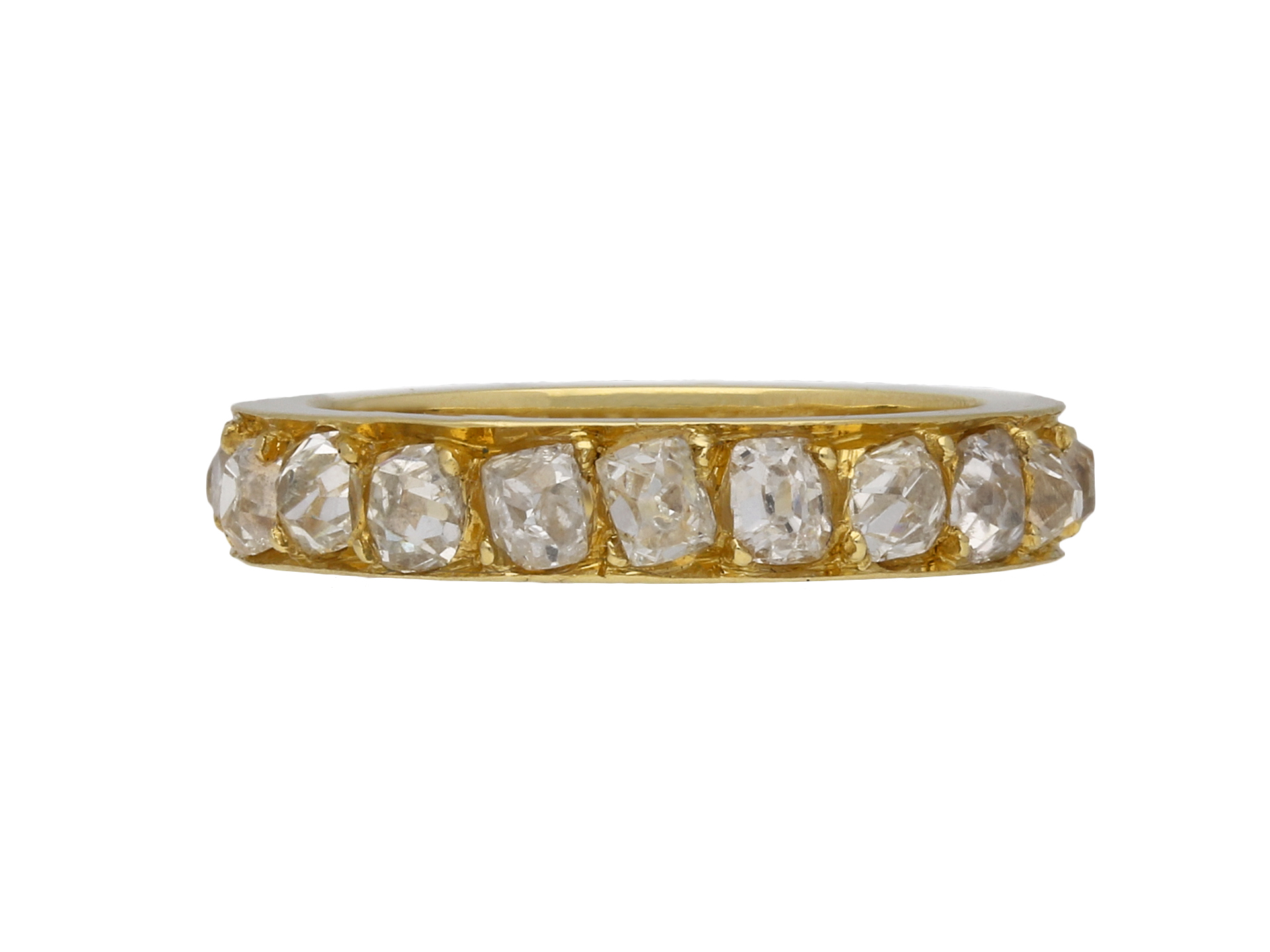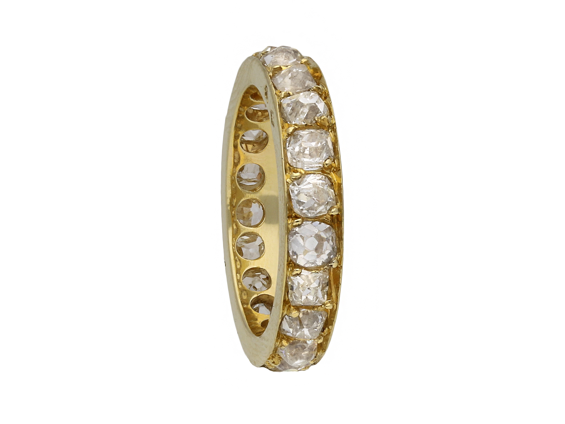 Diamond full eternity band. Set with twenty one cushion shape old mine cut diamonds in open back grain settings with an approximate combined weight of 2.75 carats, to a smoothly conforming full eternity band featuring polished edges and circular open backholing, approximately 3.5mm in width. Marked 18 carat yellow gold, indistinct maker's mark, French, circa 1940.