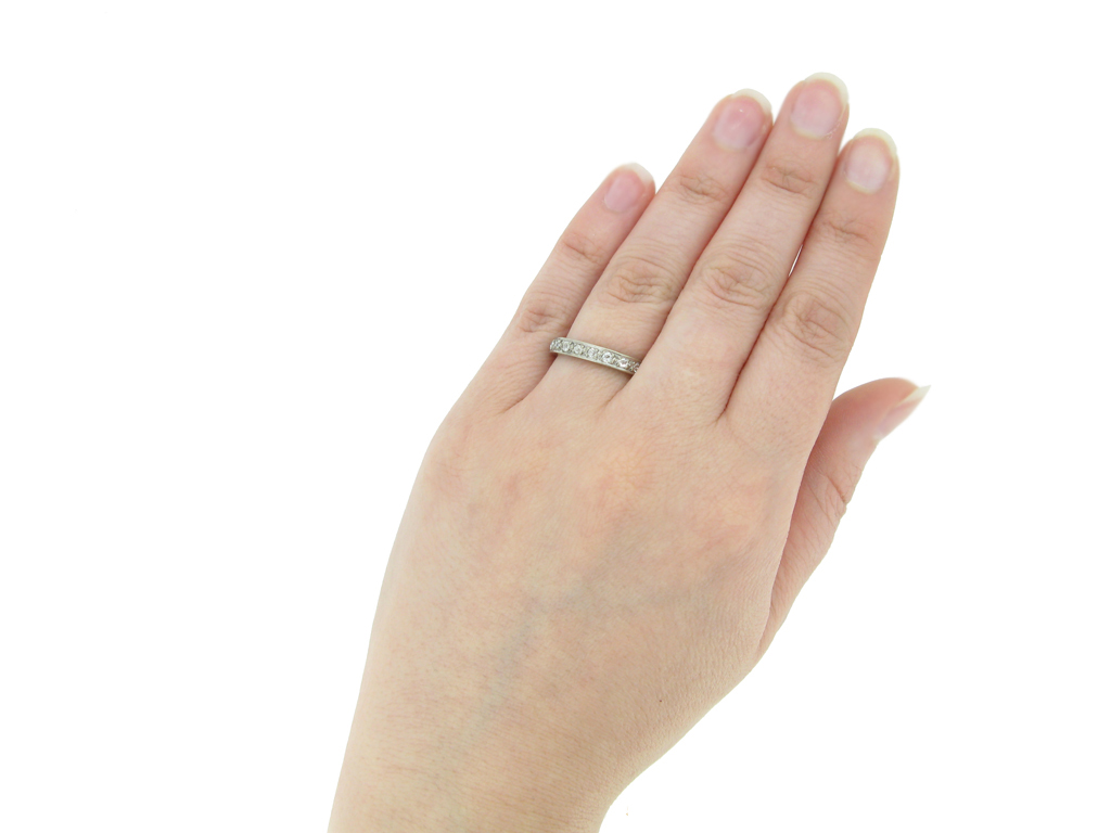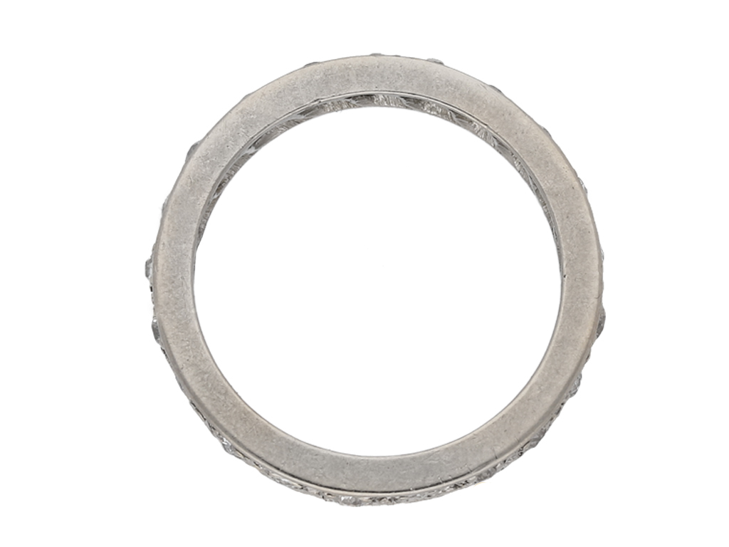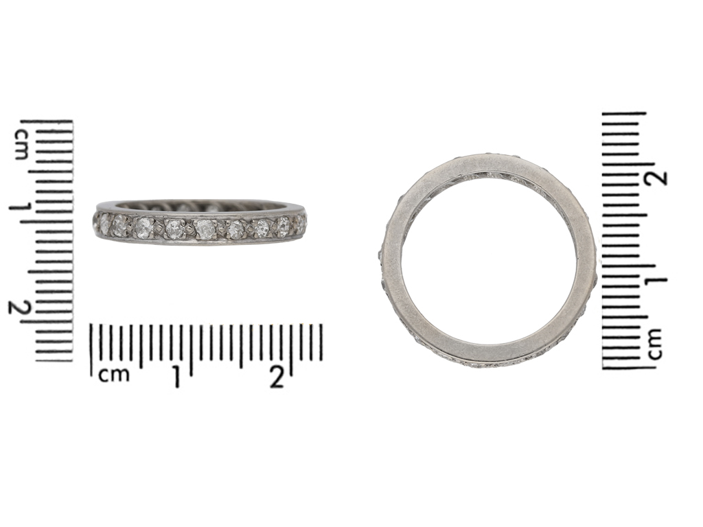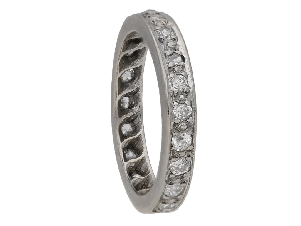 Diamond set eternity ring in platinum. Set with twenty one round old cut diamonds in open back grain settings with an approximate combined approximate weight of 0.60 carats, to a smoothly conforming eternity band with polished borders and intricately pierced rope open backholing, approximately 3mm in width. Tested platinum, circa 1935.