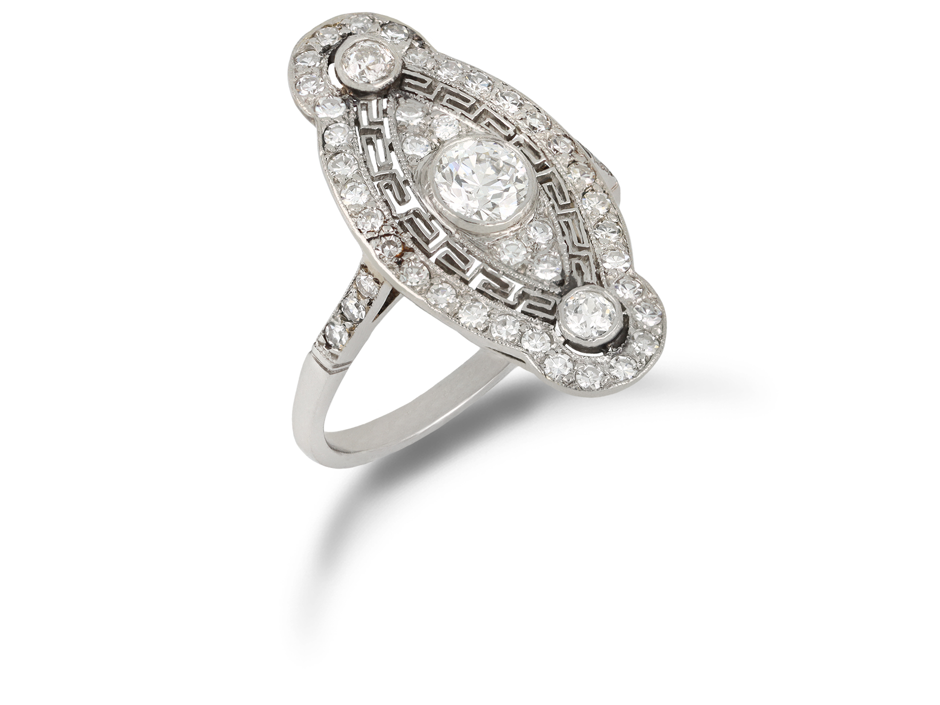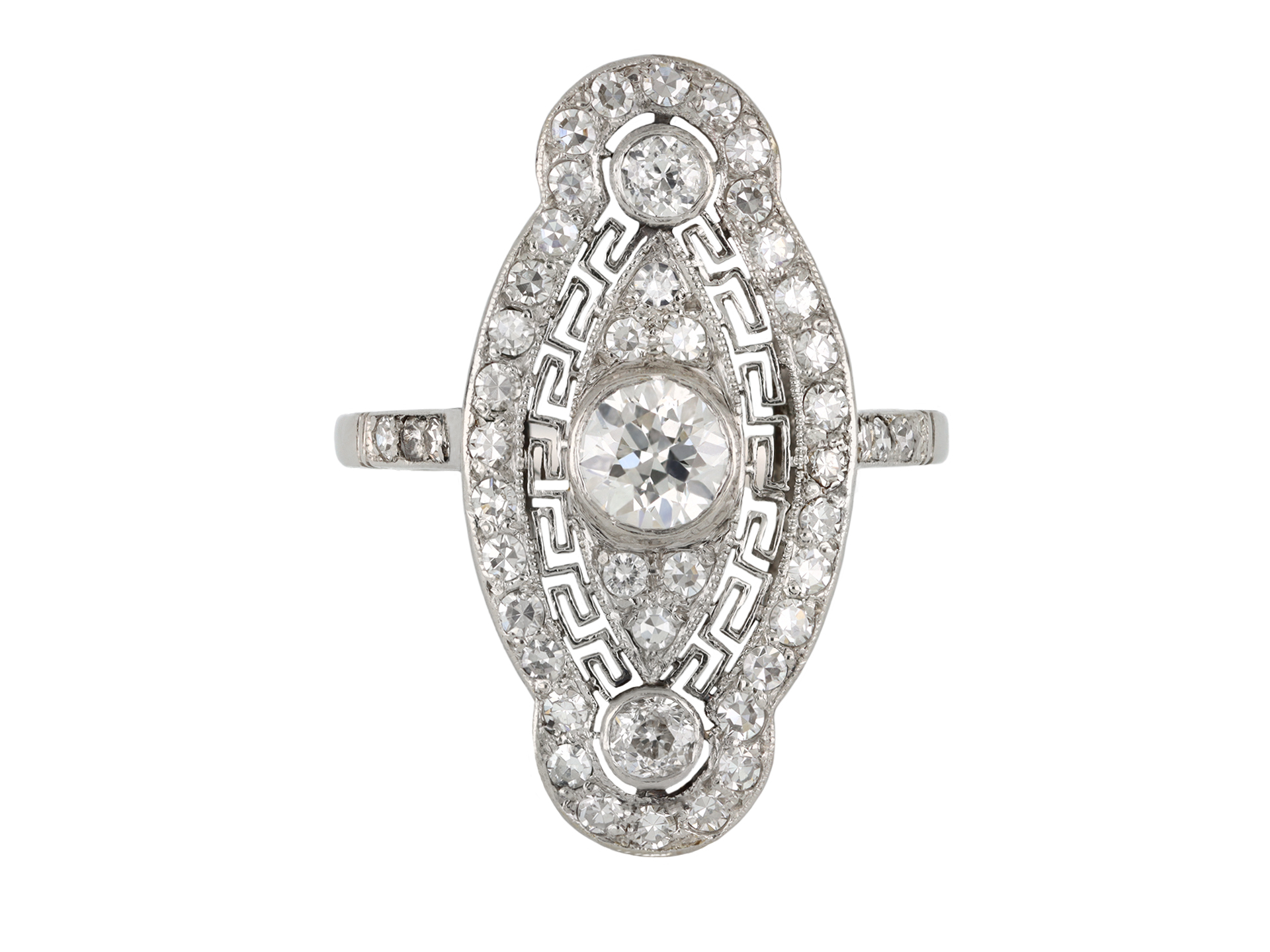 Edwardian diamond cluster ring. Set vertically with three round old cut diamonds in open back rubover settings with an approximate combined weight of 0.50 carats, further decorated with six round eight cut diamonds in open back gain settings with a combined weight of 0.06 carats, bordered by forty round eight cut diamonds in open back grain settings with a combined weight of 0.60 carats. The total approximate diamond weight is 1.16 carats, to an openwork cluster design featuring a Greek key motif with millegrain edging, a decoratively pierced gallery with scrolling details and open backholing, leading to raised ridged shoulders and flowing through to a solid D-shape shank. Tested platinum, numbered '46397', circa 1915.