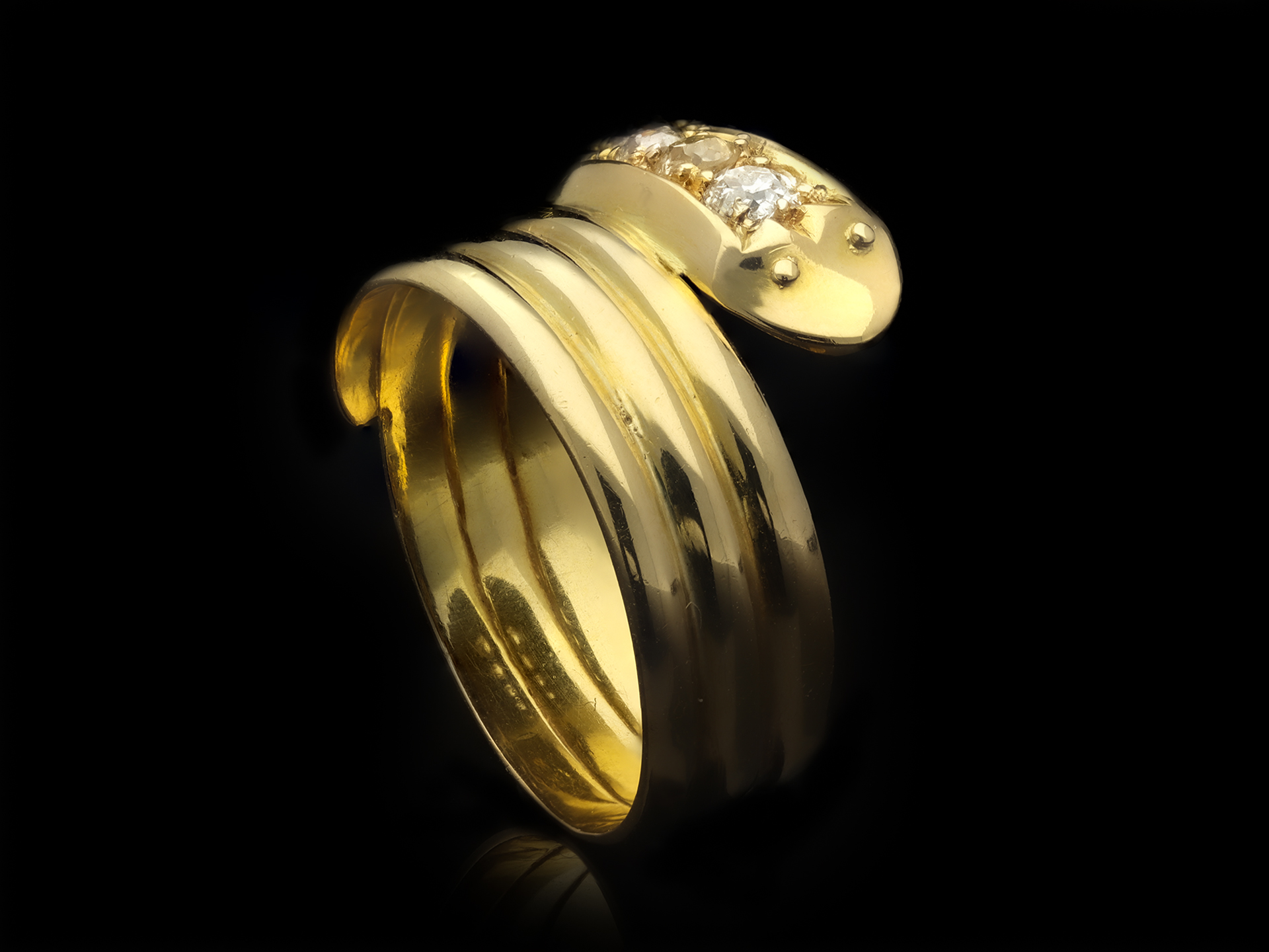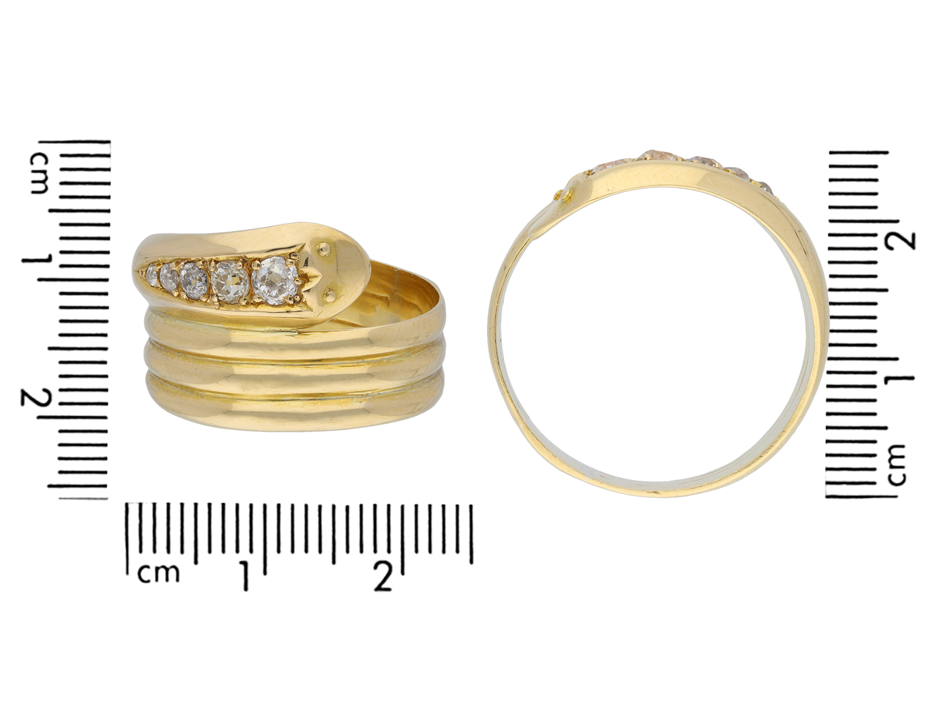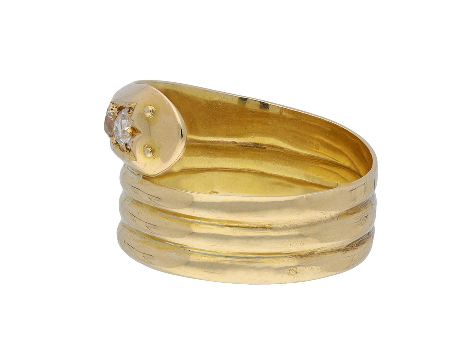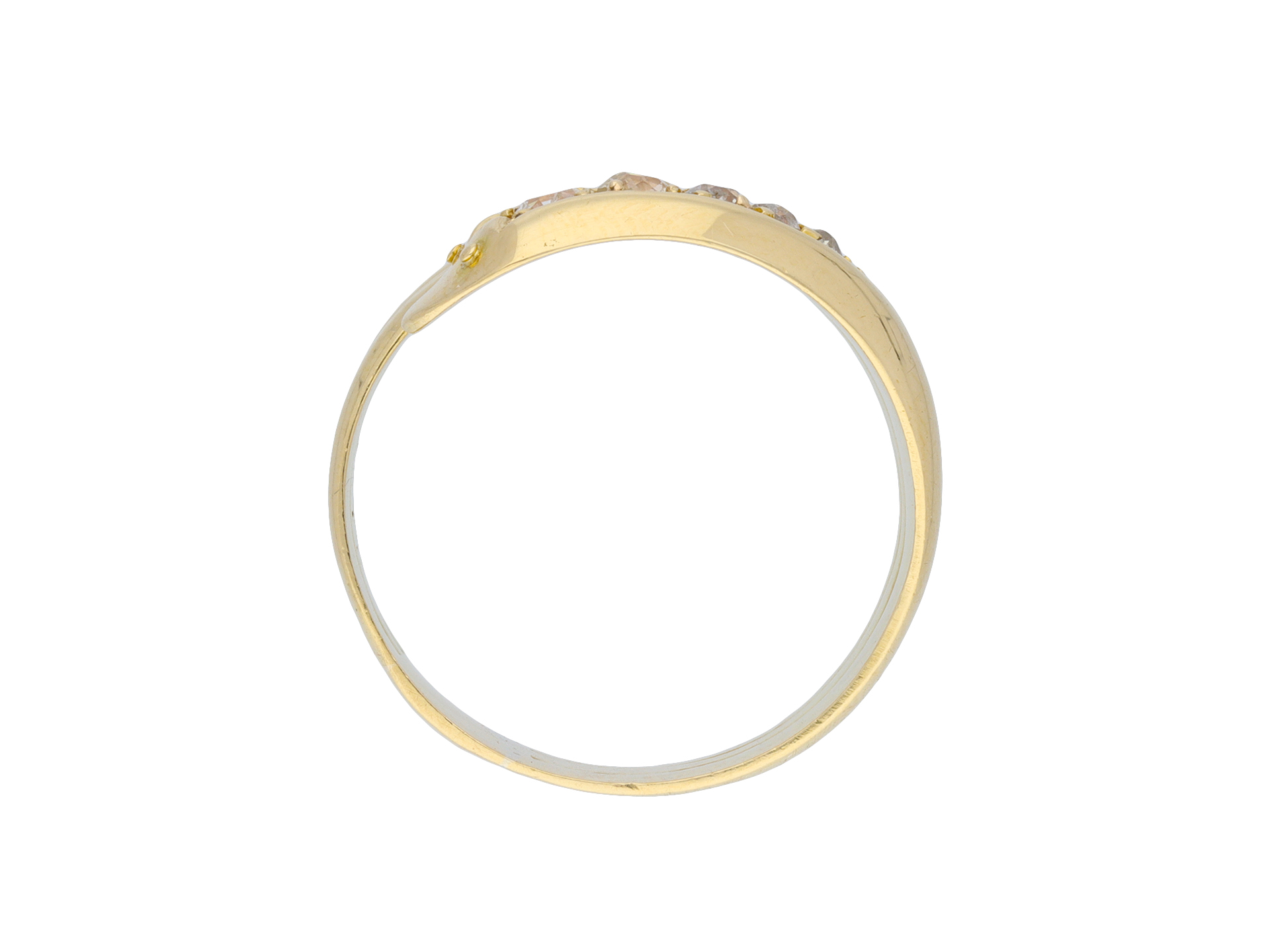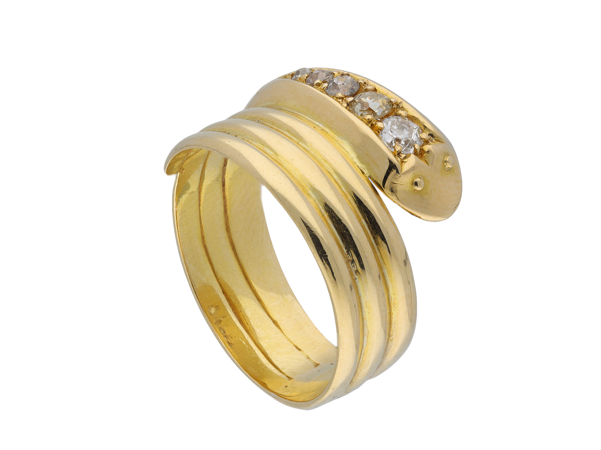 Edwardian diamond set snake ring. The head set with five graduating cushion shape old mine diamonds in open back grain settings with an approximate combined weight of 0.40 carats, to a yellow gold ring in the form of a coiled serpent with eye details and circular open back holing, the conforming shoulders flow through to a solid ridged shank. Marked 18 carat yellow gold, full hallmarks for Birmingham, indistinct maker's mark, numbered '2127', English, circa 1905.