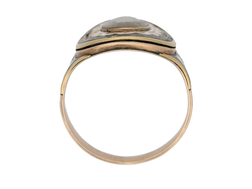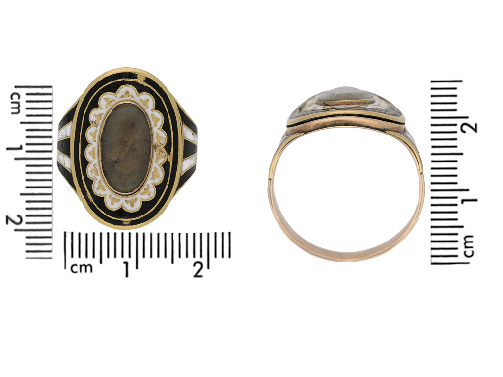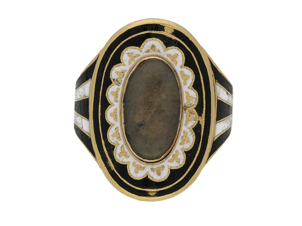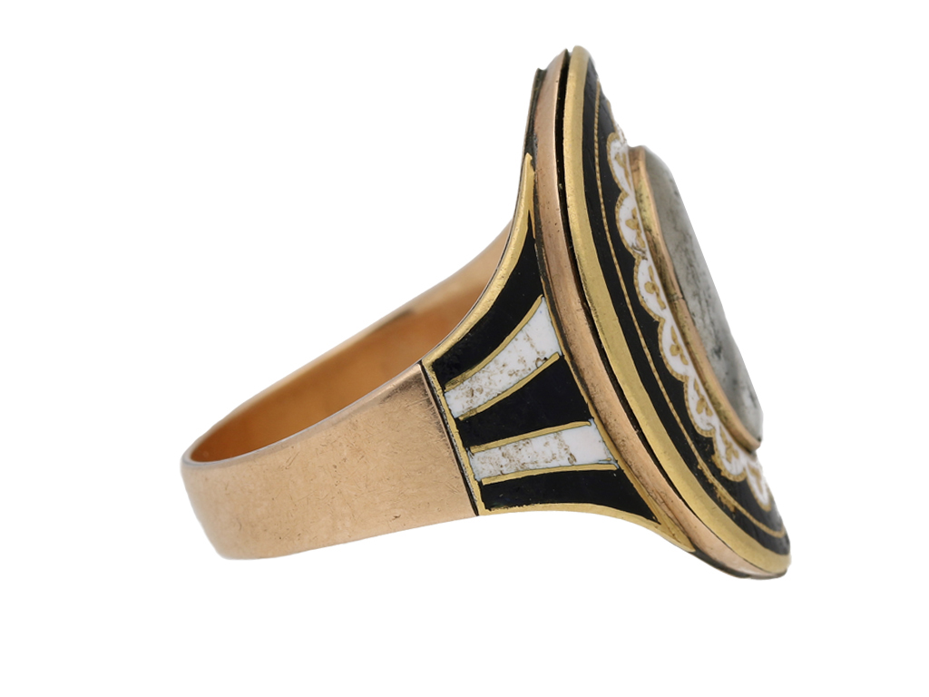 Enamelled memorial ring. Set centrally with an oval crystal plaque covering a fragment of leather, surrounded by a series of black and white enamelled borders, engraved in italic script to the underside 'Josiah Monnery died 8 June 1798 Aged 76', flanked by broad trumpeting shoulders with further enamel detail and tapering through to a flat shank. Tested rose gold, English, circa 1790.