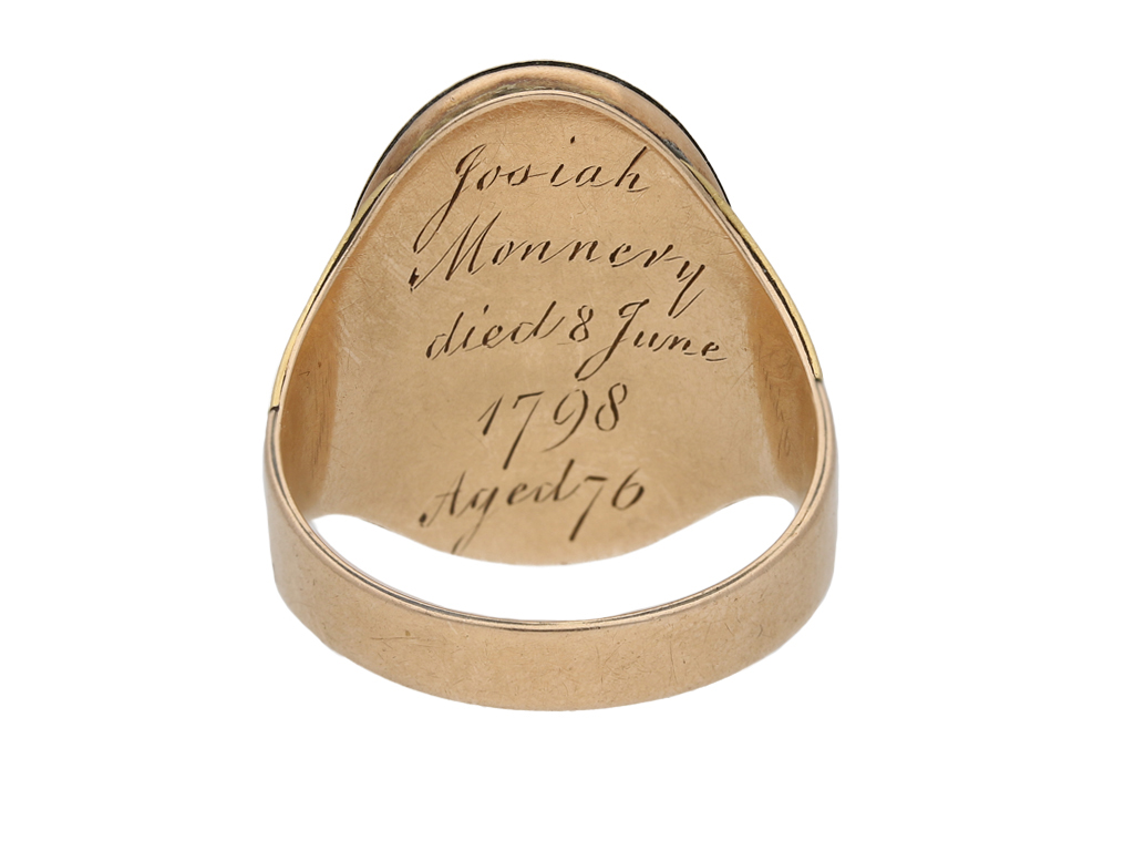 Enamelled memorial ring. Set centrally with an oval crystal plaque covering a fragment of leather, surrounded by a series of black and white enamelled borders, engraved in italic script to the underside 'Josiah Monnery died 8 June 1798 Aged 76', flanked by broad trumpeting shoulders with further enamel detail and tapering through to a flat shank. Tested rose gold, English, circa 1790. Josiah Monnery was a leather goods seller and glove maker from Southwark, London.