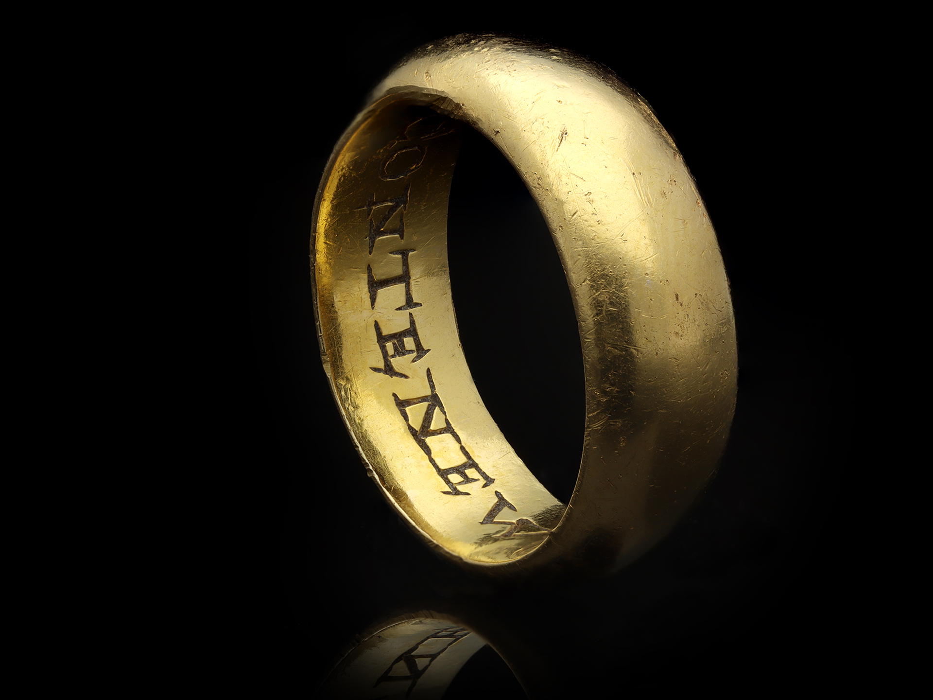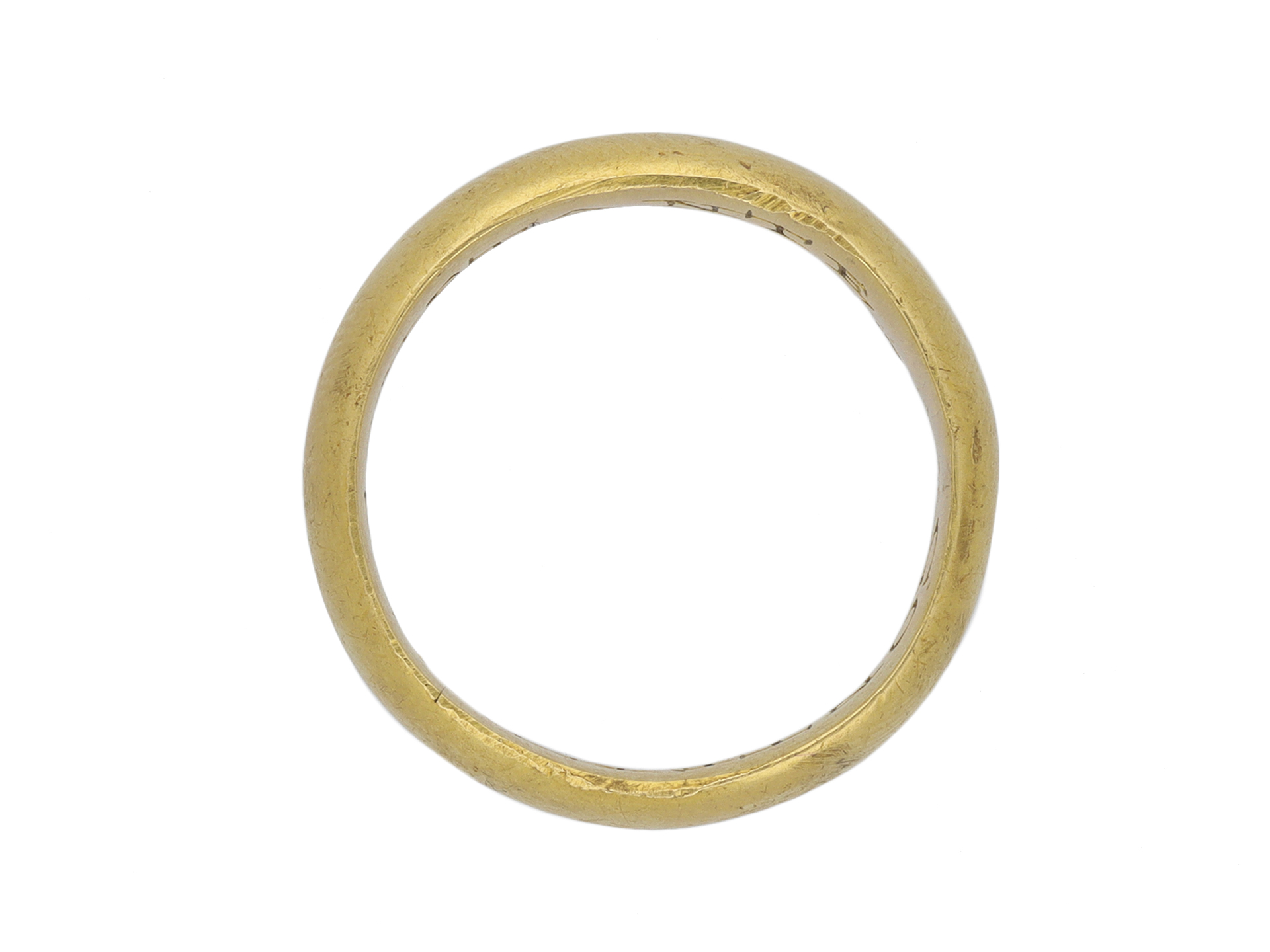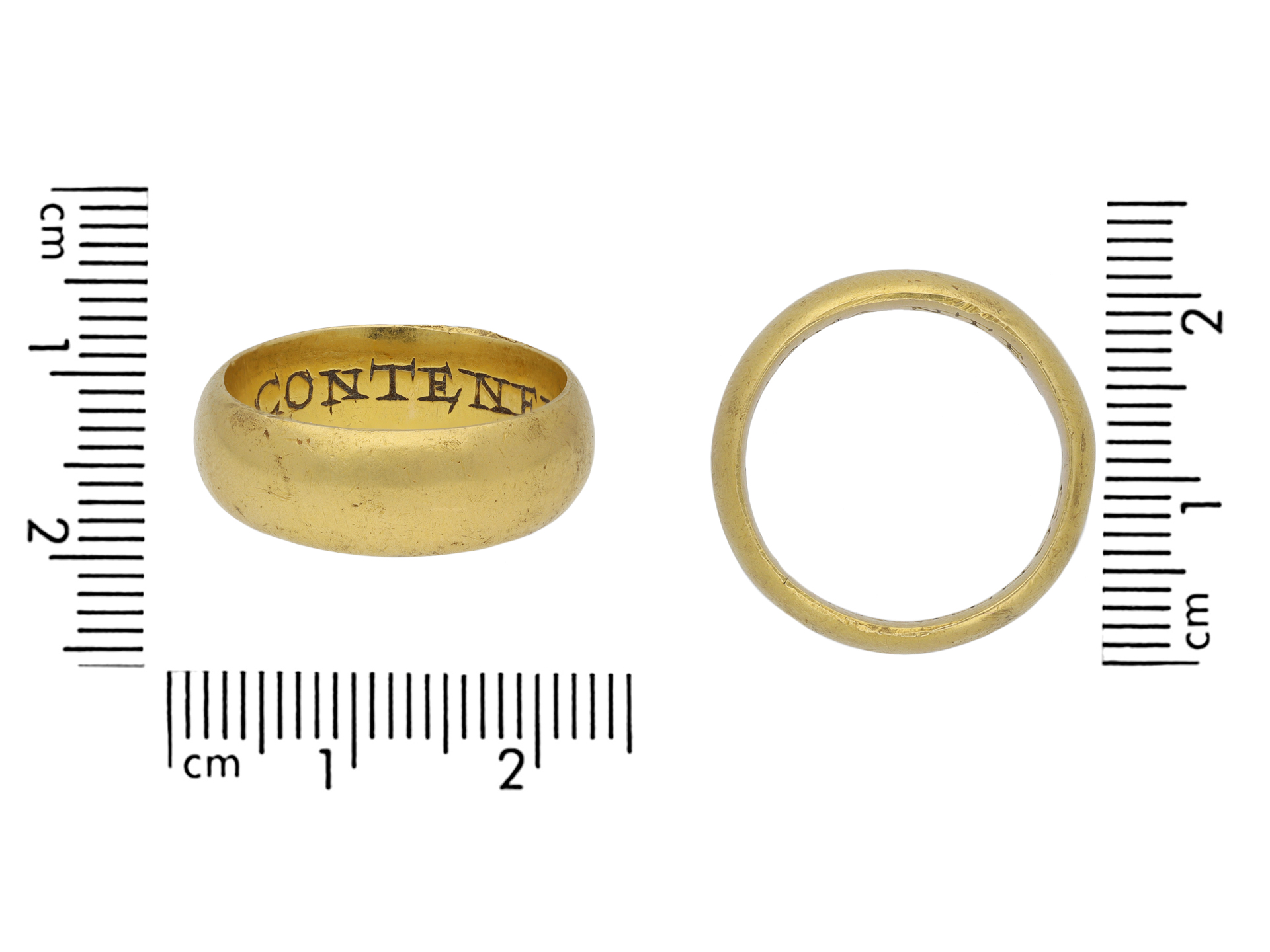 Enamelled posy ring, 16th century. A yellow gold posy ring, the interior engraved ‘CONTENEW + CONSTANTE’, meaning ‘content and constant’ in old French, the letters in black enamel. Tested yellow gold, approximately 8.61 grams in weight.