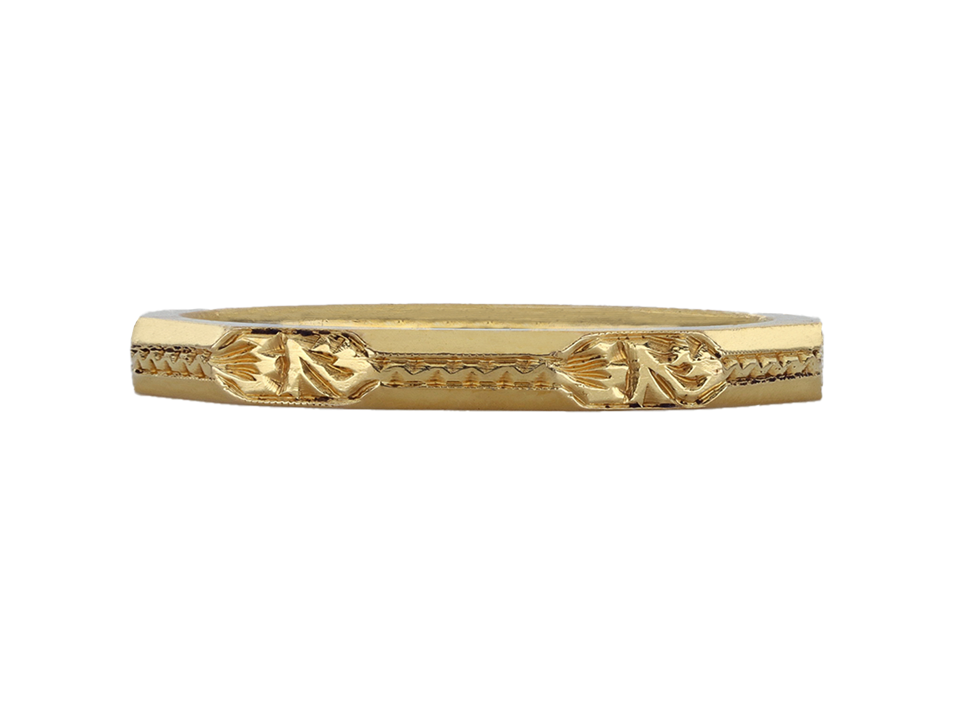 Engraved wedding band. An angular wedding band, faceted around the full circumference, each panel finely engraved with a repeating stylised foliate and linear design, approximately 2mm in width. Marked 22 carat yellow gold, approximately 3.00 grams in weight, full hallmarks for London, English, 1941.
