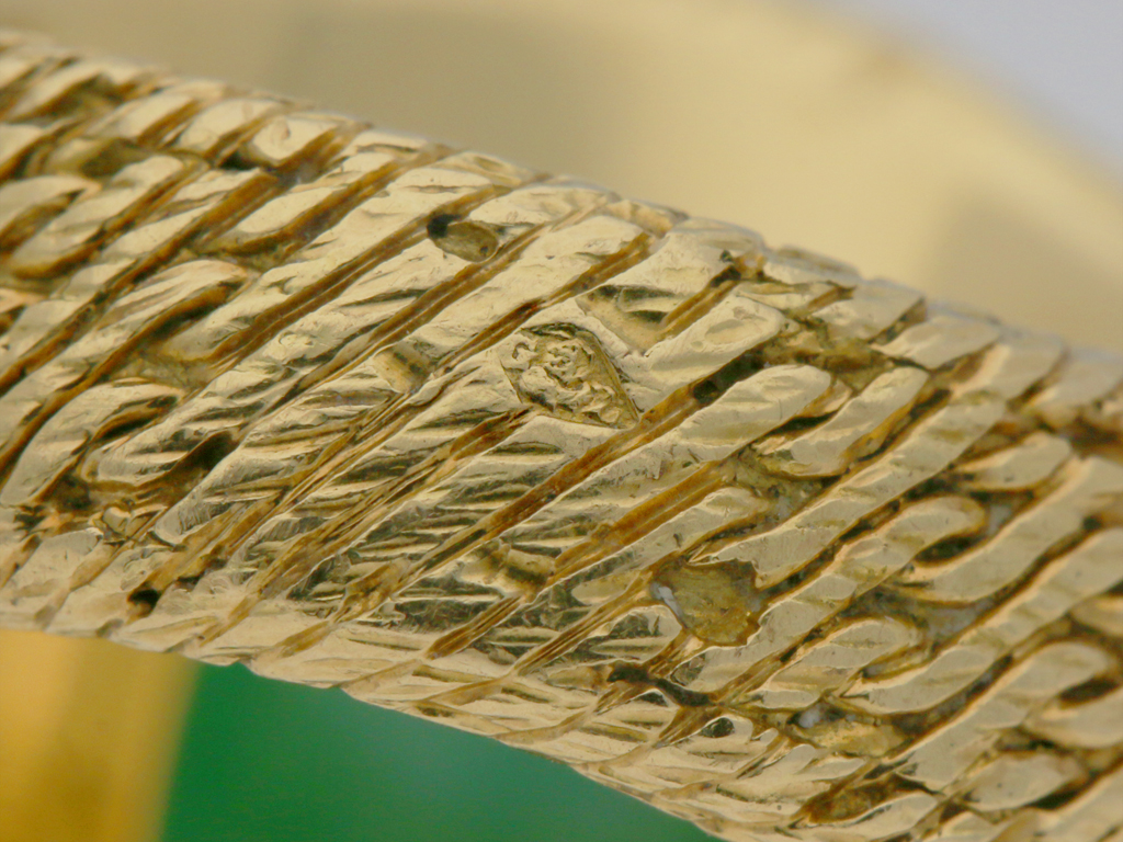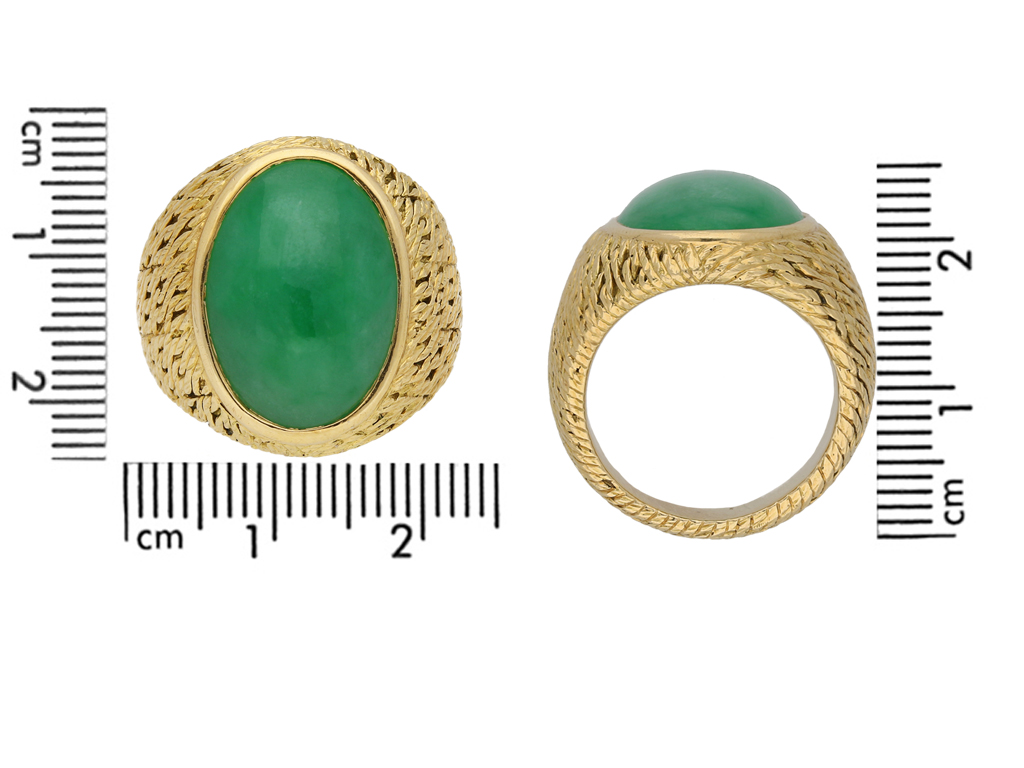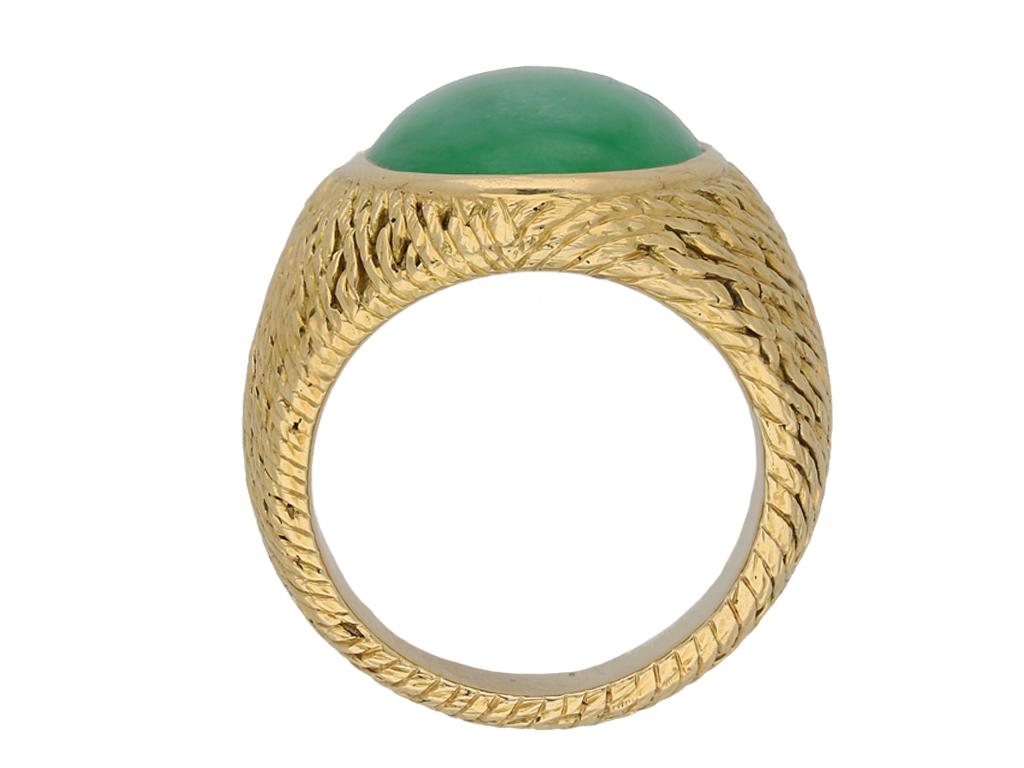 For the majority of the 20th century, the workshop of Georges Lenfant was run by his son Jacques, who had joined as an apprentice in 1915. For the prolific Parisian jewellery 'maisons', such as Cartier, Van Cleef & Arpels, Boivin, and Hermes, he was trusted to create many of their gold jewellery designs. Lenfant's unparalleled skills as a goldsmith are evident in this remarkable ring, with his signature use of woven texture surrounding the rich green jade.