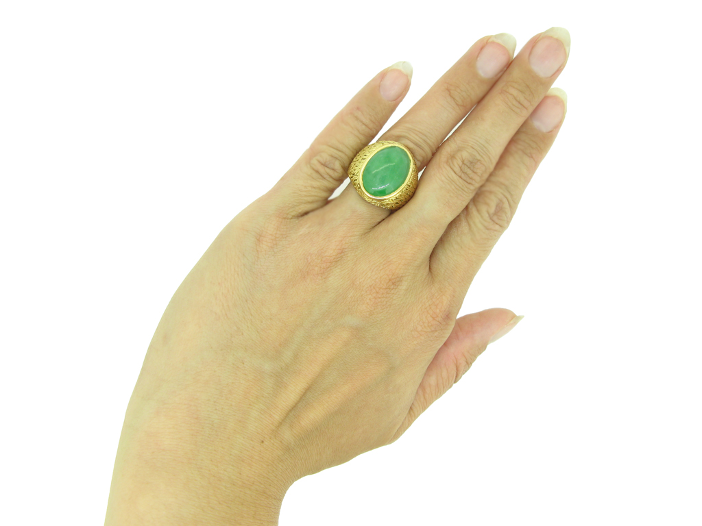 Georges Lenfant jade ring. Set with an oval cabochon natural unenhanced jade in an open back rubover setting with an approximate weight of 12.07 carats, to an impressive signet ring featuring a recessed central collet framed by a polished border and fitted to reverse with intricately pierced backholing, the integrated trumpeting shoulders are decorated with a fine riven pattern which continues to a broad shank. Marked 18 carat yellow gold, maker's mark for Georges Lenfant, French, circa 1945.