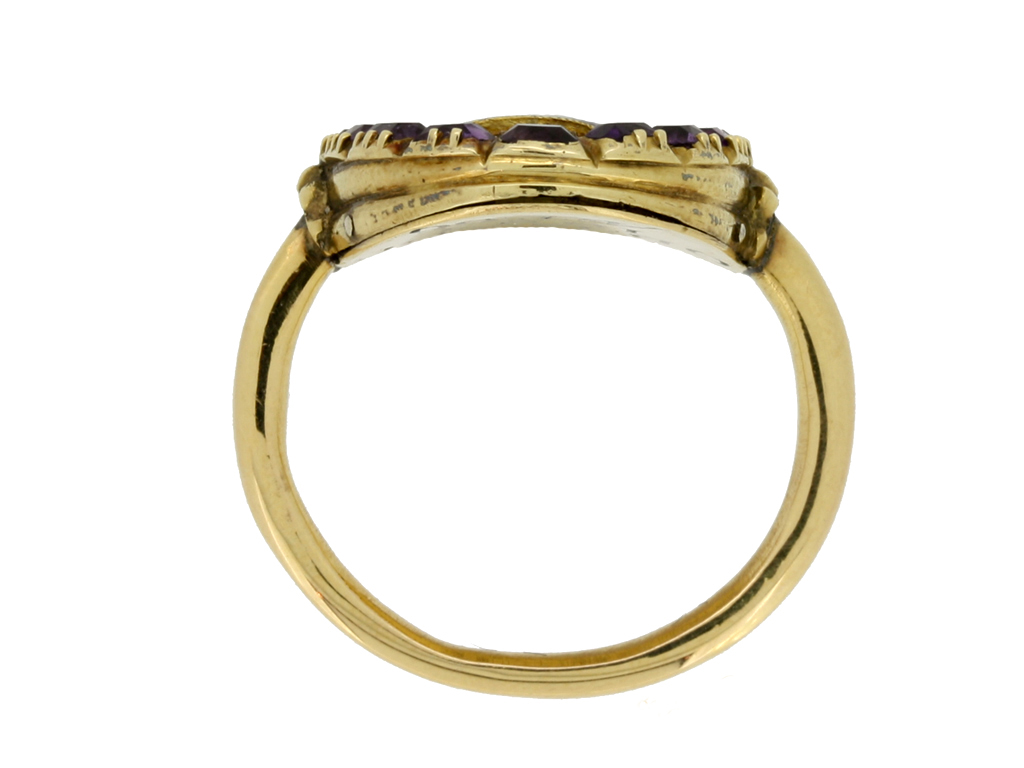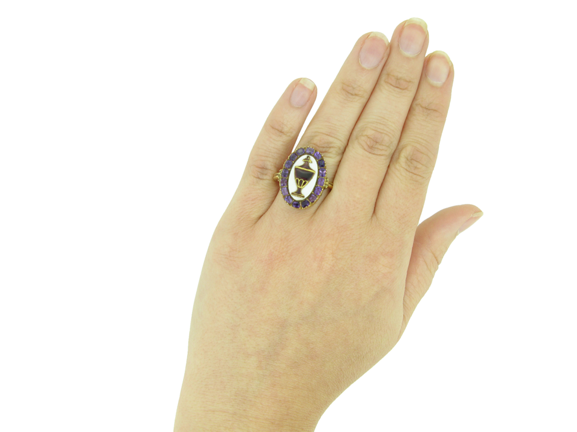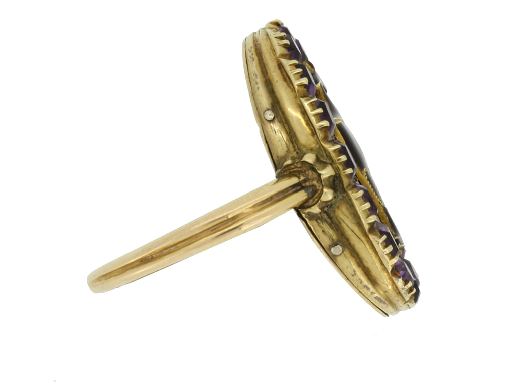 Georgian amethyst and enamel mourning ring. Set with sixteen cushion shape old cut natural amethysts in closed back claw and cut-down settings with a combined approximate weight of 0.80 carats, to an oval memorial ring featuring a central white enamel plaque detailing an urn in purple enamel, millegrain edging and closed backholing, leading to ridged shoulders and flowing through to a solid ridged shank. Tested yellow gold, inscribed to the reverse in black enamel 'GEO NASSAU ARM OB:18.AUG.1823 AET:66', English, circa 1823. George Nassau (1756-1823) was an English country gentleman, and the brother of Henry, 5th Earl of Rochford. He was a historian and bibliophile and amassed an extensive library including many manuscripts on his home county Suffolk, with illustrations commissioned by him from leading artists of the time such as Thomas Gainsborough. His will notes that on his death, the following people were to receive mourning rings, valued at six guineas each: Reverend H.I. Berners, Sir William Rowley, John Wright Esq., Reverend William Gibson, Sir William Parker Bt., Sir Francis Hilman, Captain Hopkins, Reverend William Garratt, William Berners Esq., Reverend Dr Kilderlee, Colonel Dupuis, John Phillips Esq., Sir Robert Spencer Kilderlee Esq., James Saicer Esq., James Wenn Esq., Earl Ludlow, George Farrant Esq., John Butler Esq., and Reverend Samuel Jones Knight. One other of George Nassau's commissioned mourning rings can be seen in the V&A Museum's collection, reference M.168-1962. The abbreviation 'ARM' stands for the word 'armigerous' which meant that a person was literally a bearer of weapons or armour and thus entitled to use a coat of arms. In more modern terms, it means that you are entitled to call yourself 'Esquire'.