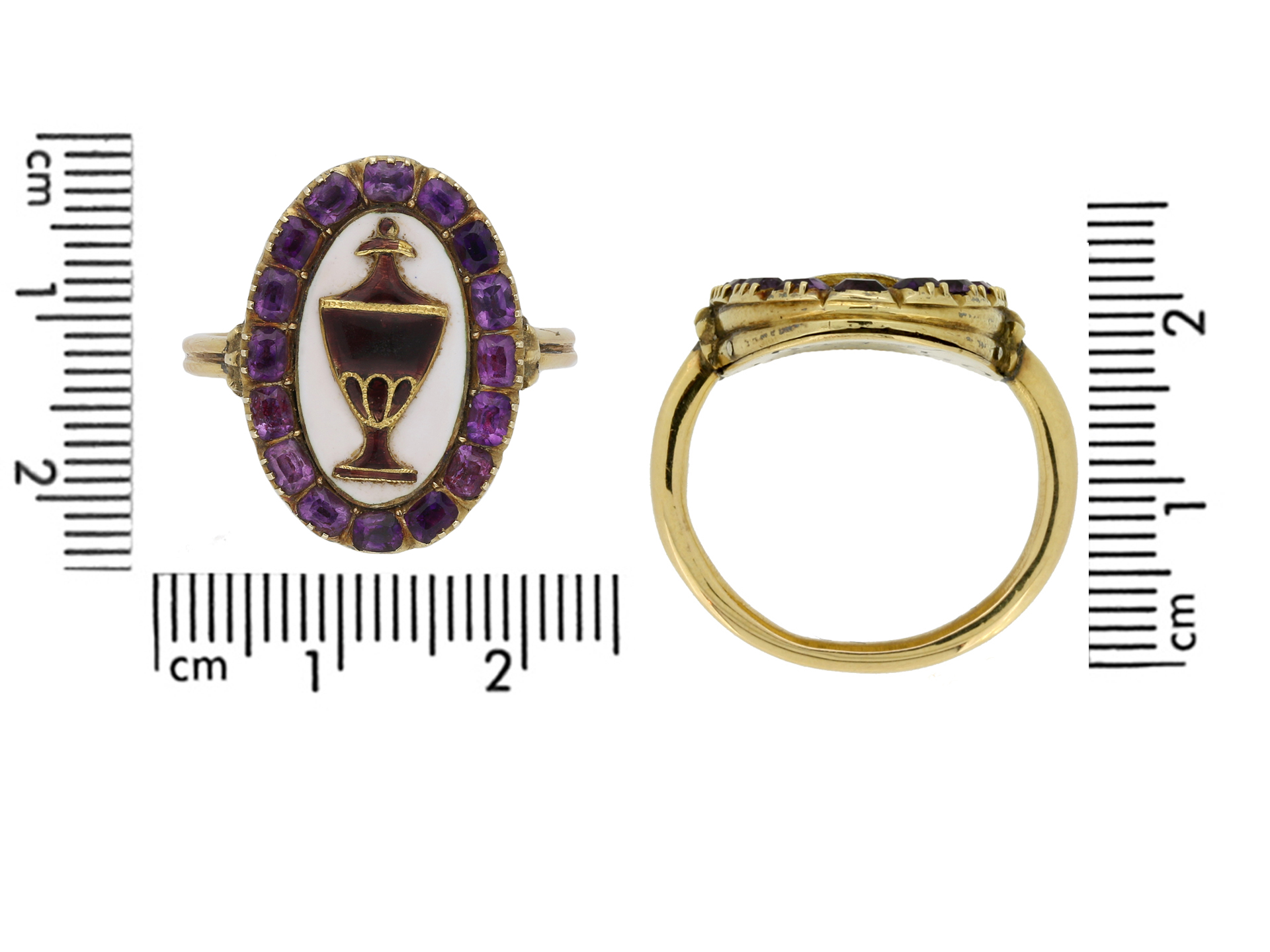 Georgian amethyst and enamel mourning ring. Set with sixteen cushion shape old cut natural amethysts in closed back claw and cut-down settings with a combined approximate weight of 0.80 carats, to an oval memorial ring featuring a central white enamel plaque detailing an urn in purple enamel, millegrain edging and closed backholing, leading to ridged shoulders and flowing through to a solid ridged shank. Tested yellow gold, inscribed to the reverse in black enamel 'GEO NASSAU ARM OB:18.AUG.1823 AET:66', English, circa 1823.