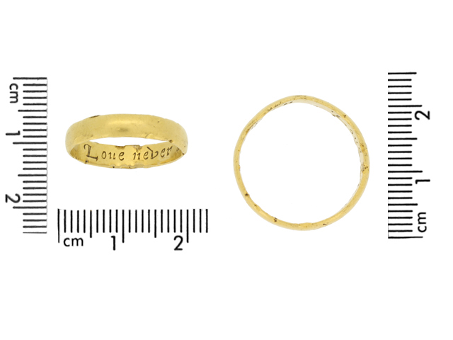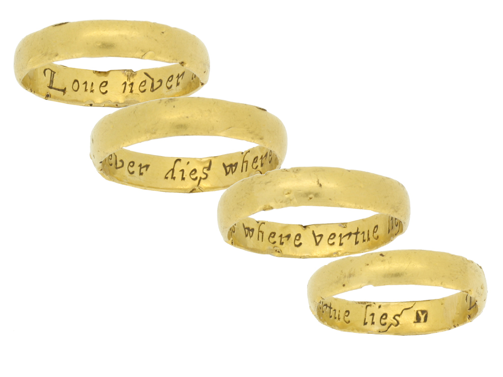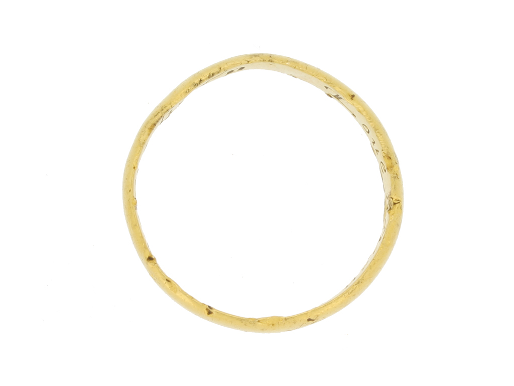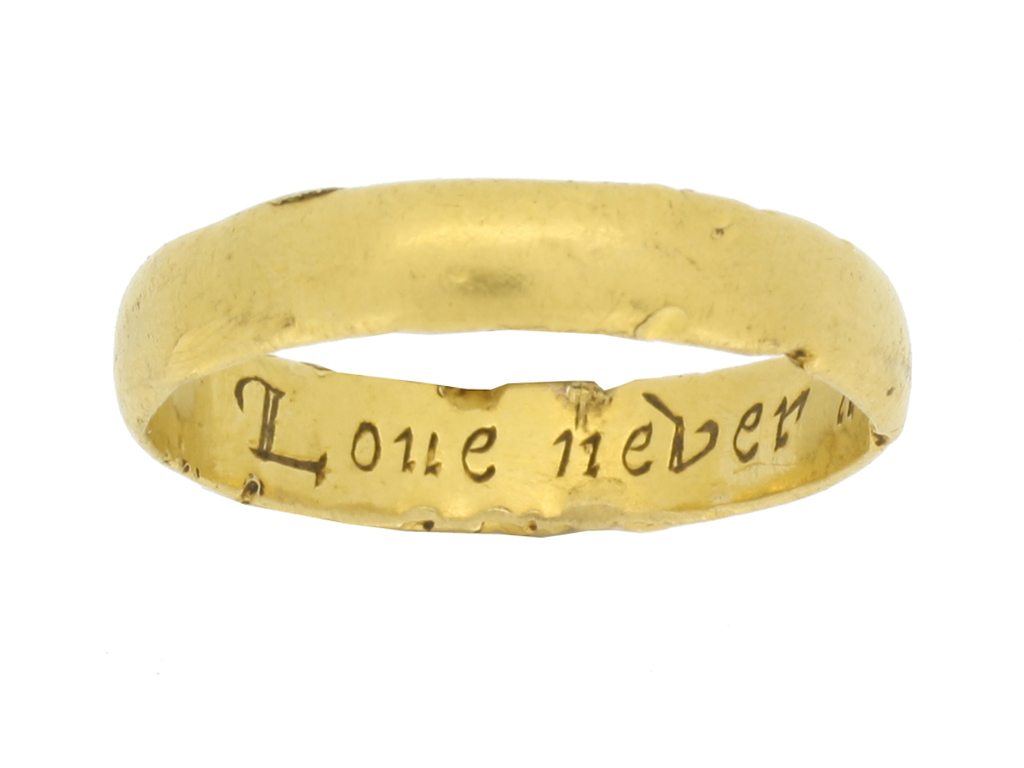 Georgian gold posy ring 'Loue never dies where vertue lies', circa 18th century.