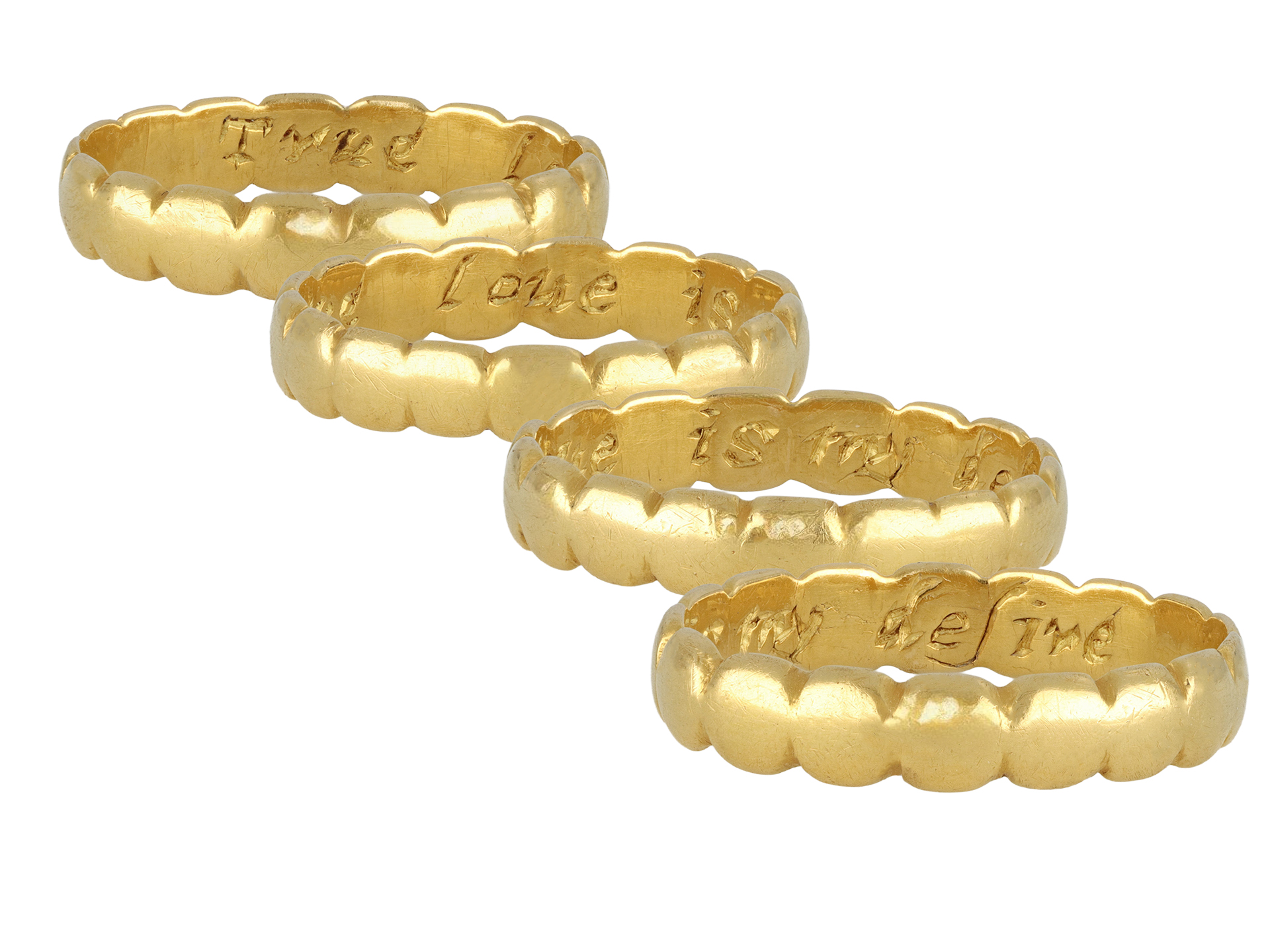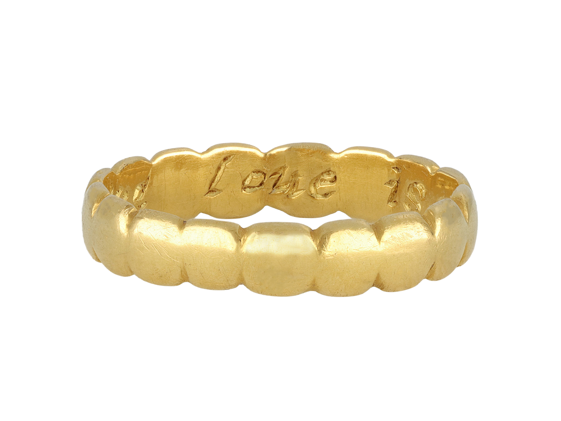 Georgian gold posy ring 'True loue is my desire'. A yellow gold band with softly scalloped edging, engraved to the interior 'True loue is my desire', approximately 3.7mm in width. Tested yellow gold, approximately 2.8g in weight, circa 18th century. This posy is completely unique- there is no record of this posy or any similar listed in Joan Evans' extensive catalogue- see Evans, J., 'English Posies and Posy Rings', 1931.
