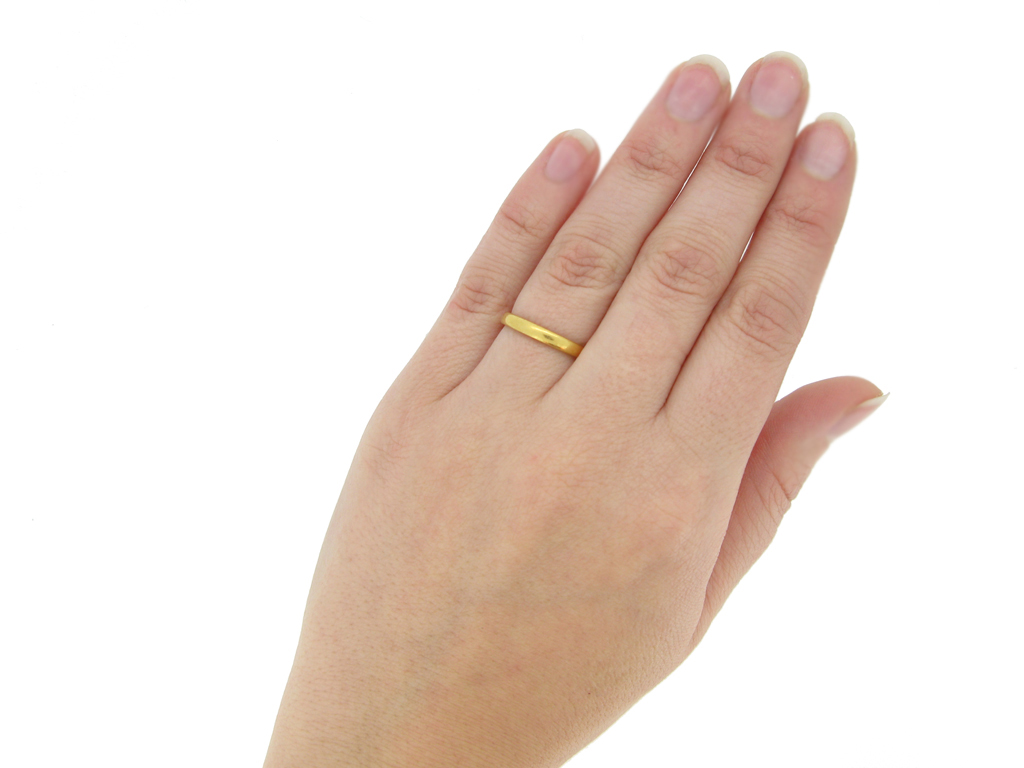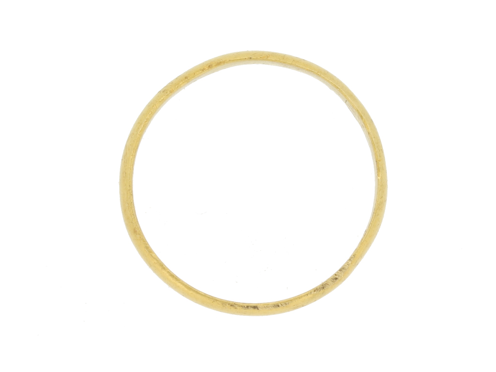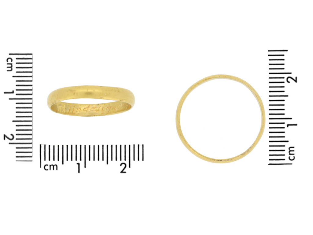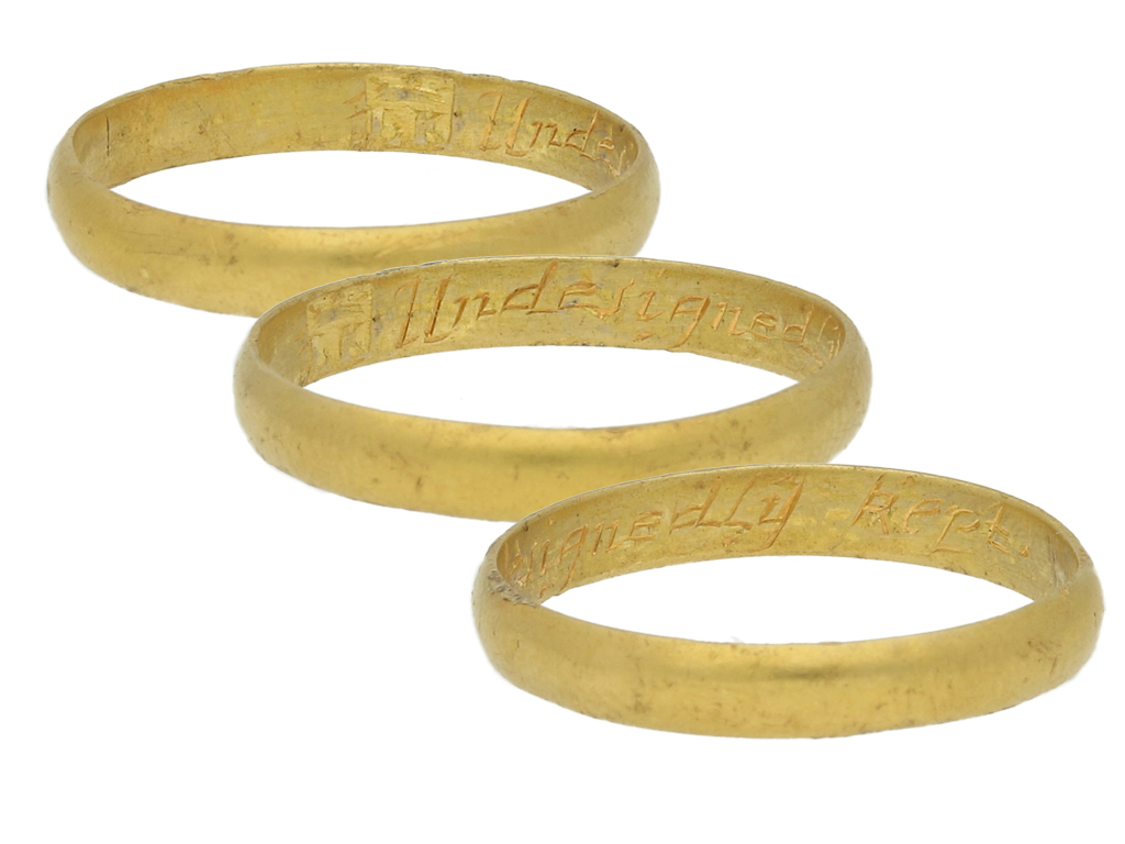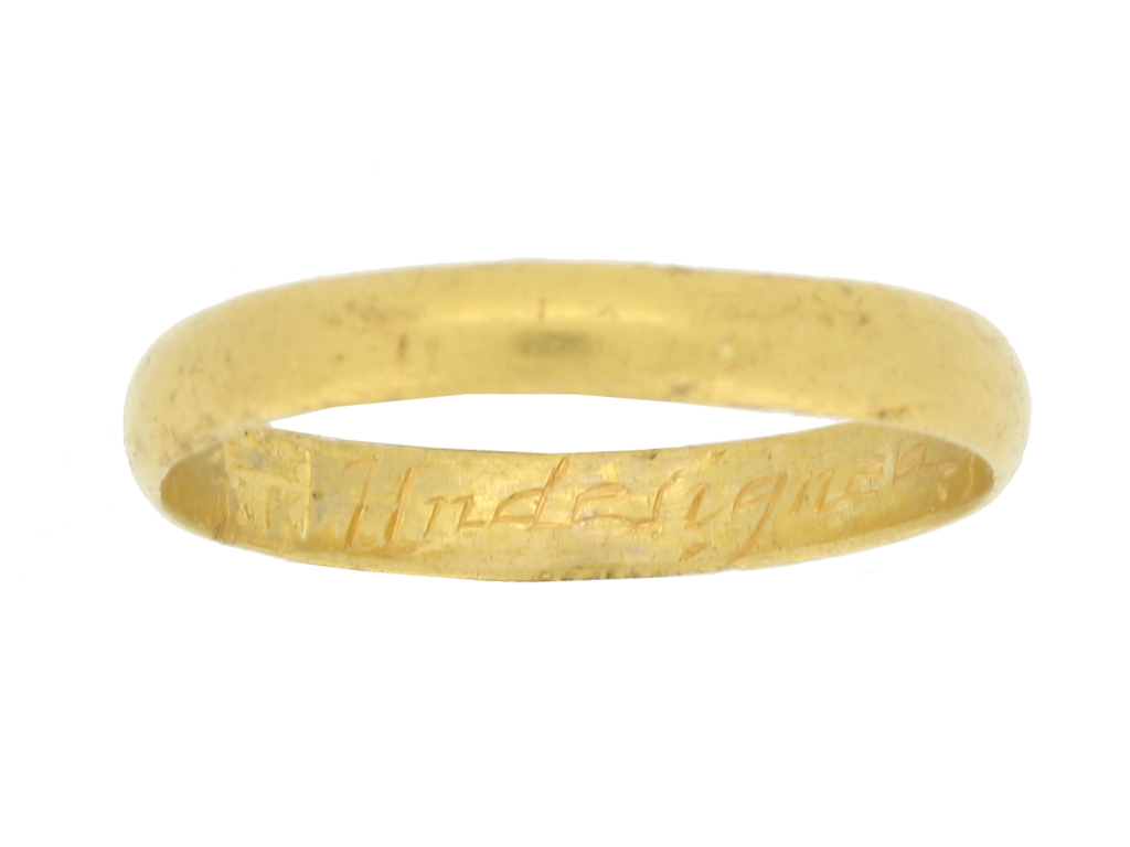 Georgian gold posy ring 'Undesignedly kept'. The plain D-shape band engraved to the interior in italic script 'Undesignedly kept', approximately 3mm in width. Tested yellow gold, maker's mark 'L.K' beneath a crown, approximately 2.19g in weight, circa 18th century. This posy motto is unusual- there is no variation or similar motto whatsoever listed in Joan Evan's catalogue of posies. See Evans, J., 'English Posies and Posy Rings', 1931.