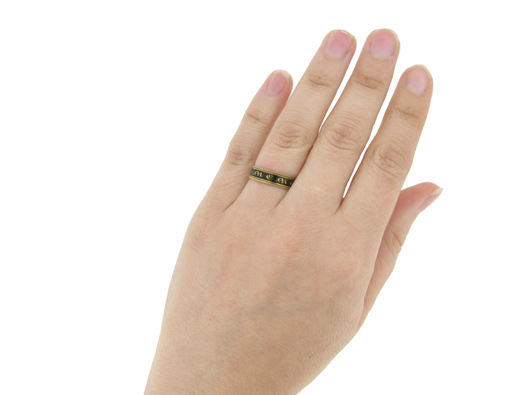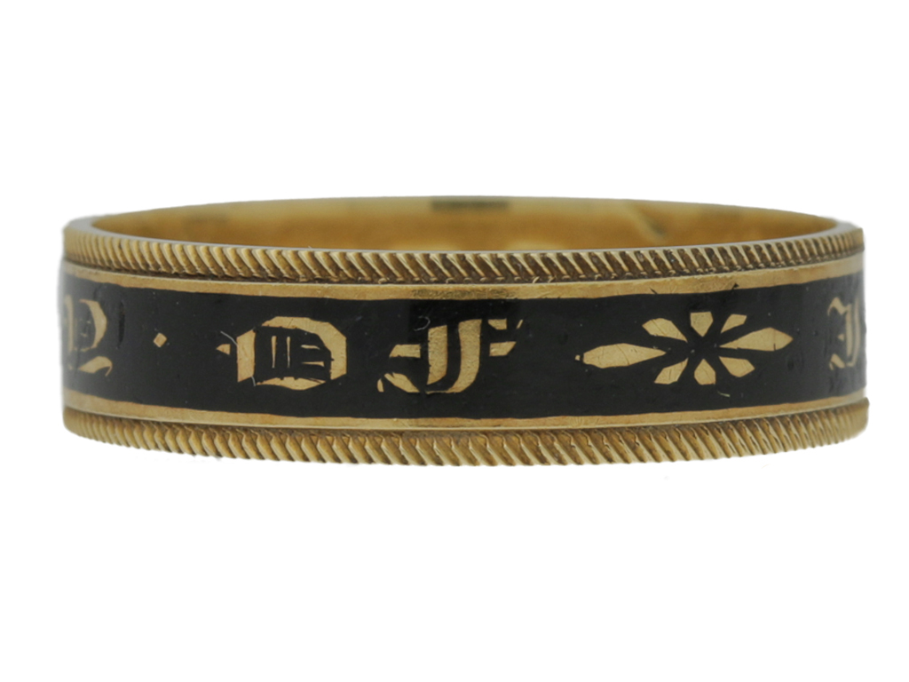 Georgian memorial ring. A conforming flat band with central black enamel band detailing in script 'IN MEMORY OF' with motif and engraved patterned borders, further engraved to the interior 'Mary Parker. died 27. Aug. 1839. in her 77th Year'. Marked 18 carat yellow gold, maker's mark 'AS.', full hallmarks for London, circa 1833.