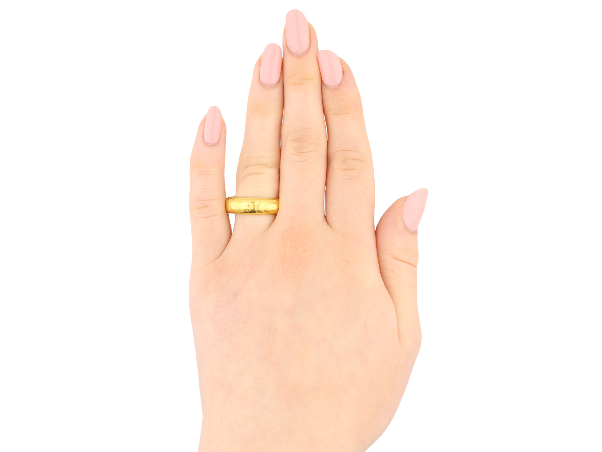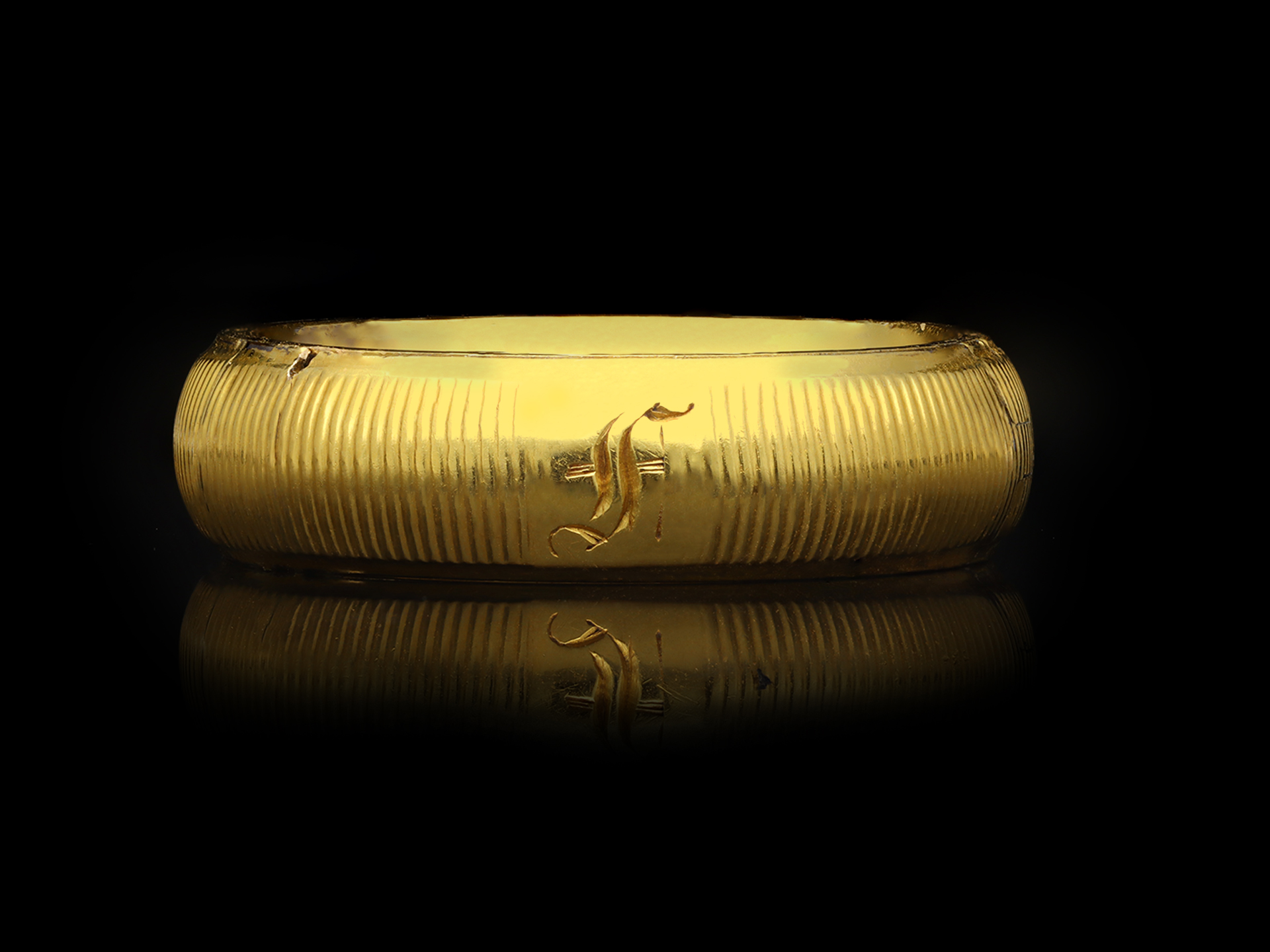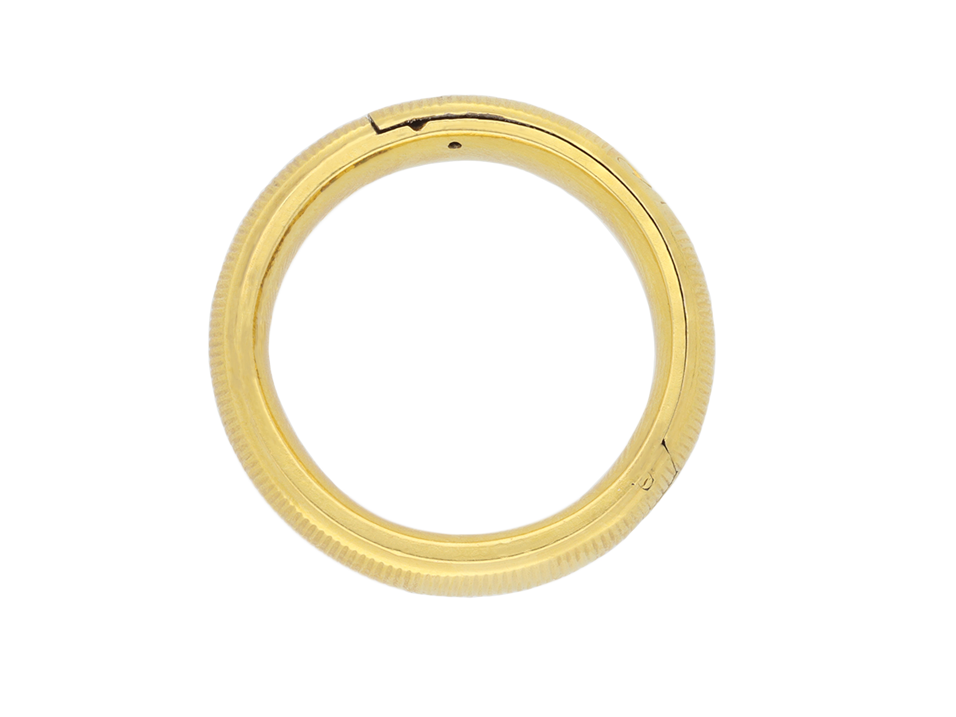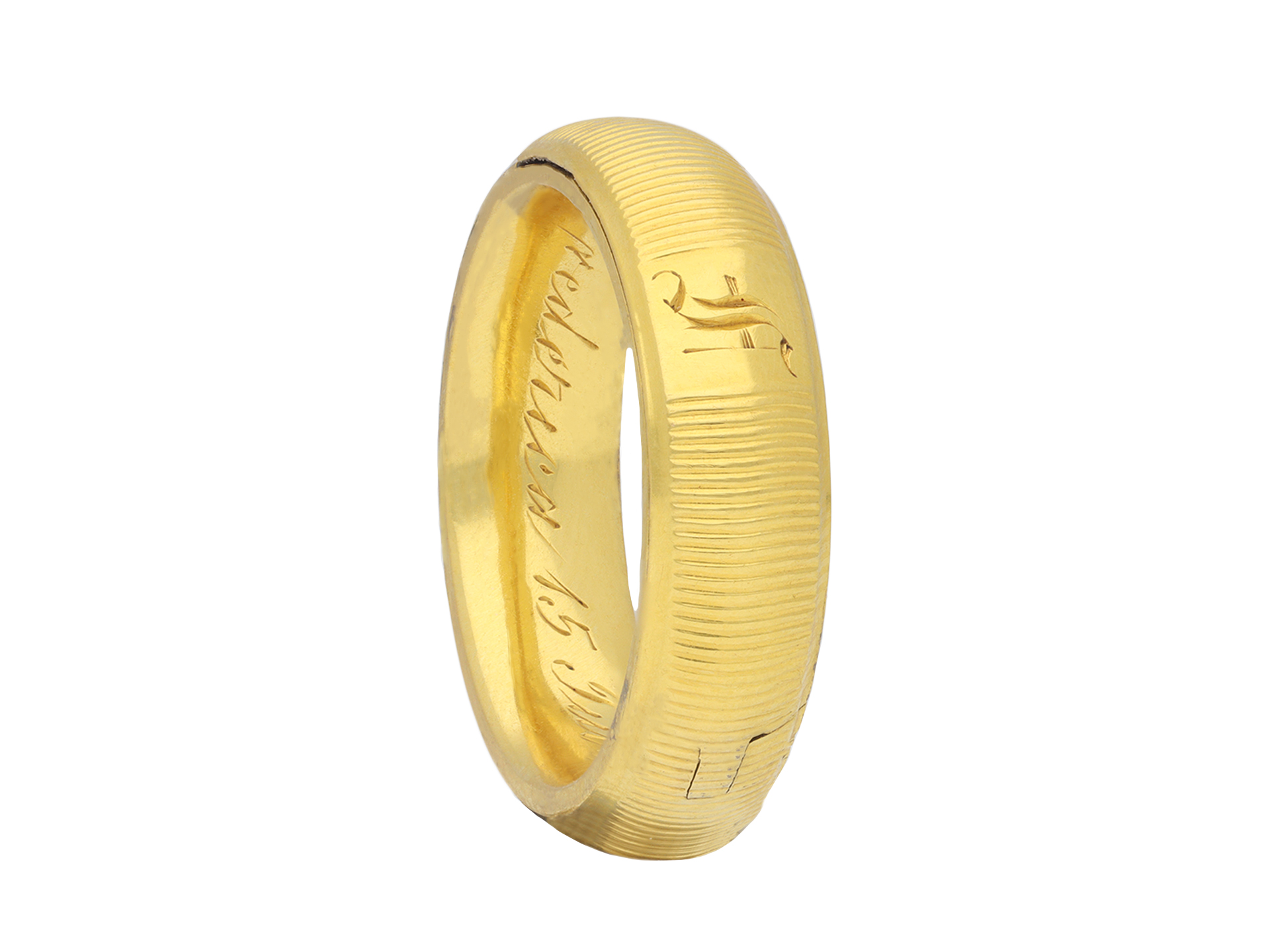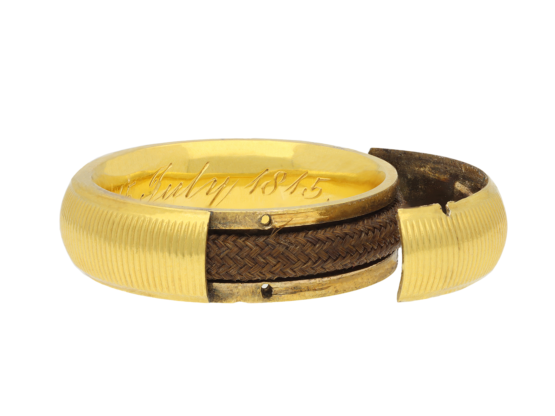 Georgian mourning ring. A smoothly conforming court shape band engraved centrally with the letter 'F', featuring a repeating linear ridged pattern throughout and set with a hinged locket compartment containing braided brown hair, approximately 6mm in width. Tested yellow gold, engraved 'Frederica 15 July 1815', English, circa 1815.