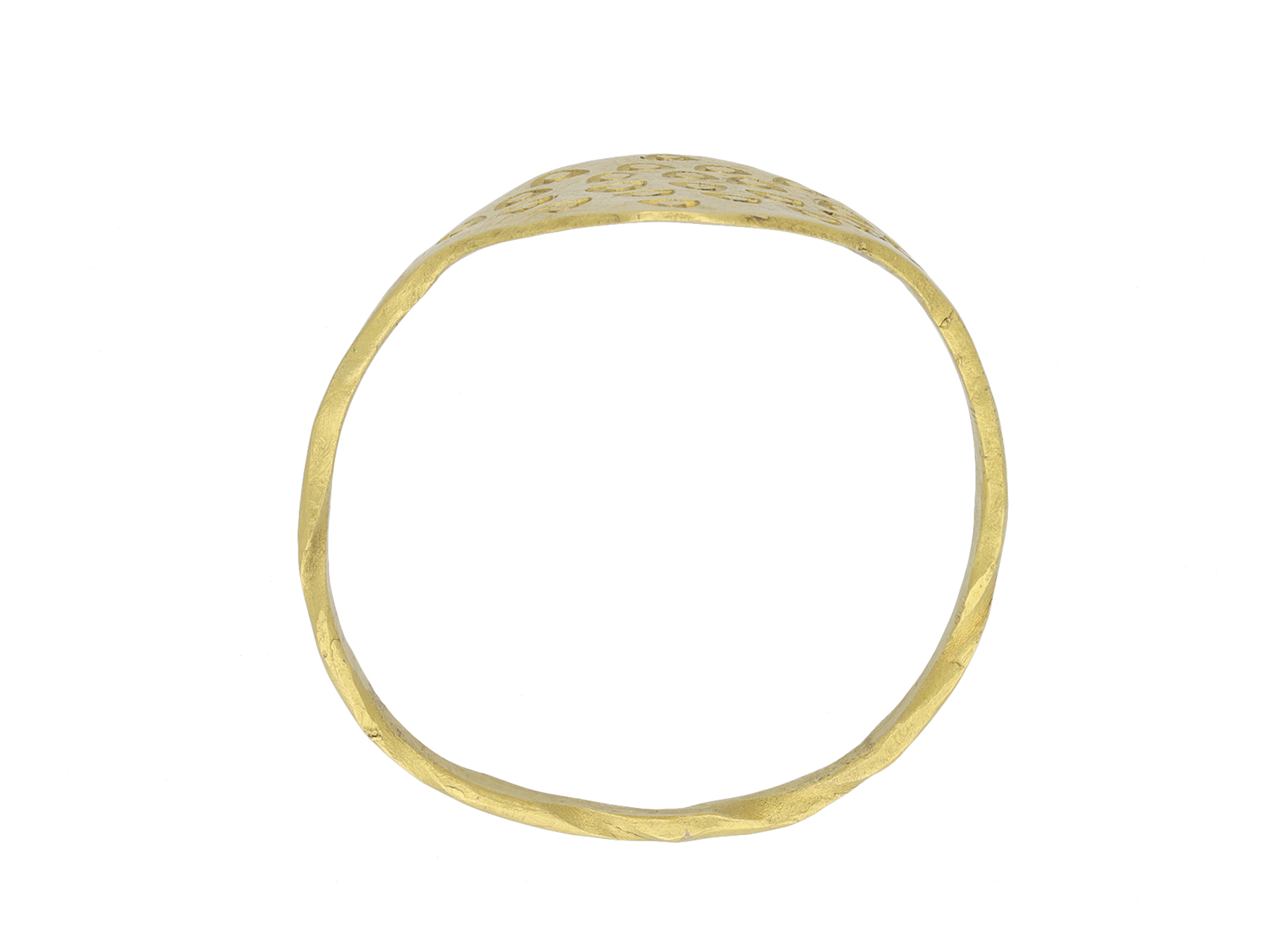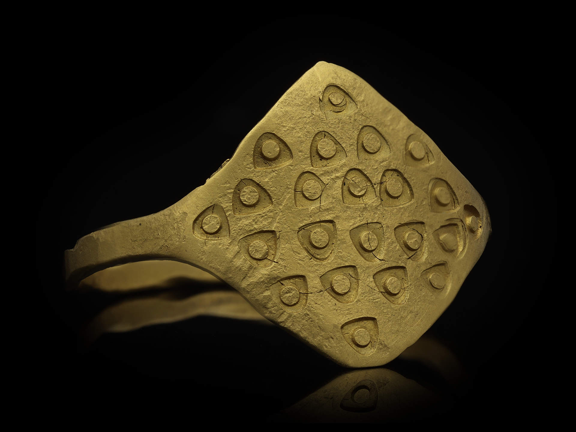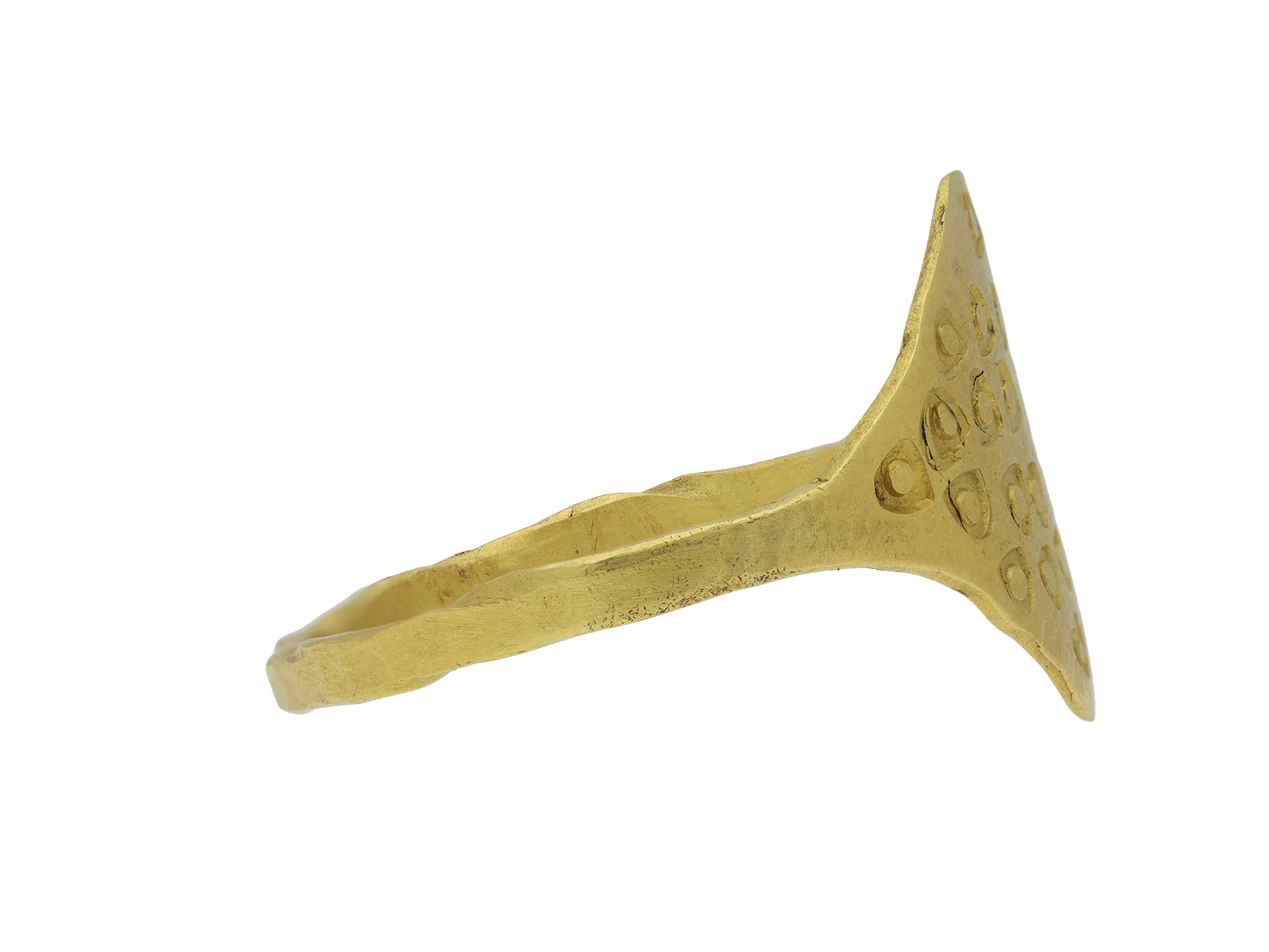 Gold Viking stamped ring. A large yellow gold ring with a broad diamond shaped central gold plaque, stamped with a repeating punchmark, flanked by integrated shoulders which lead smoothly around to a solid flat beaten textured shank. Tested yellow gold, approximately 5.2 grams in weight, circa 9th-11th century.
