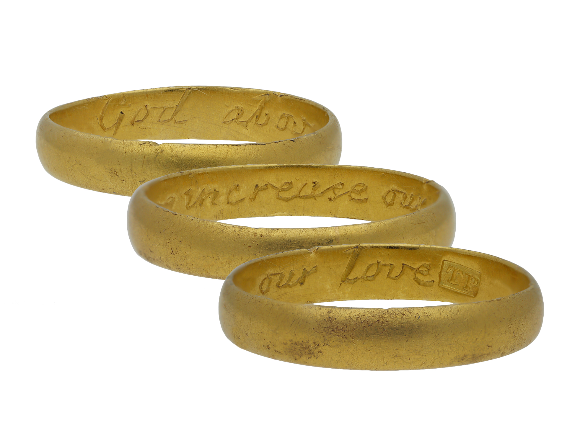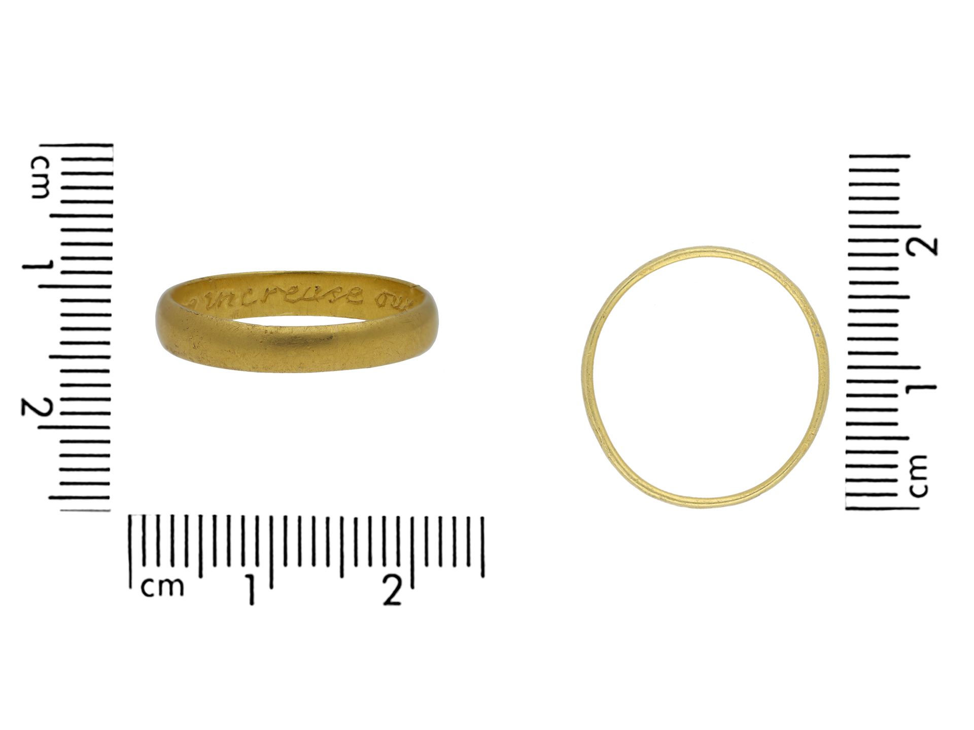 Gold posy ring, 'God above increase our love'. A plain yellow gold D-shaped band, the interior engraved in italic script 'God above increase our love', approximately 3.5mm in width. Tested yellow gold, approximately 3.06 grams in weight, maker’s mark 'TP', late 18th century. The maker's mark 'TP' is attributed to either Thomas Poynton or Thomas Pepper. See Grimwade, A. G., 'London Goldsmiths 1697-1837', p.631 and 619. Thomas Poynton is recorded as being a Goldsmith working in London, no record of Freedom, maker's mark entered on 22nd August 1758 as a smallworker and mentioned in a Parliamentary report in 1773. Thomas Pepper is recorded as being a Goldsmith working in London, no record of Freedom, maker's mark entered on 23rd February 1767 as a smallworker and mentioned in a Parliamentary report in 1773. See British Museum acquisition number AF.1317 and Museum of London acquisition number 62.4/13 for posy rings with the same maker's mark. It is possible to see the goldsmith's distinct handwriting inscribed within these bands- the same handwriting as in this posy ring. See Evans, J., 'English Posies and Posy Rings' p. 38 for similar posies and their sources.