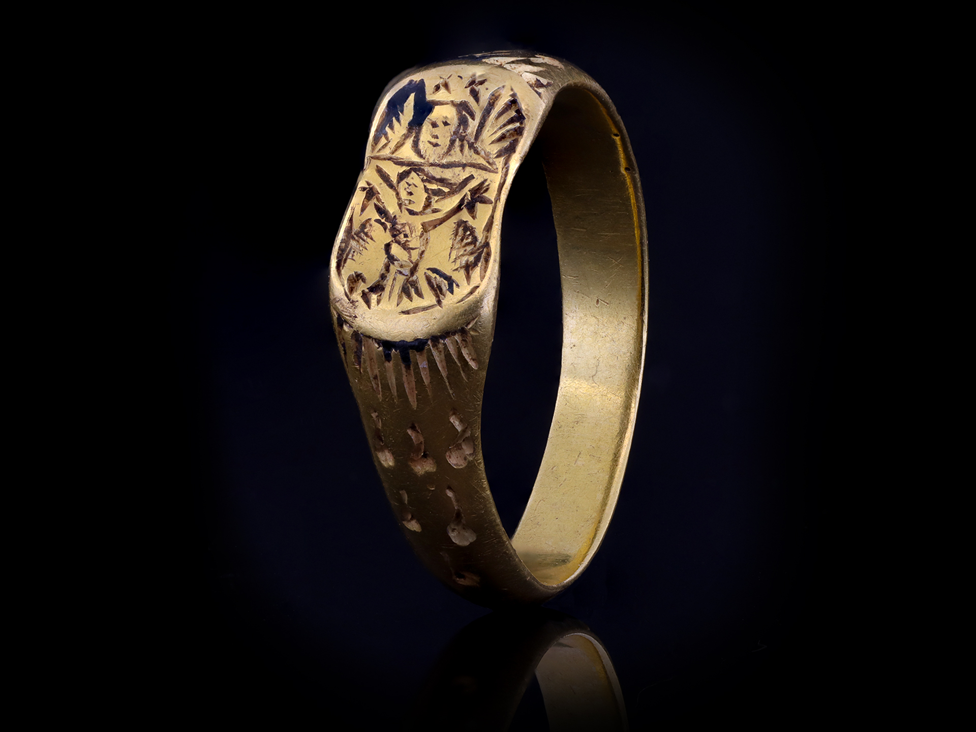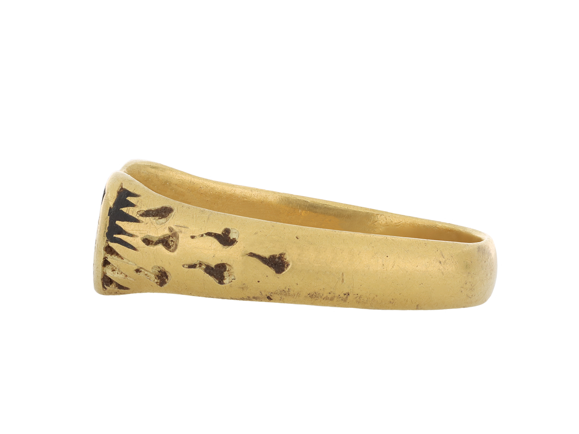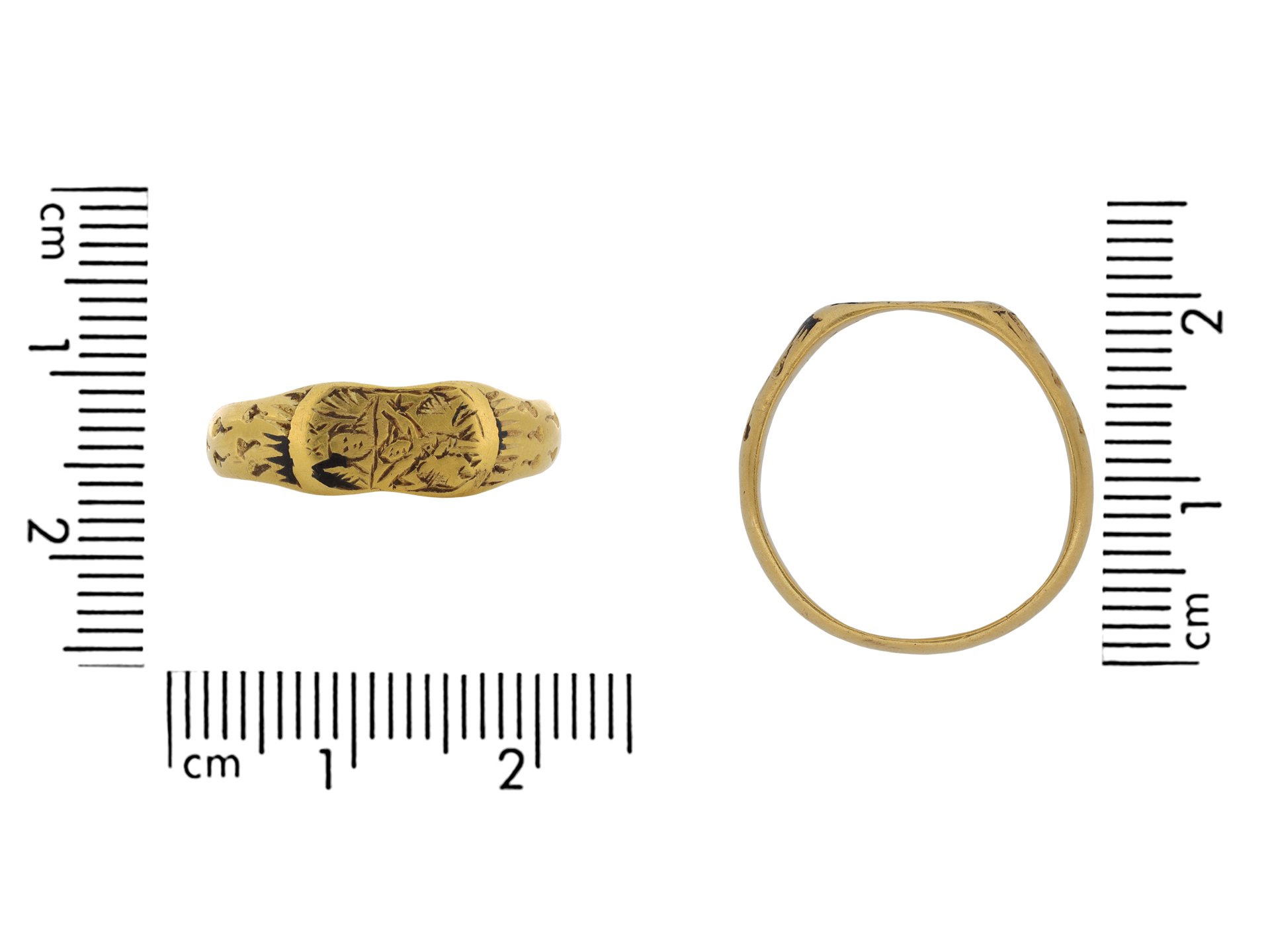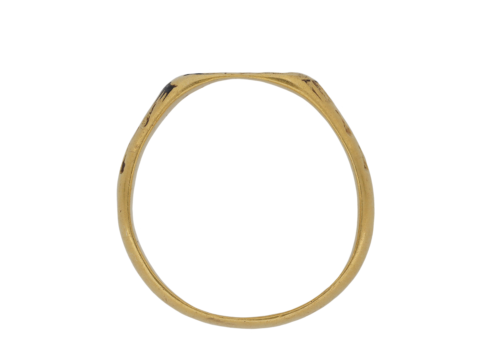 This ring was discovered in 2020 whilst metal detecting near Harrogate, and was found alongside 21 silver coins. The coins date between 1461-1477, suggesting this hoard was buried during the Wars of the Roses for safe keeping, likely by a soldier later killed in battle. The ring has been disclaimed under the Treasure Act, 1996, ref 2020-T631, and is documented under the Portable Antiquities Scheme ref SWYOR-4E1B92.