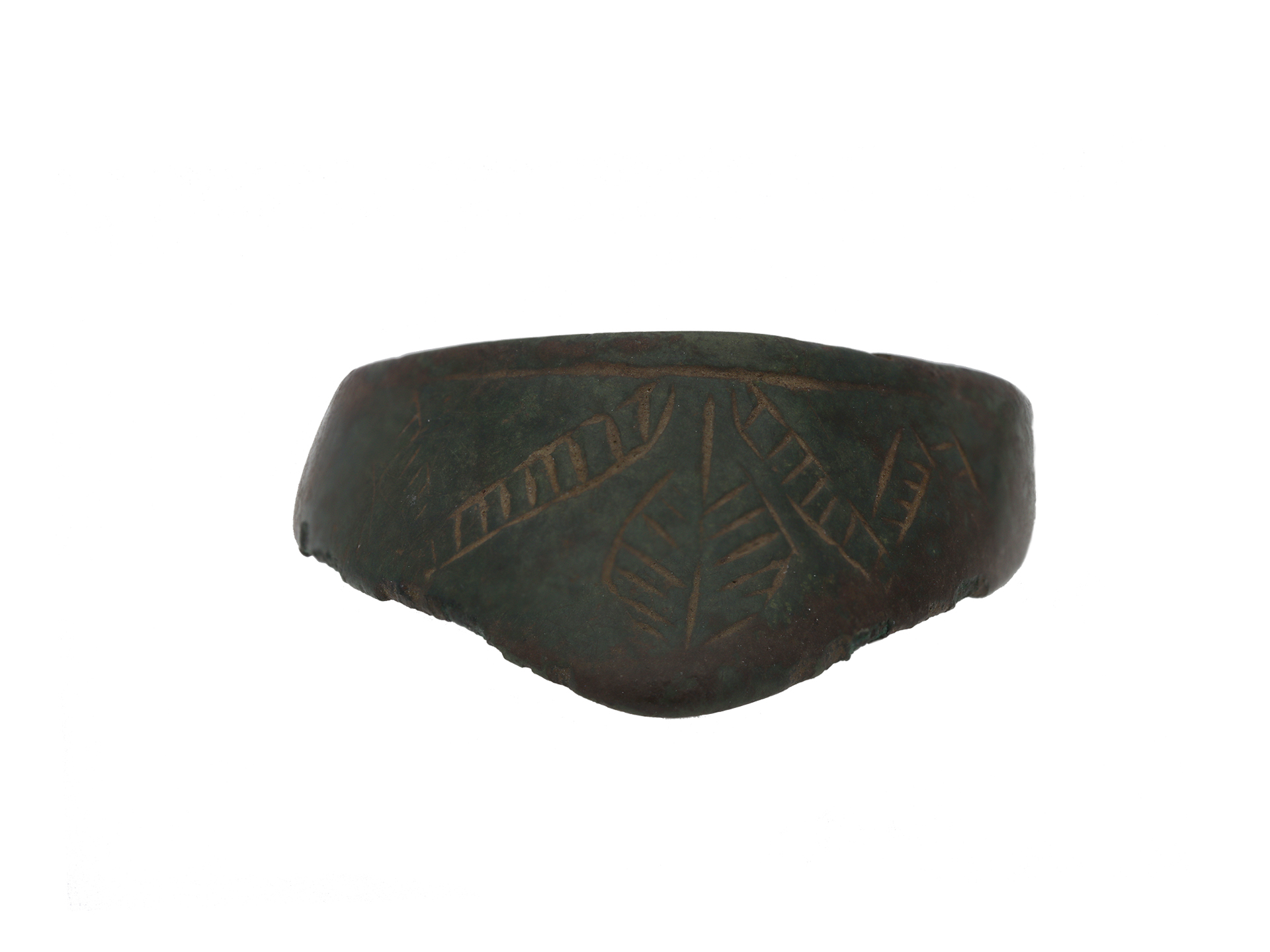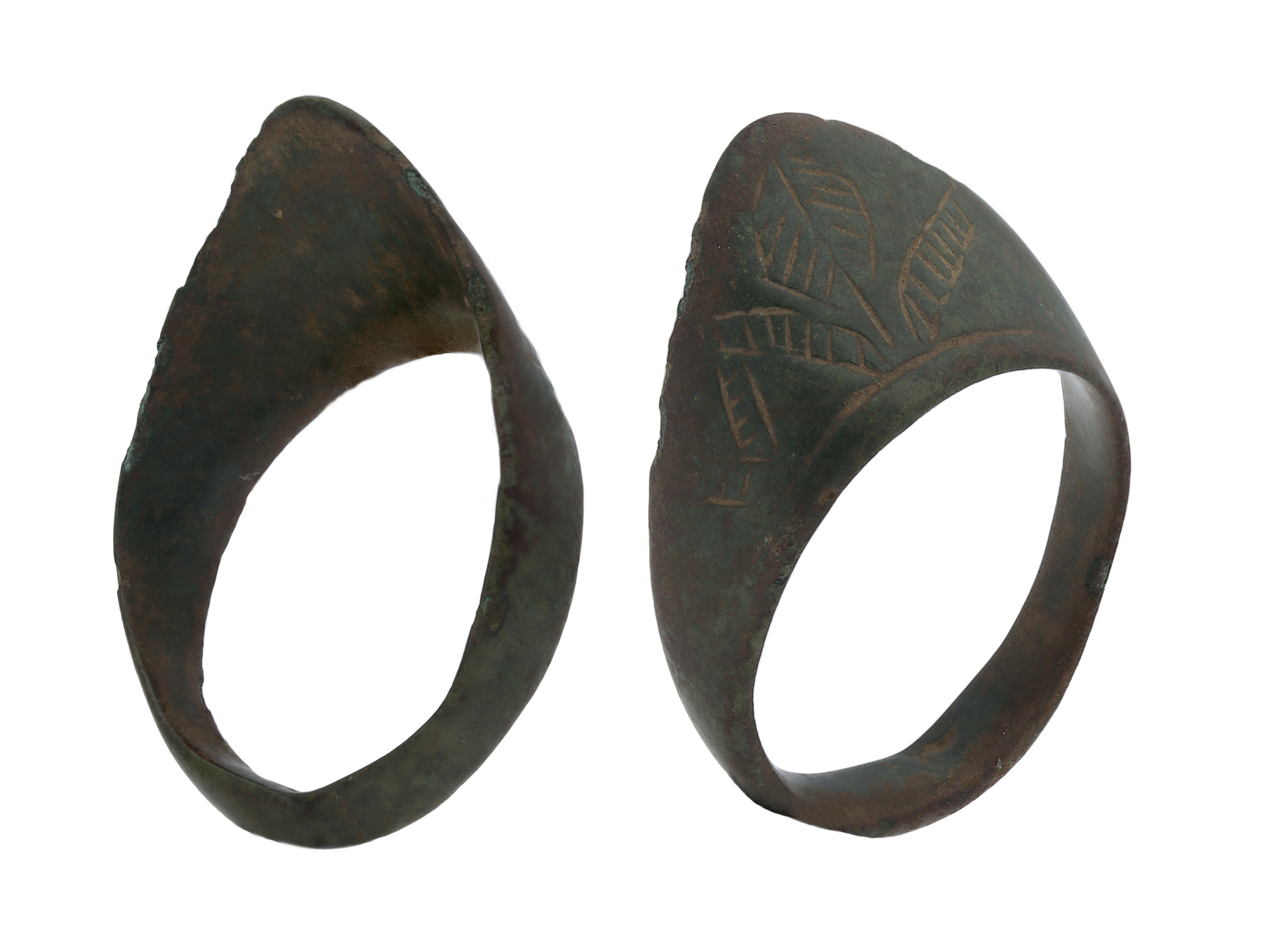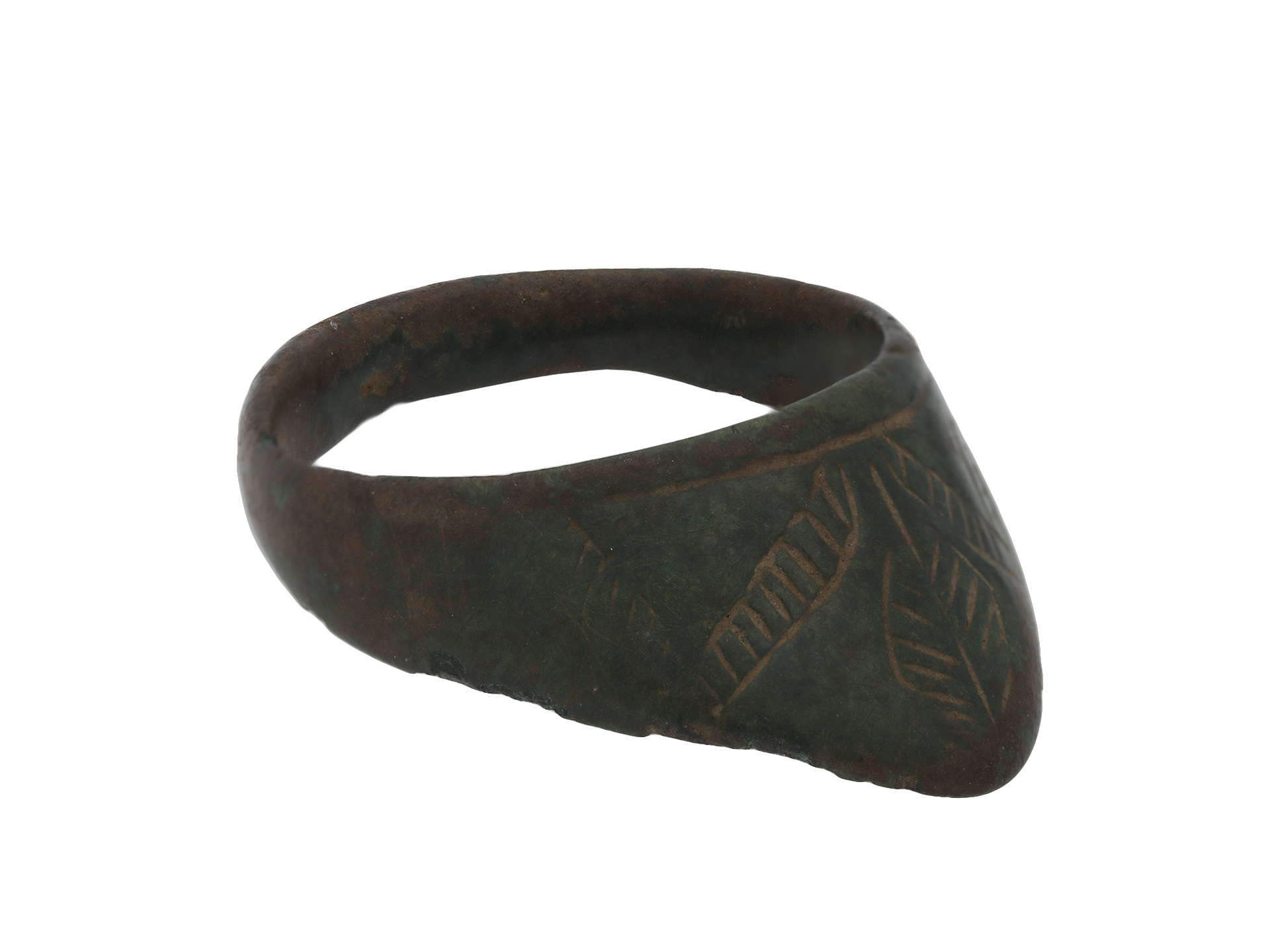 Medieval bronze archers ring. A thumb ring with an angled triangular extension with intricate chevron patterns and foliage designs to conforming D-shape shank. Tested bronze, approximate weight 6.64g, circa 8th - 12th century AD.
