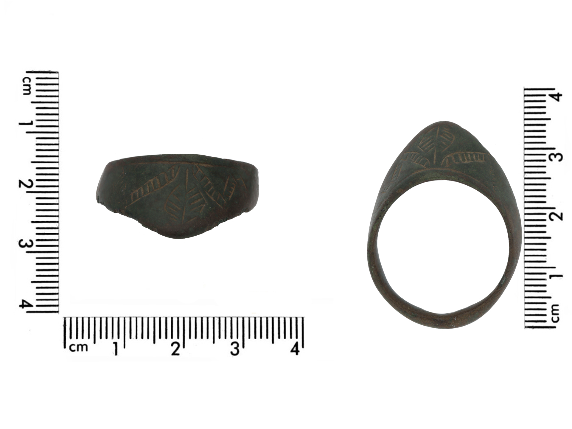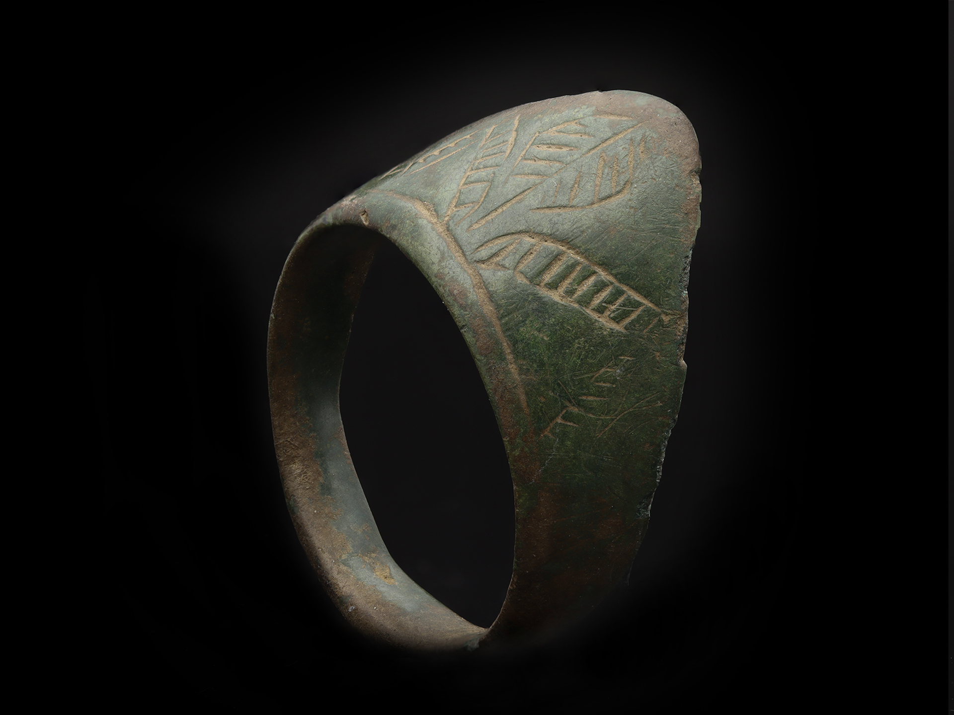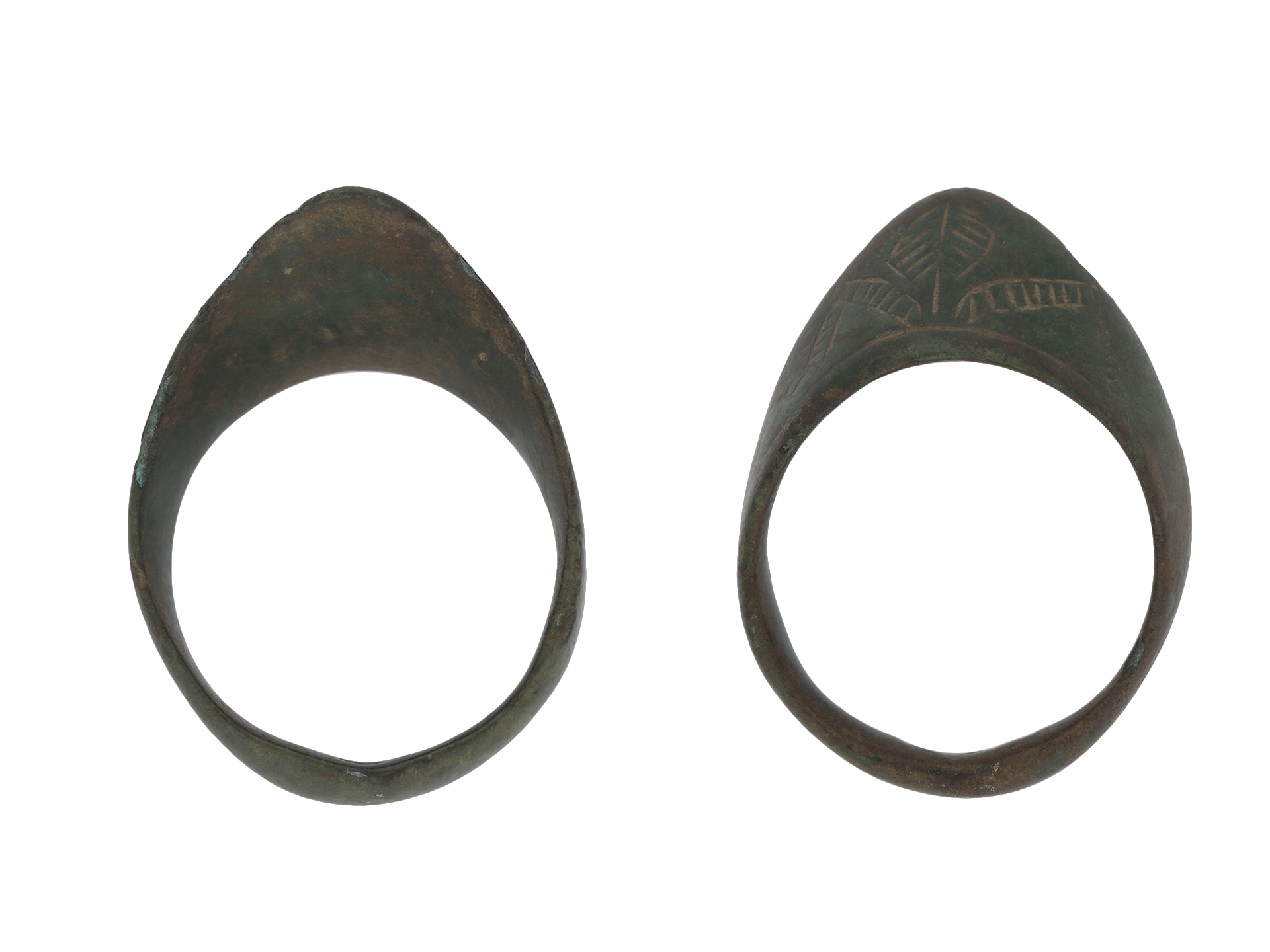 Medieval bronze archers ring. A thumb ring with an angled triangular extension with intricate chevron patterns and foliage designs to conforming D-shape shank. Tested bronze, approximate weight 6.64g, circa 8th - 12th century AD.