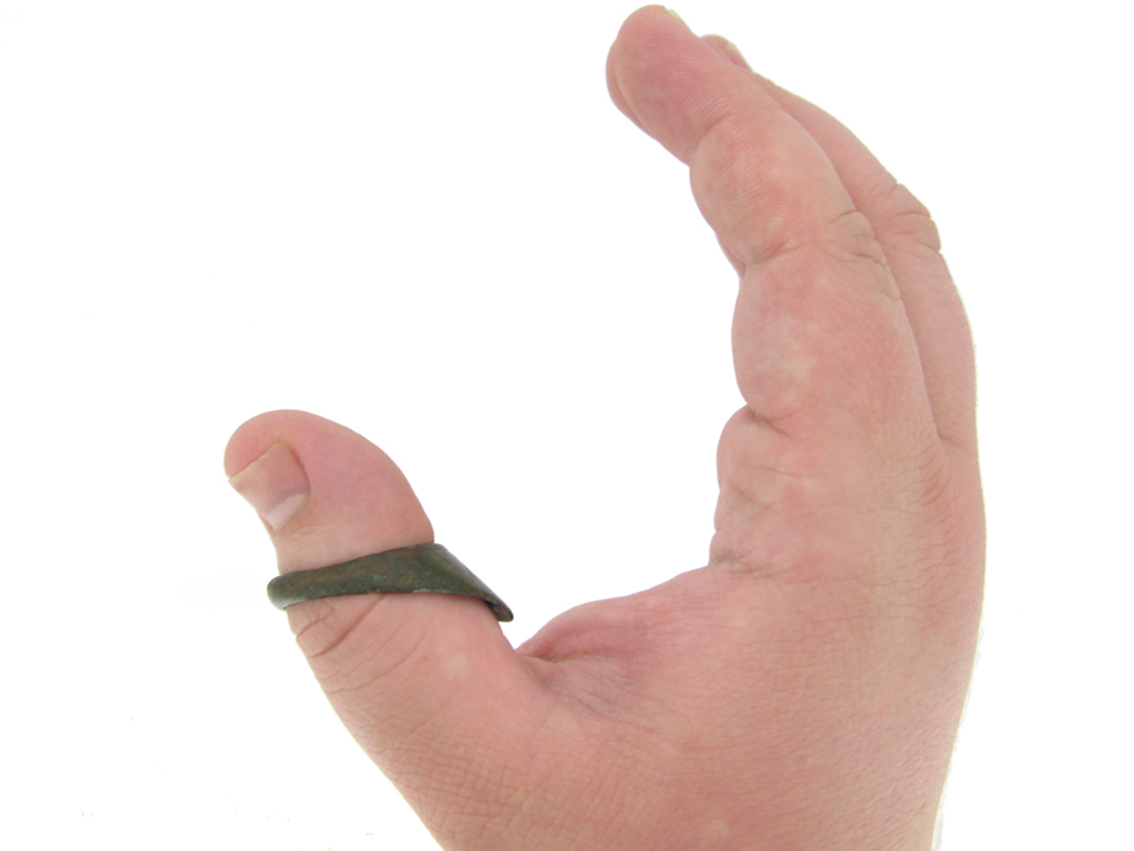 Ancient archers wore these rings on their bow-thumb, to protect it when drawing the bowstring. The bow was drawn by hooking the thumb around the string just under the arrow, and bracing it against the first finger. The ring would protect the thumb and the bowstring would zip right across it upon release.