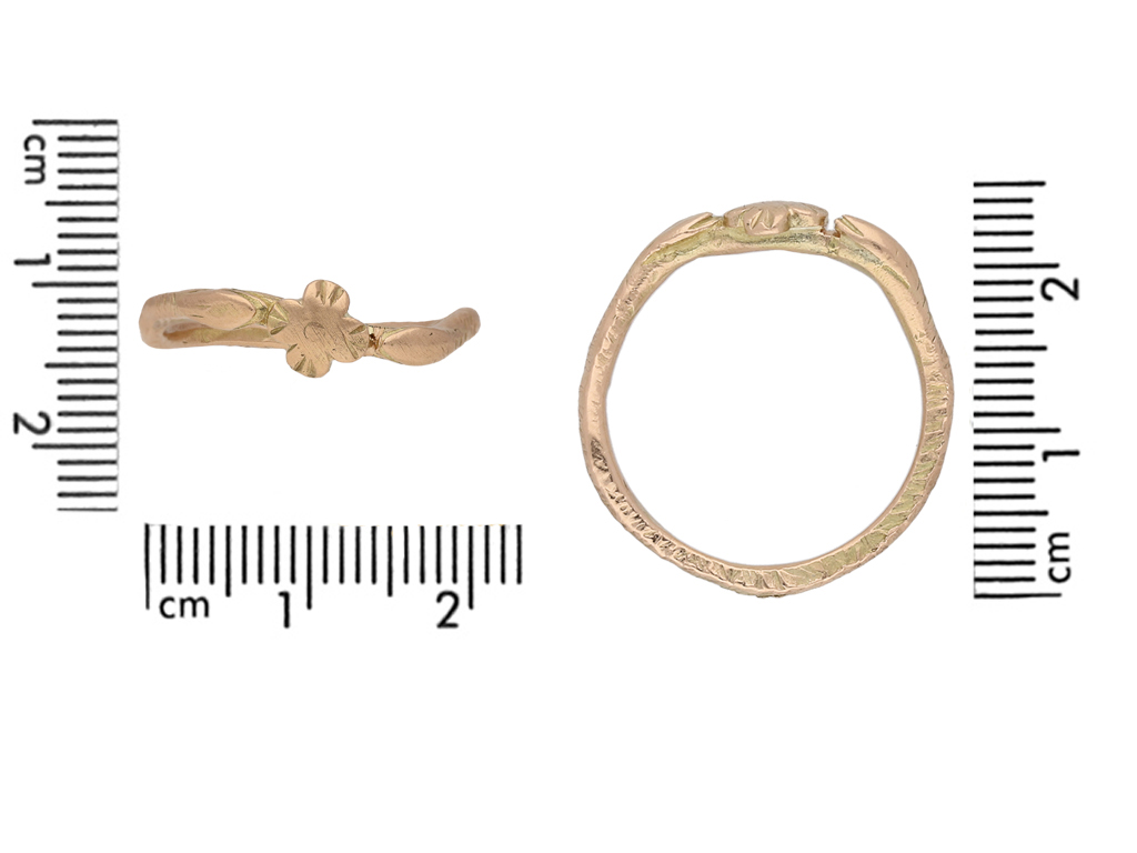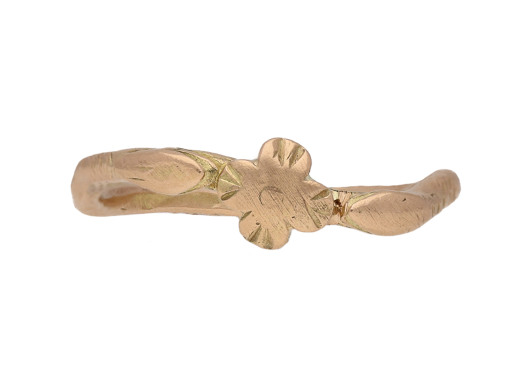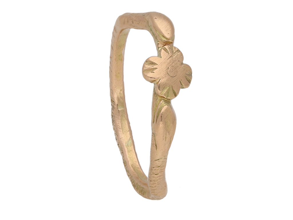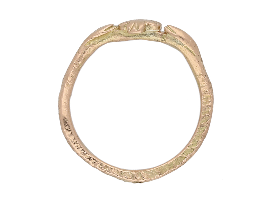 Medieval gold floraform ring. A yellow gold ring, set to centre with a stylised four petal quatrefoil, flanked by raised shoulders adorned with a snakeshead to either side, leading to an undulating shank decorated throughout with a textured design, proceeding to a solid shank. Tested yellow gold, approximately 3.3 grams in weight, circa 15th century.