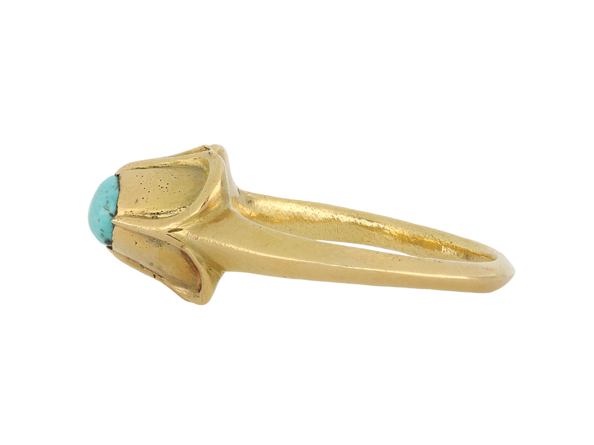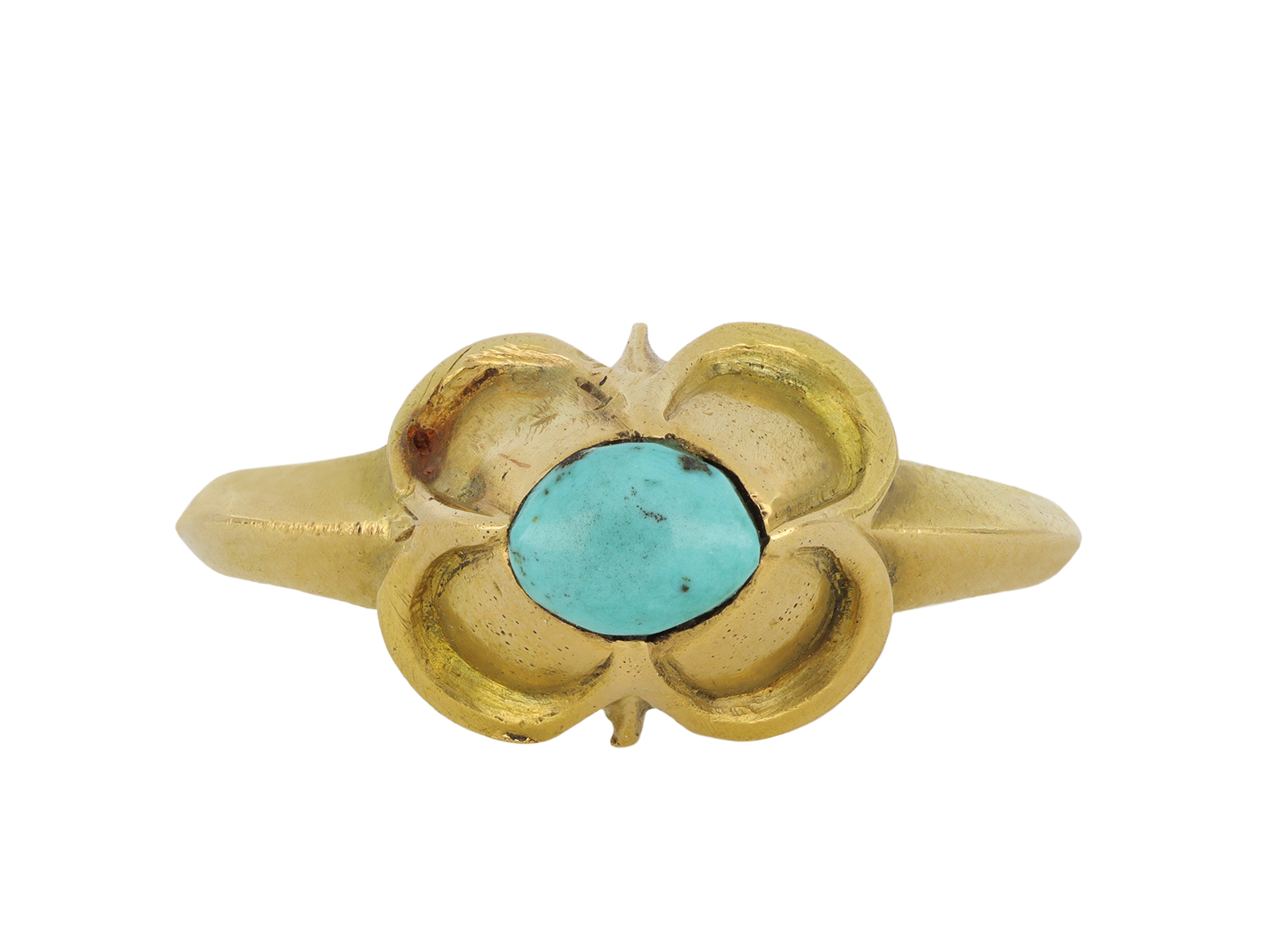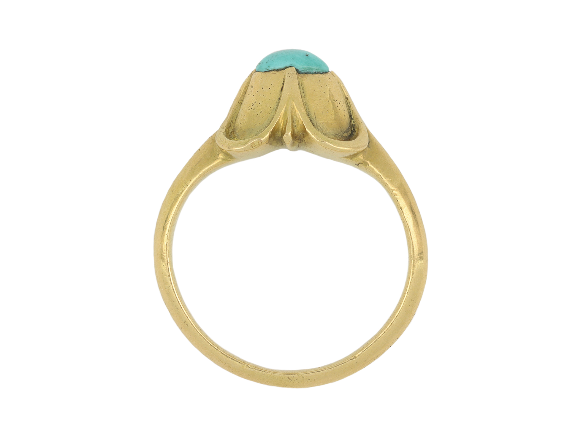 Medieval turquoise stirrup ring. Set with an oval cabochon natural turquoise in a closed back rubover and claw setting, to an impressive stirrup design featuring a raised bezel with a quatrefoil design, a carved gallery and closed backholing, leading to tapering chamfered shoulders and flowing through to a solid shank. Tested yellow gold, circa 15th century.